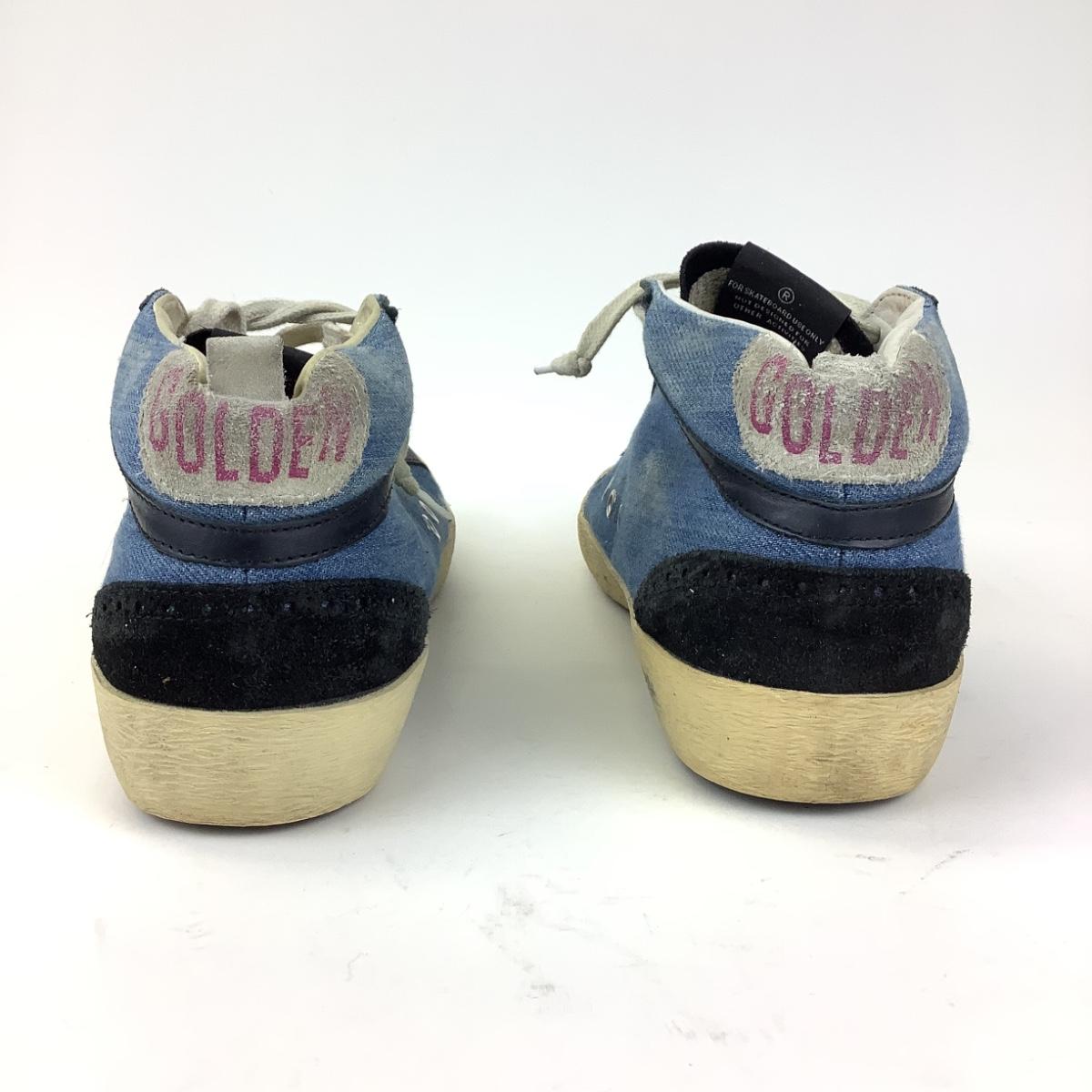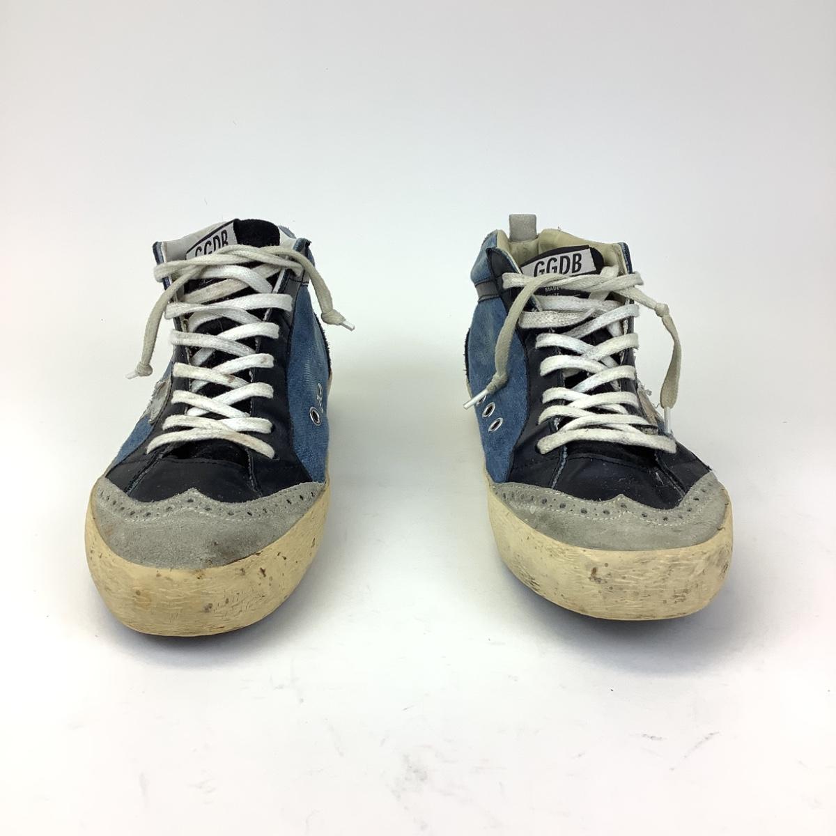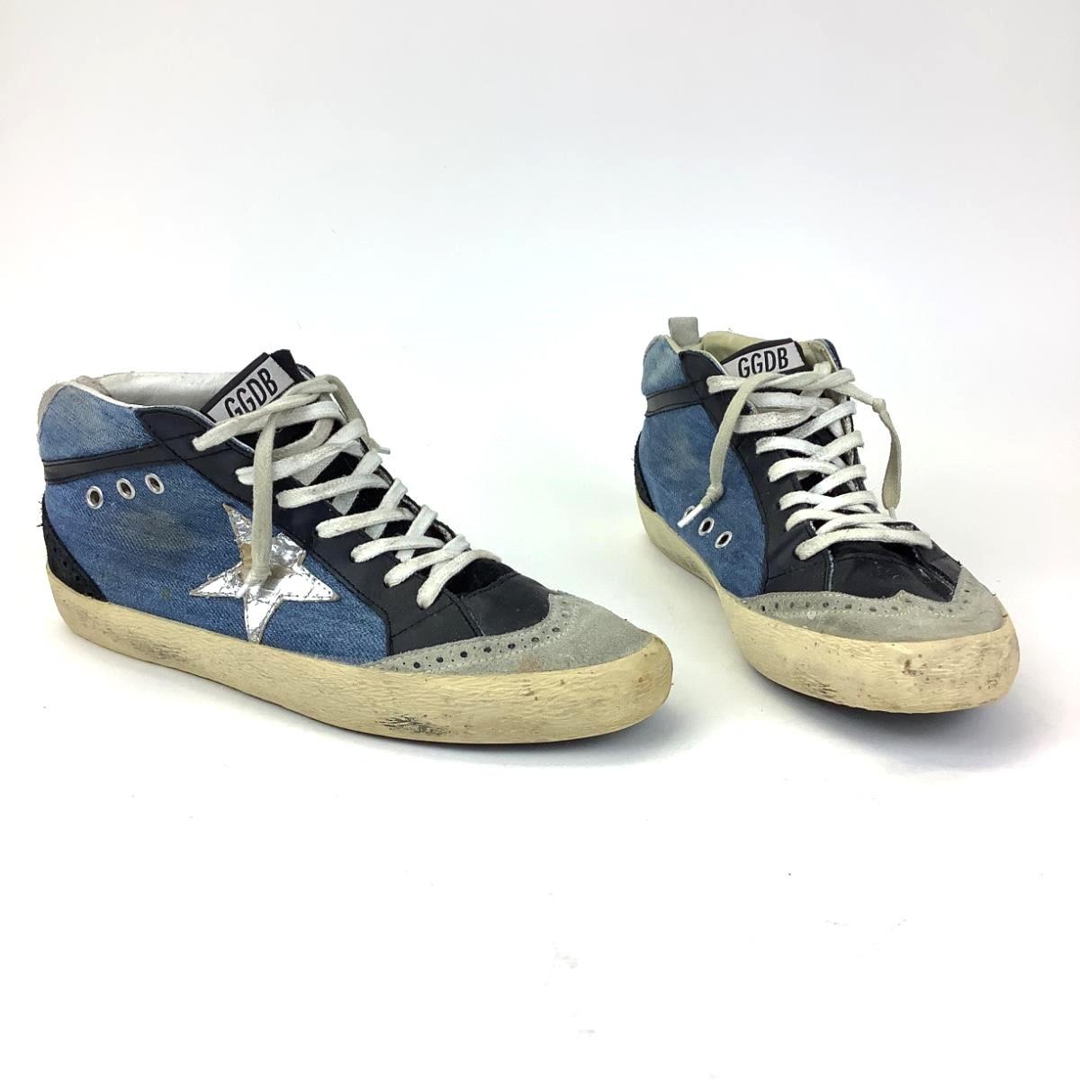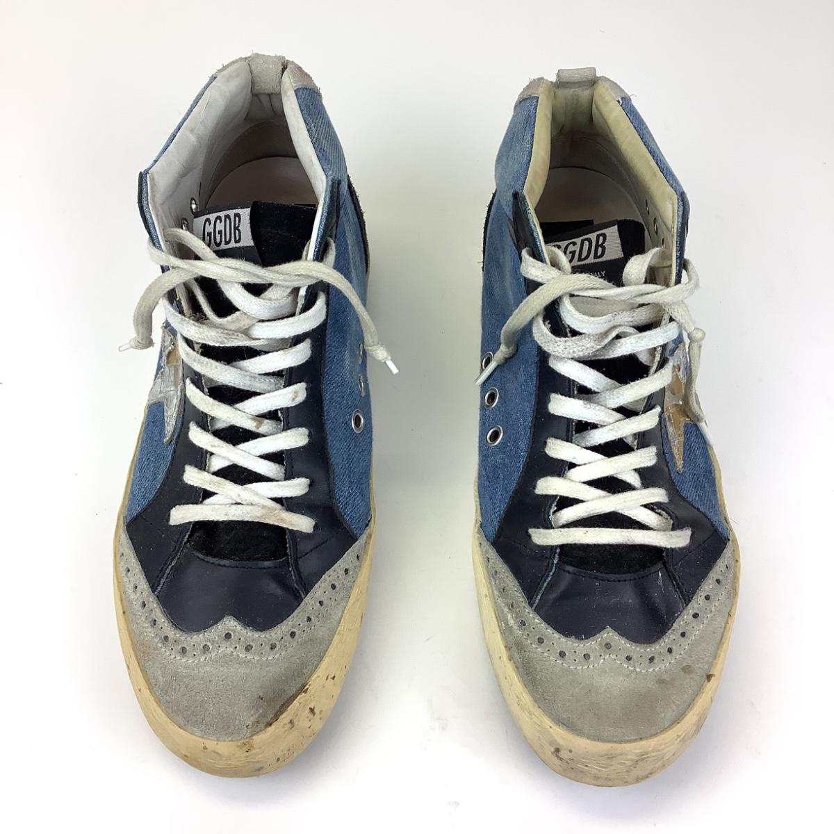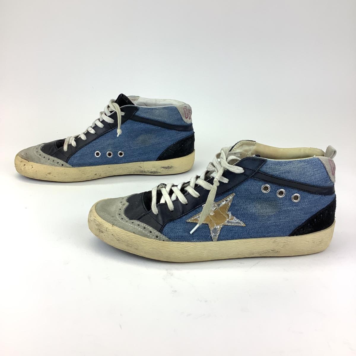 Worn Golden Goose Midstar skateboard intended high-top sneakers with denim, black/gray suede, silvertone logo, made in Venice, Italy.