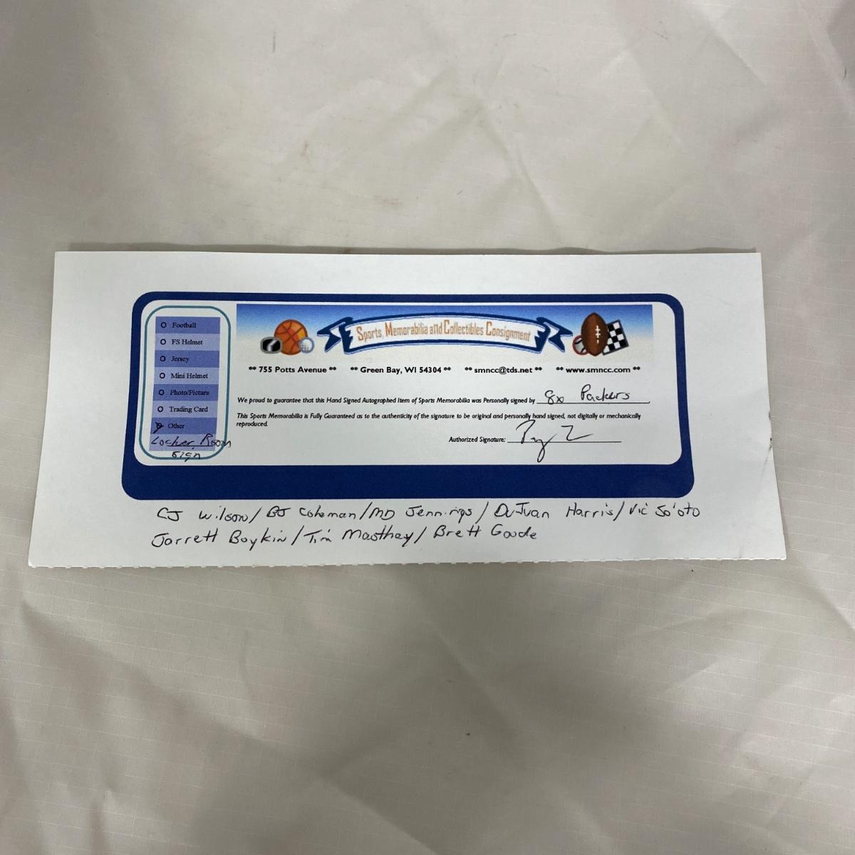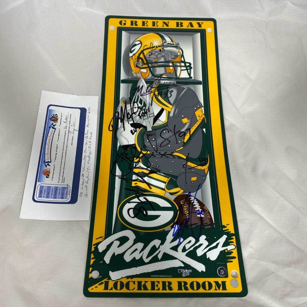 Signed locker room sign with eight packer signatures. Signed with Certificate of Authenticity. 8.5 inches by 19 inches. Please see photos for details and condition. ::: Shipping is available on this lot. If you require shipping you must let us know at the close of the auction. We will coordinate with you after the item has been won. Shipping fees will include insurance up to or exceeding the value of all items being mailed. If you have any questions regarding this lot please contact the auctioneer either via this website, by direct email or by phone. PICK UP TIMES and other important information can be found in the TERMS and DESCRIPTION of the auction. Please take a look for pertinent information. Thanks!