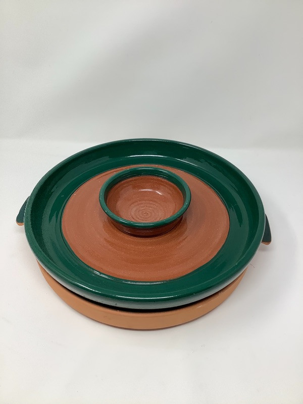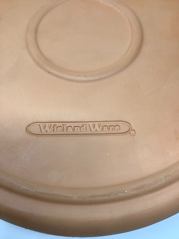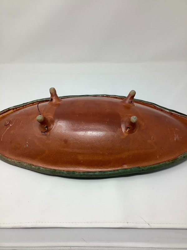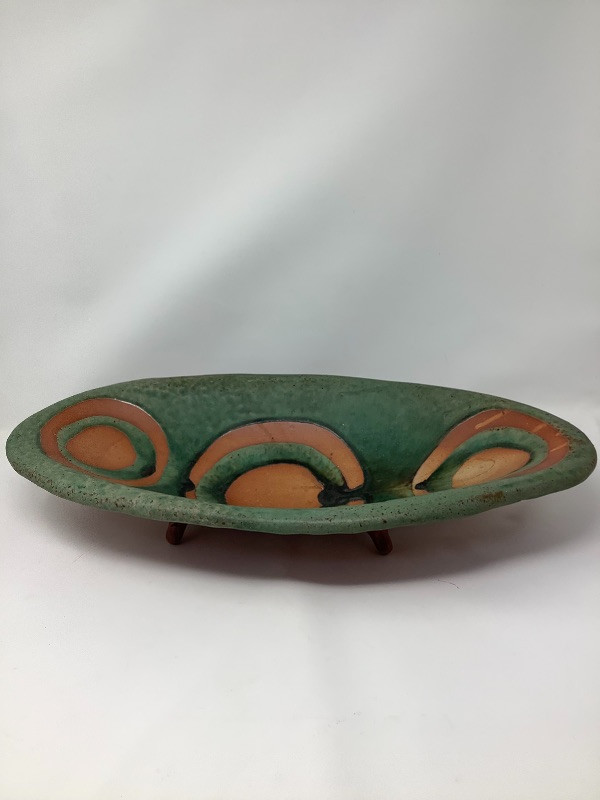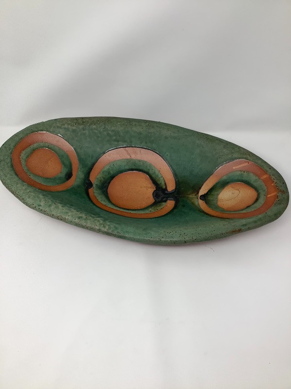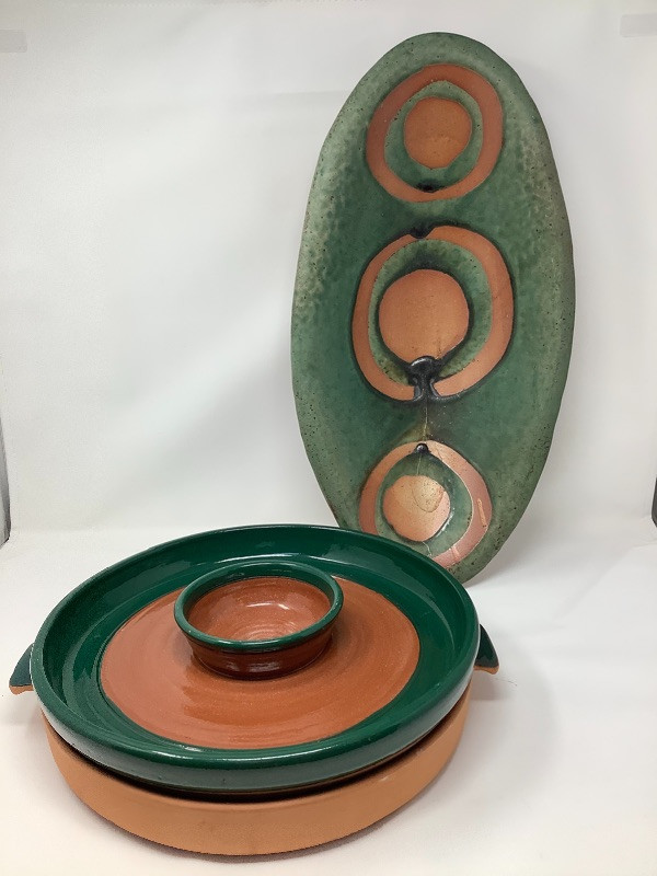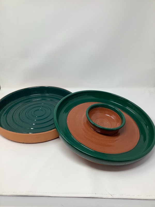 Pottery serving dishes. One measures 21” x 11”. The other measures 13” radius