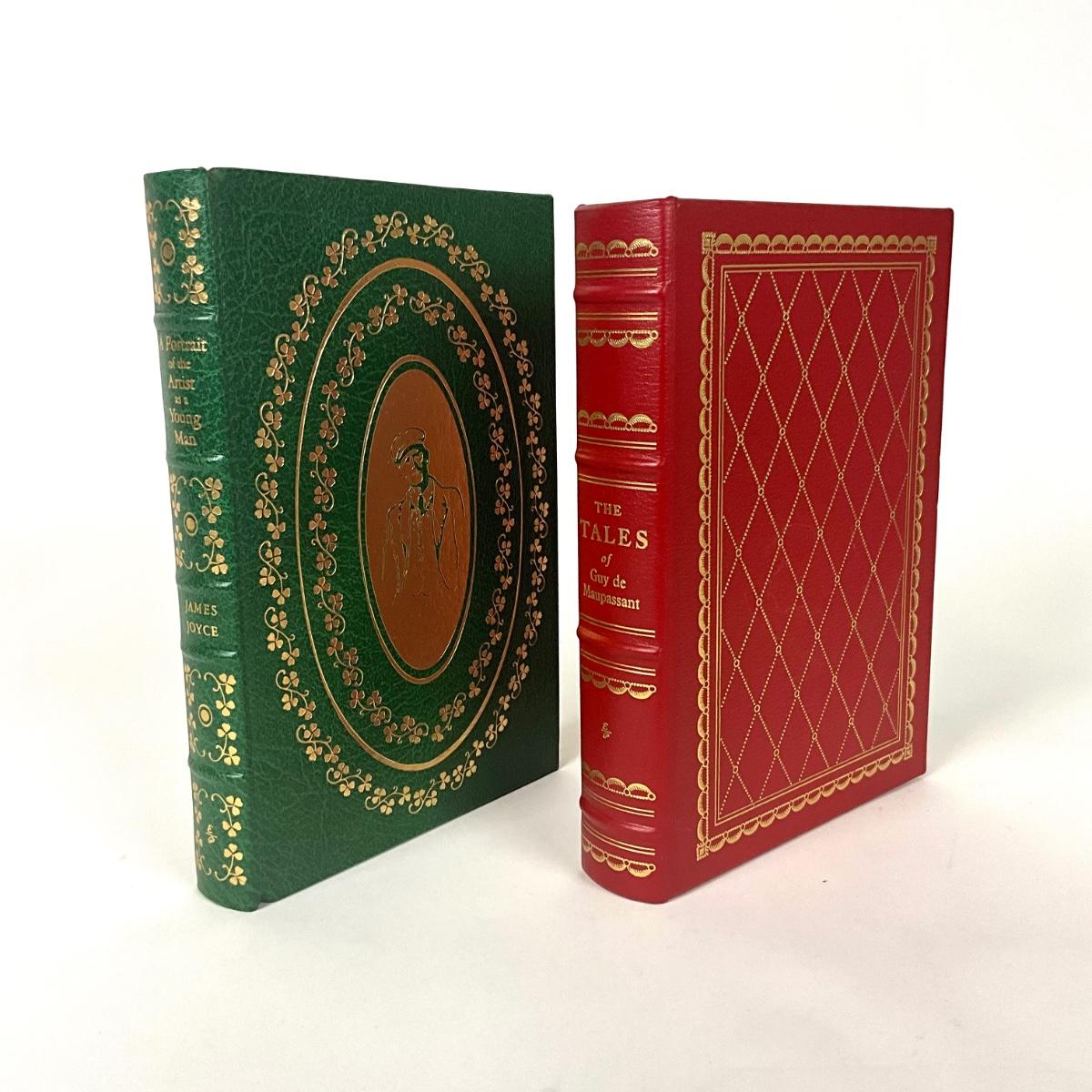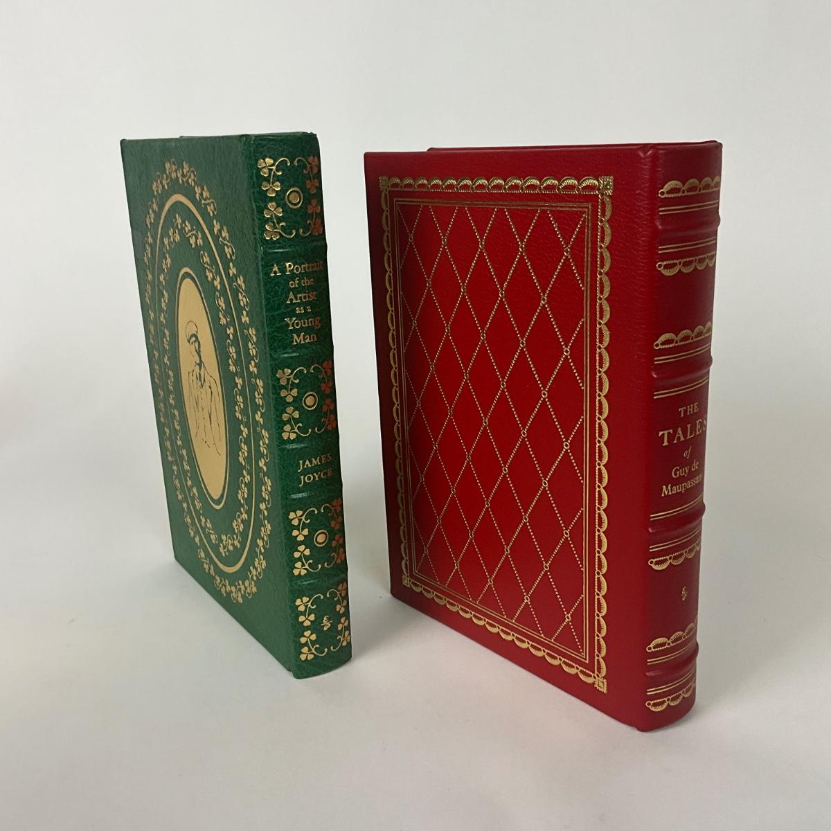 Each book features specially commissioned portraits of Guy De Maupassant & James Joyce respectively. Nicely bound in full genuine leather with gilt lettering decorations on the covers and spine, gilt edges on all sides, raised bands on the spine, a ribbon page marker, and moire fabric end papers.