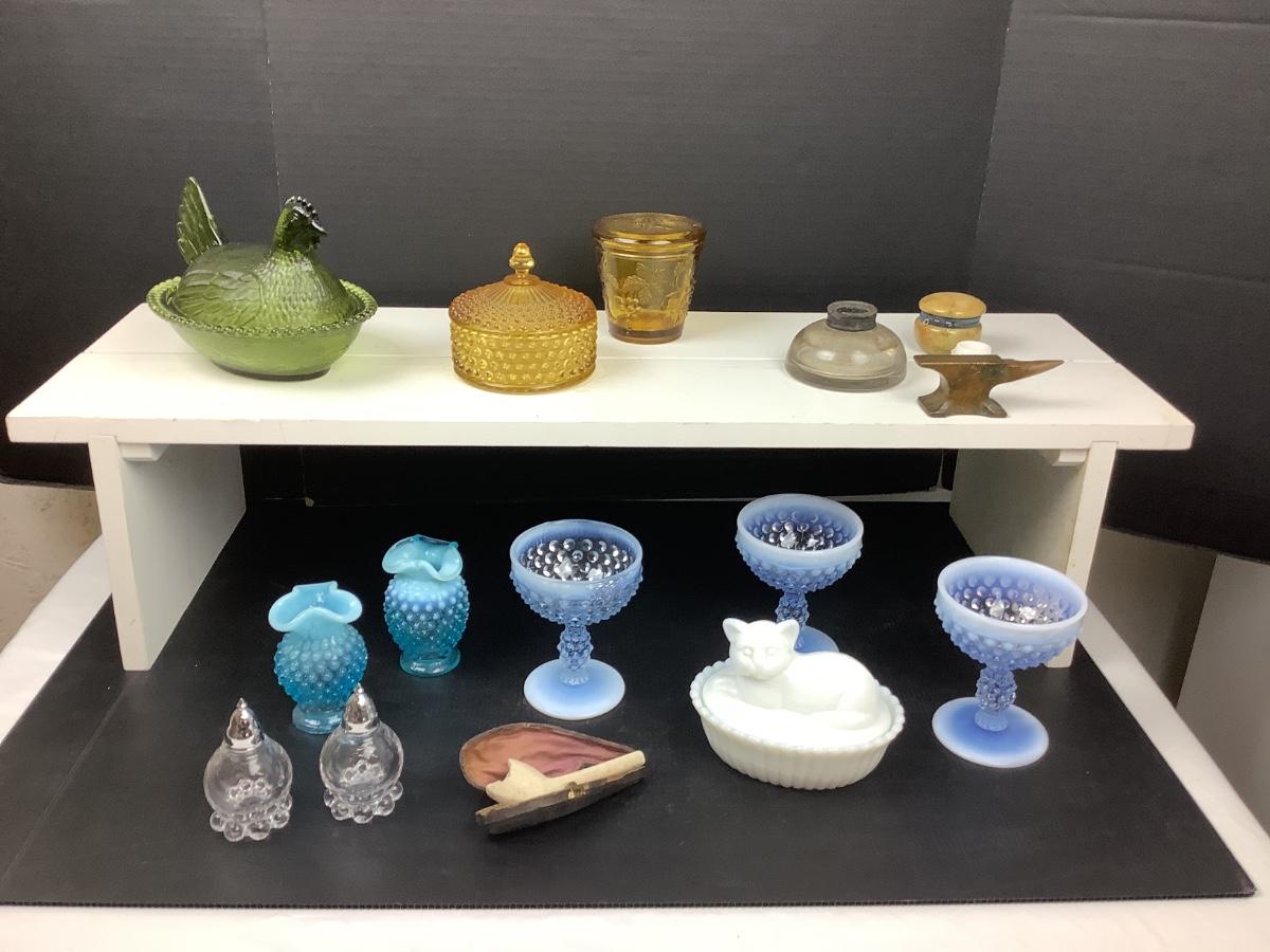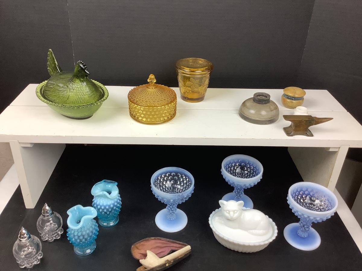 1350 Vintage Hobnail Glassware, Clay Pipe and Mini brass Anvil