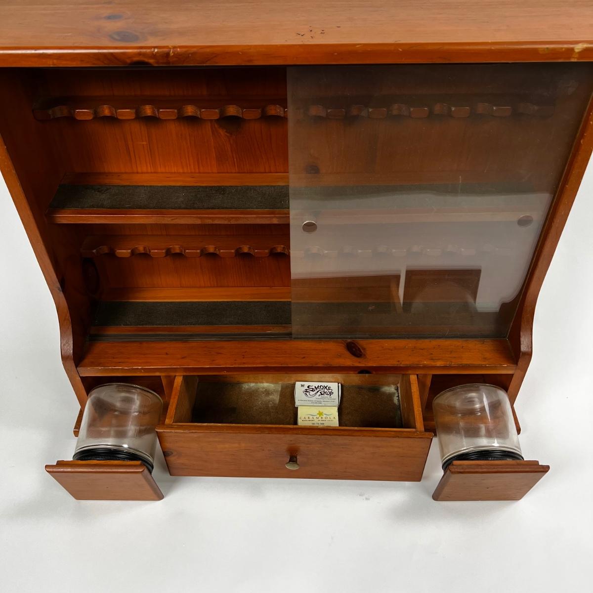 Vintage Cigar Display Pine Cabinet 3 Drawers. Cabinet comes with 2 jar drawers. Wood is cracked on the back of the base.