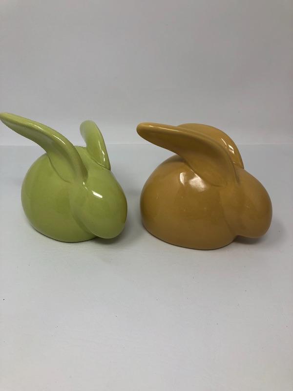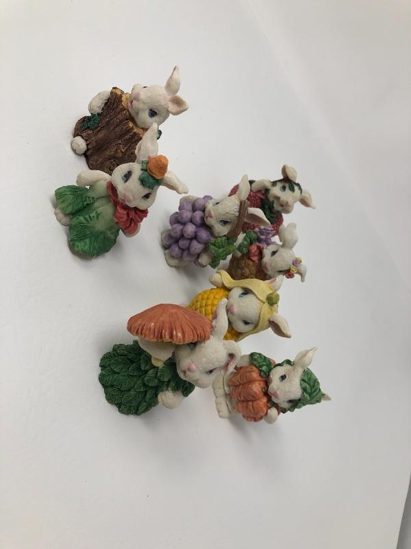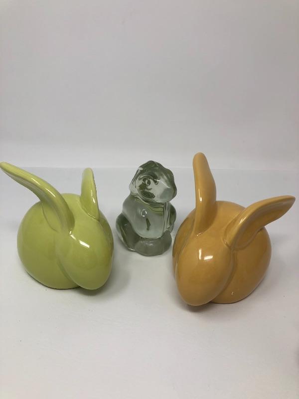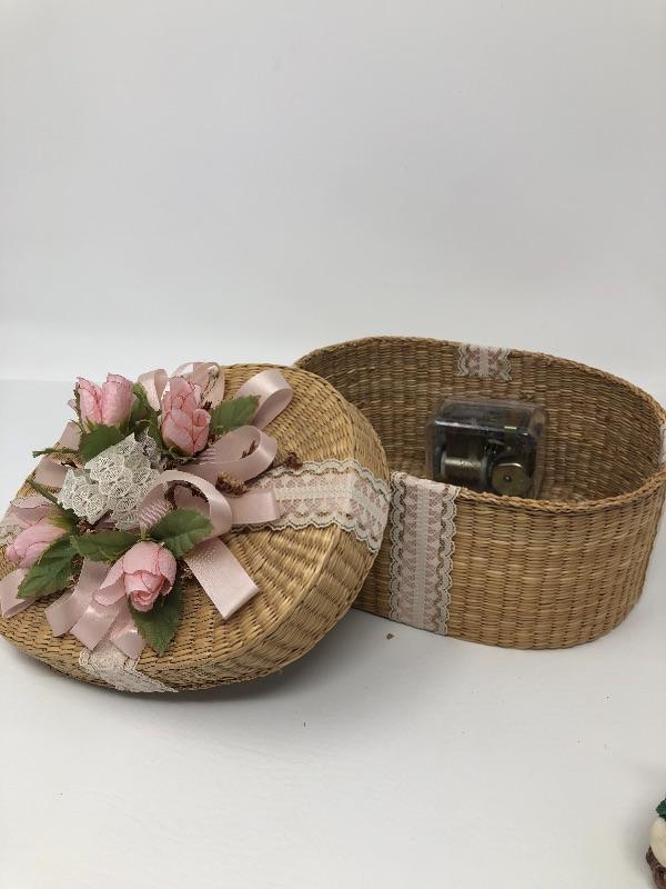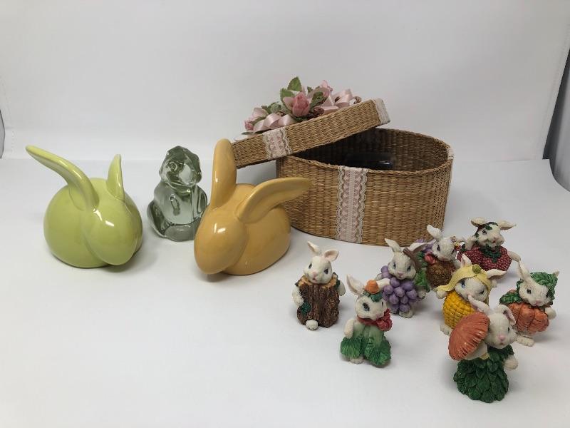 Bunnies and Musical Floral Decorated Basket. Two ceramic bunnies and other collectible bunny figurines.