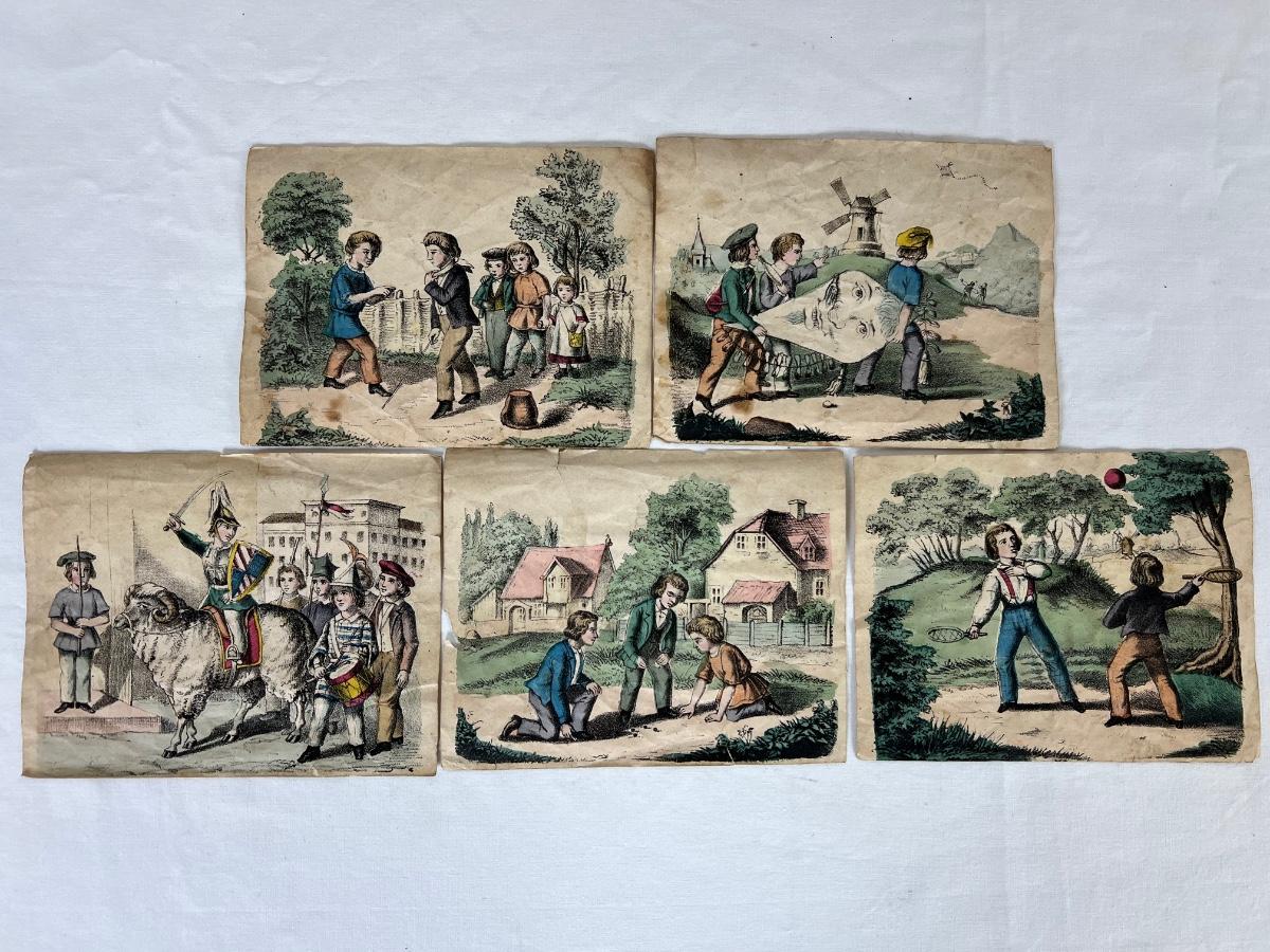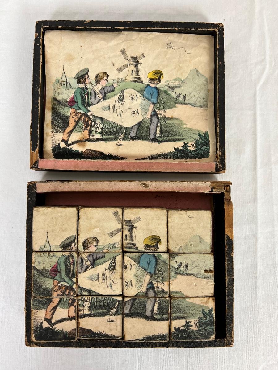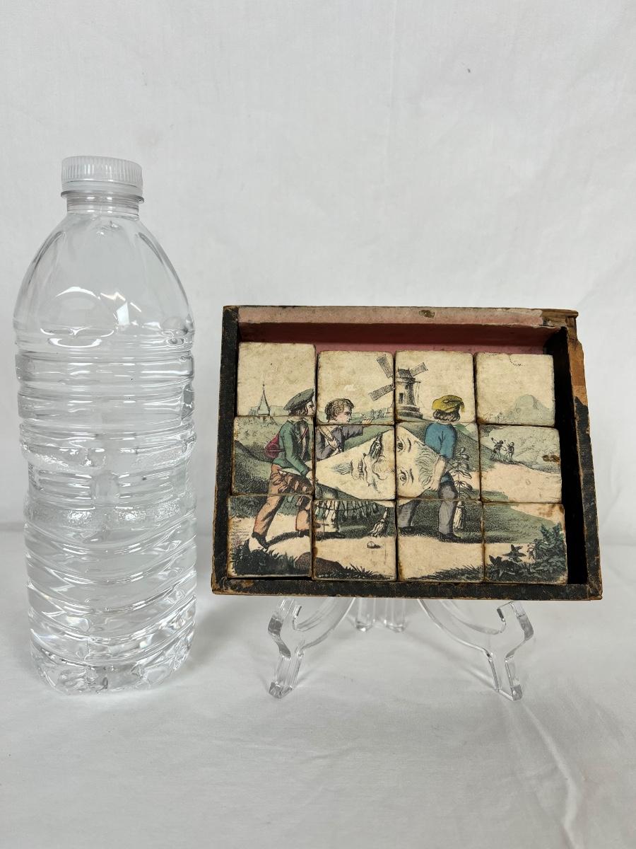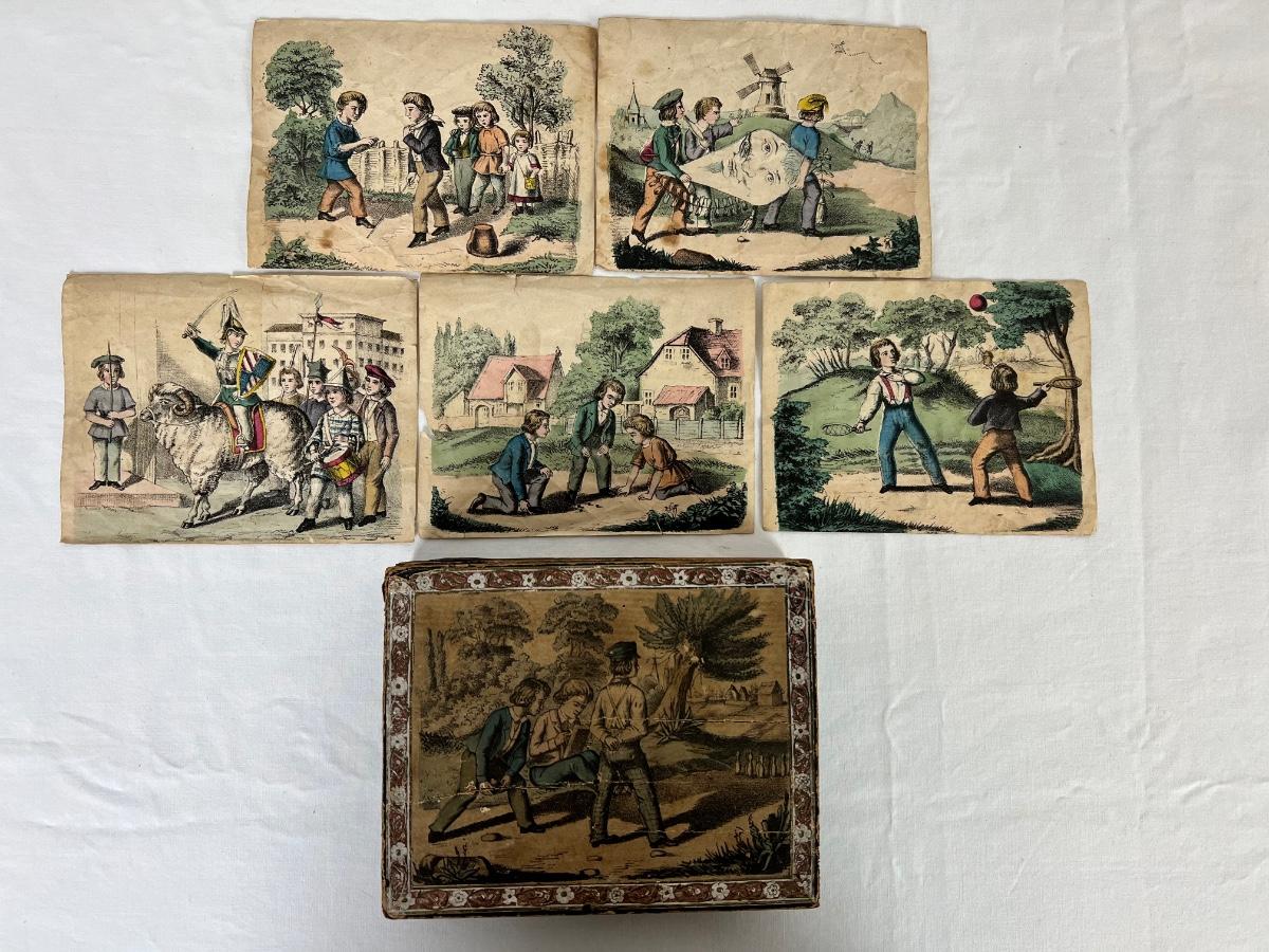 Antique German Toy, Wooden Picture Blocks in Box with 5 picture puzzles.