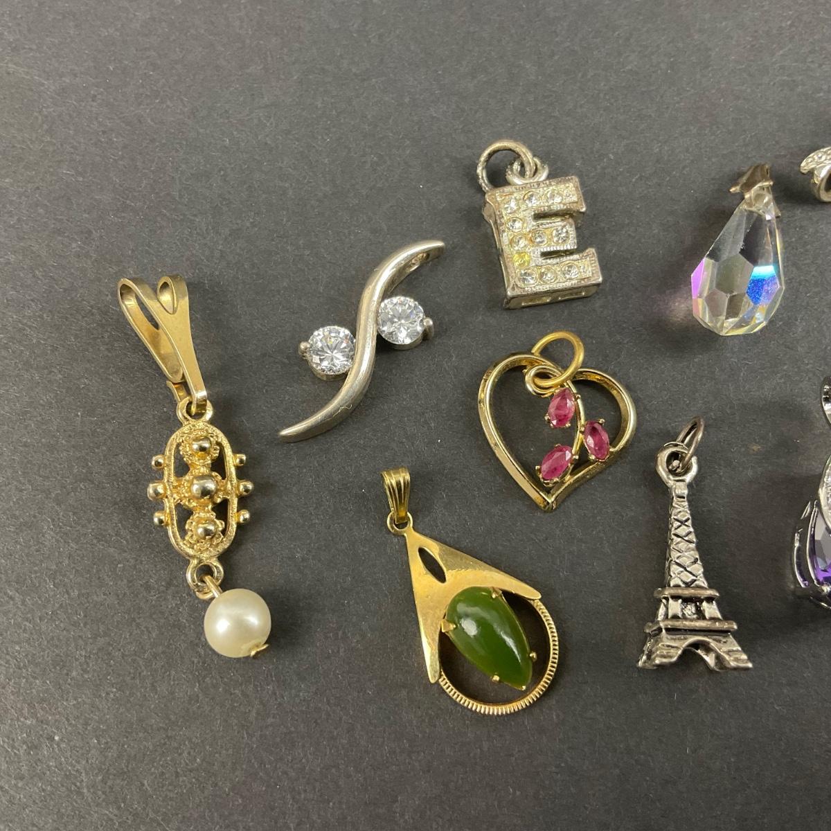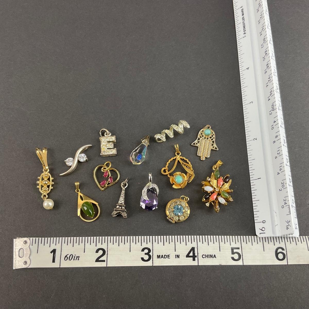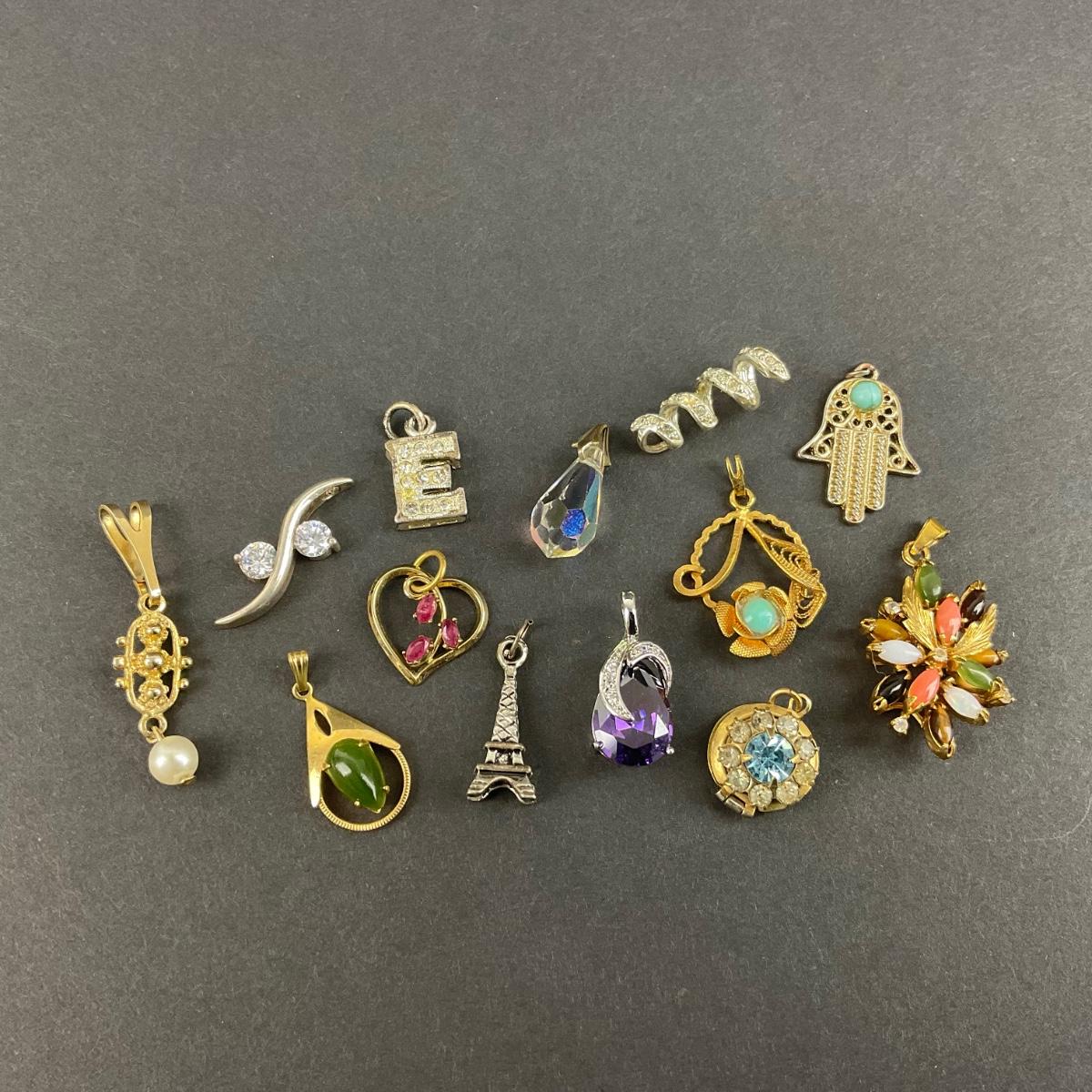 Thirteen assorted miscellaneous charms/pendants. Please see photos for details and condition. Any condition statement is given as a courtesy to a client, is an opinion, and should not be treated as a statement of fact. Reference to condition written, oral or within a condition report shall not be regarded as a full account of condition and may not include all defects, alterations, or restorations. Absence of a condition report does not imply a lot is flawless or lacking imperfections or damage. Katherine’s Auction & Appraisal Service shall have no responsibility for any error or omission. Returns shall not be accepted on the basis of condition. ::: Shipping is available on this lot. If you require shipping you must let us know at the close of the auction. We will coordinate with you after the item has been won. Shipping fees will include insurance up to or exceeding the value of all items being mailed. If you have any questions regarding this lot please contact the auctioneer either via this website, by direct email or by phone. PICK UP TIMES and other important information can be found in the TERMS and DESCRIPTION of the auction. Please take a look for pertinent information. Thanks!