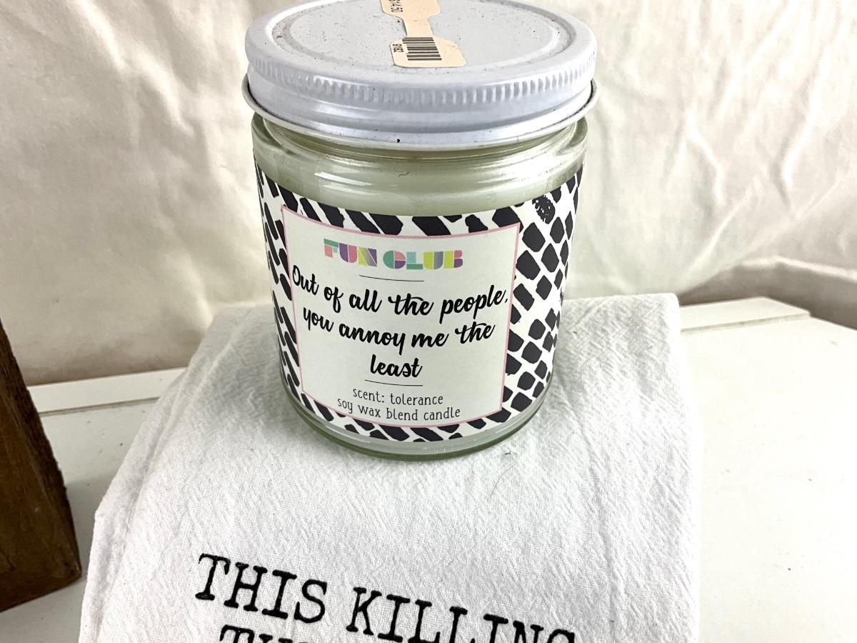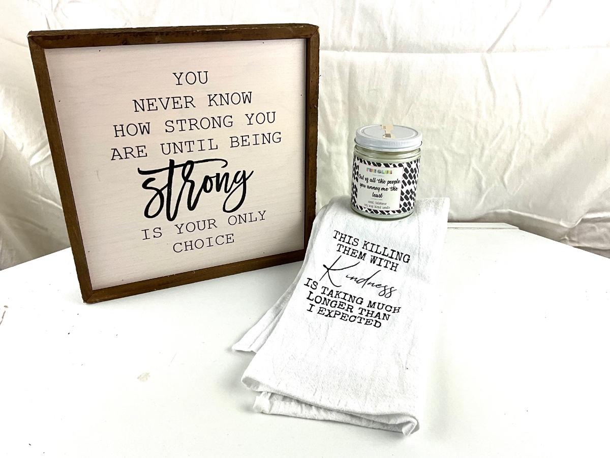 Inspirational sign measures 10" square , cotton hand towel and " out of all the people you annoy me the most" candle