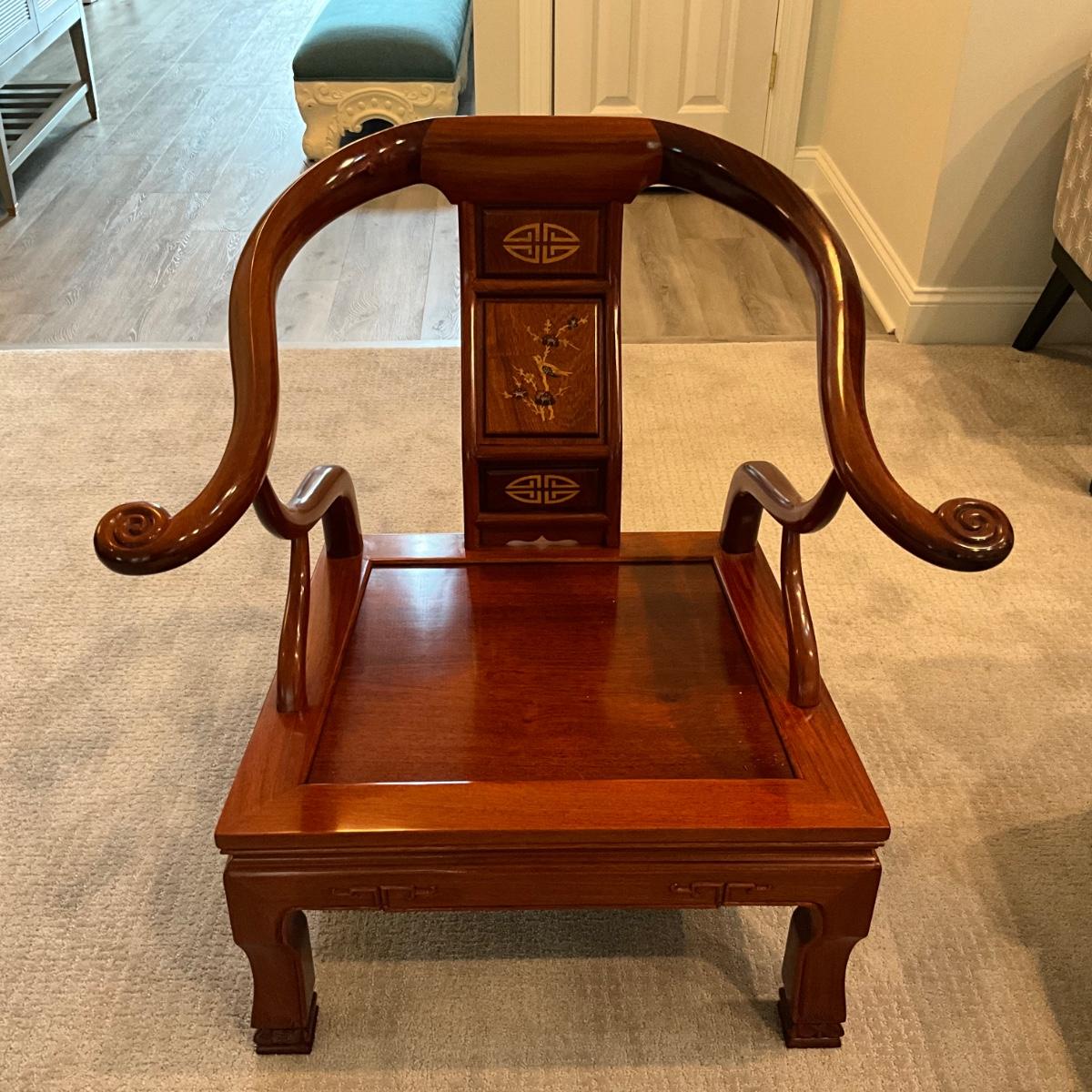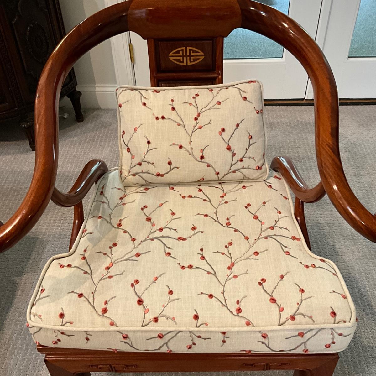 Beautiful Inlay Chinese Rosewood Armchair measuring 21" wide x 28" deep x 31" high x 21" seat depth x 17" seat height with cherry blossom pillow and cushion with extra custom pillow (orange silk blend)