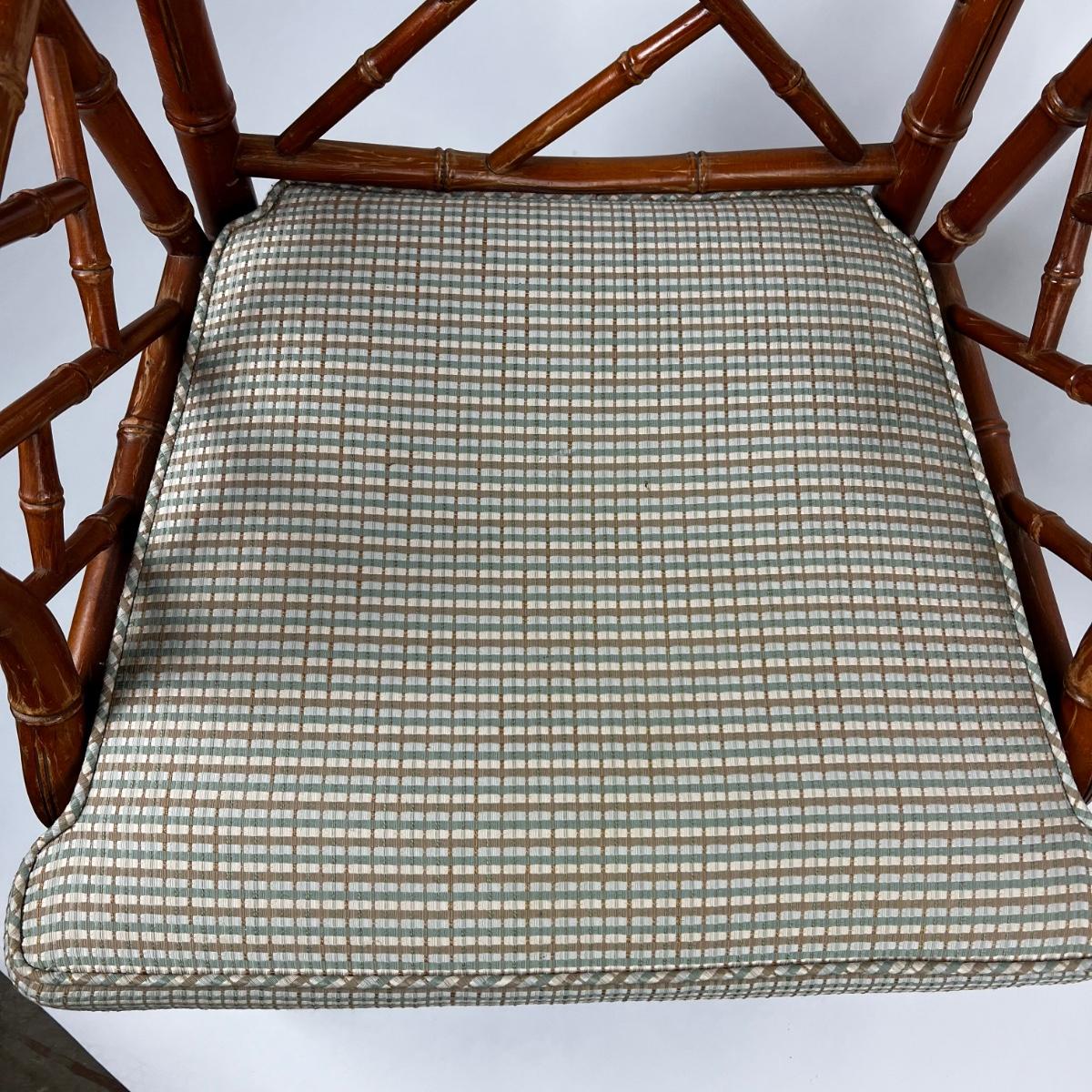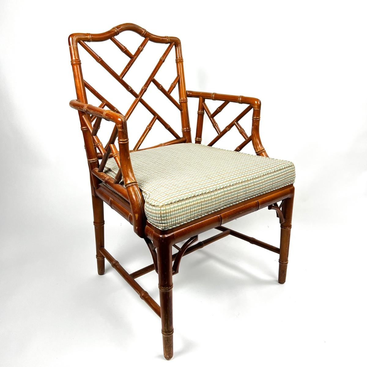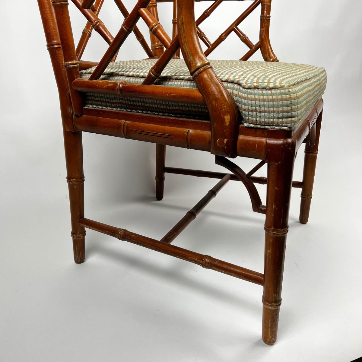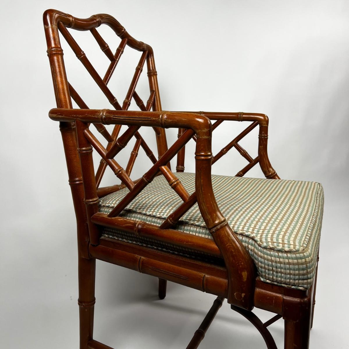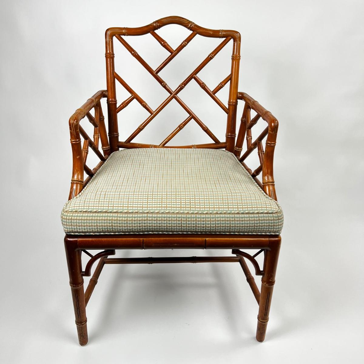 Century Chair Co. Faux Bamboo Chinese Chippendale Arm Chair. Chair has upholstered seat. Lattice back. Tapered legs and stretcher.