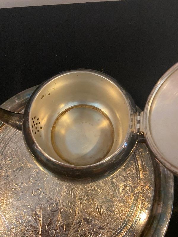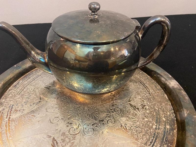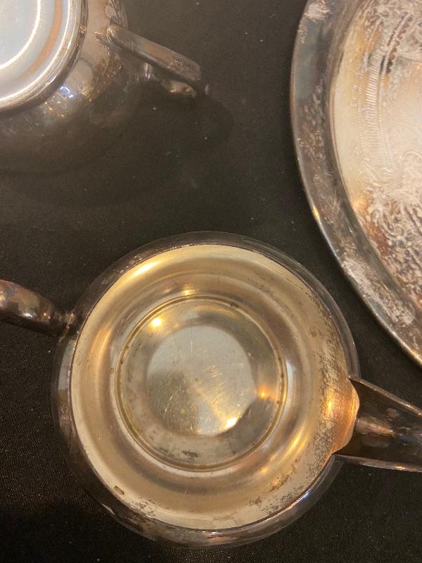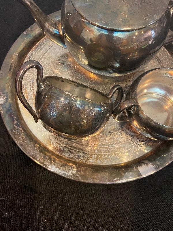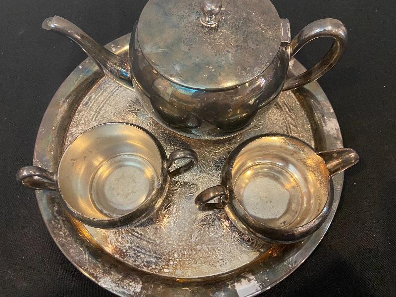 #137 4 pieces of Silver overlay on Copper- tea Pot, tray, sugar and creamer