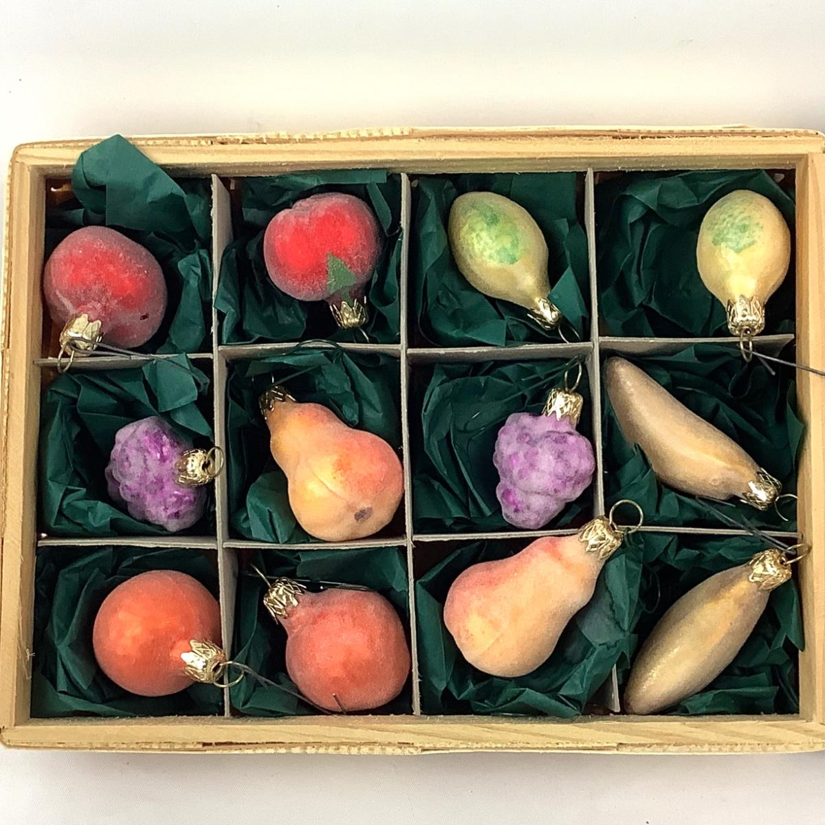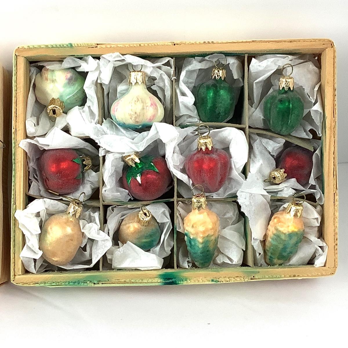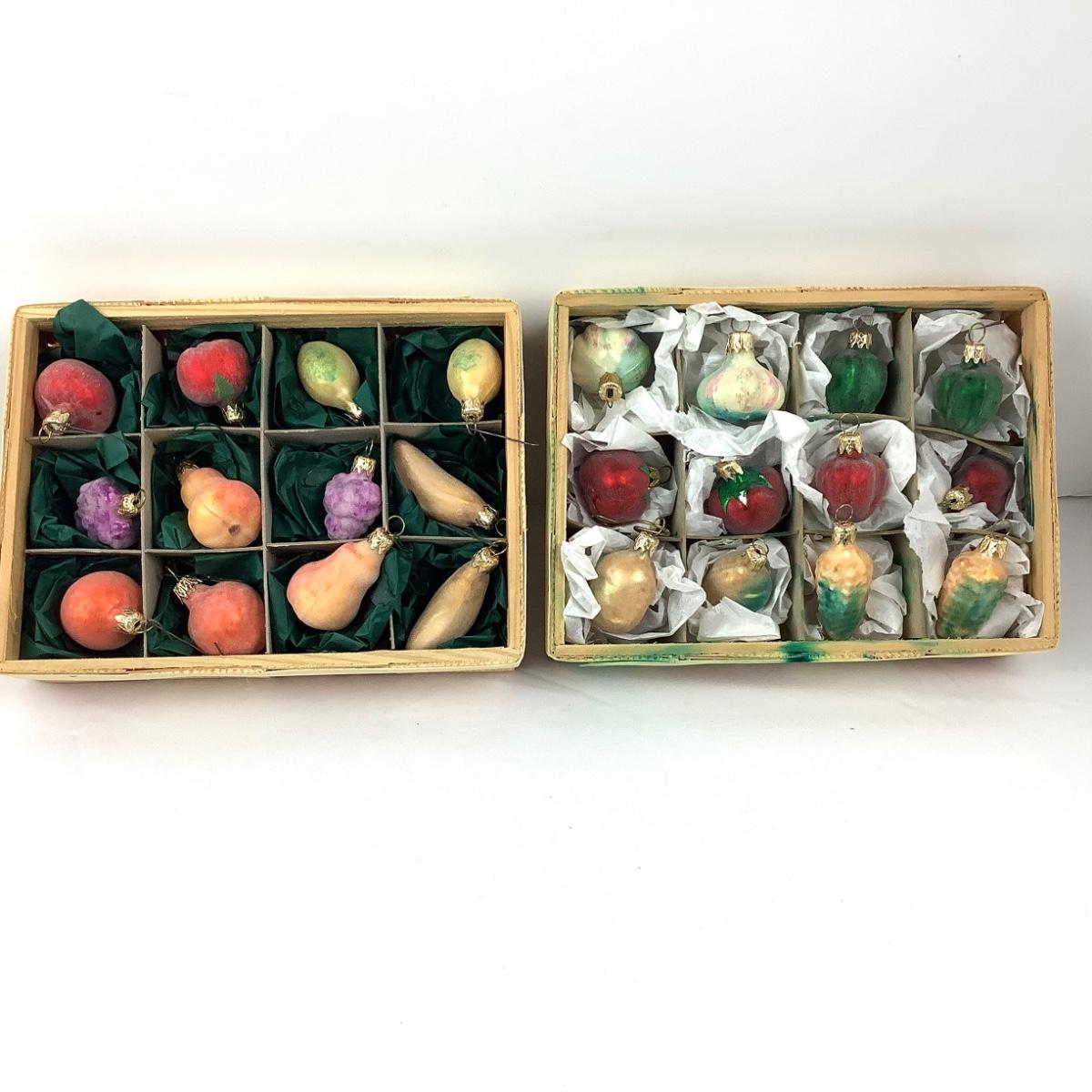 There are 2 different vegetable crate sets, there are 12 ornaments in each box and measure 1"-1.75" and they are glass.