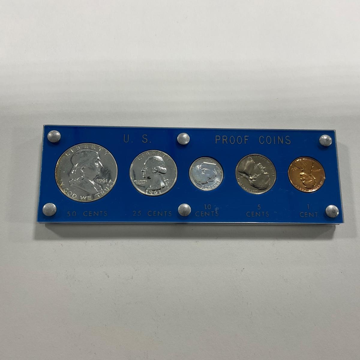1961 Proof set nicely mirrored. Please see photos for details and condition. ::: Shipping is available on this lot. If you require shipping you must let us know at the close of the auction. We will coordinate with you after the item has been won. Shipping fees will include insurance up to or exceeding the value of all items being mailed. If you have any questions regarding this lot please contact the auctioneer either via this website, by direct email or by phone. PICK UP TIMES and other important information can be found in the TERMS and DESCRIPTION of the auction. Please take a look for pertinent information. Thanks!
