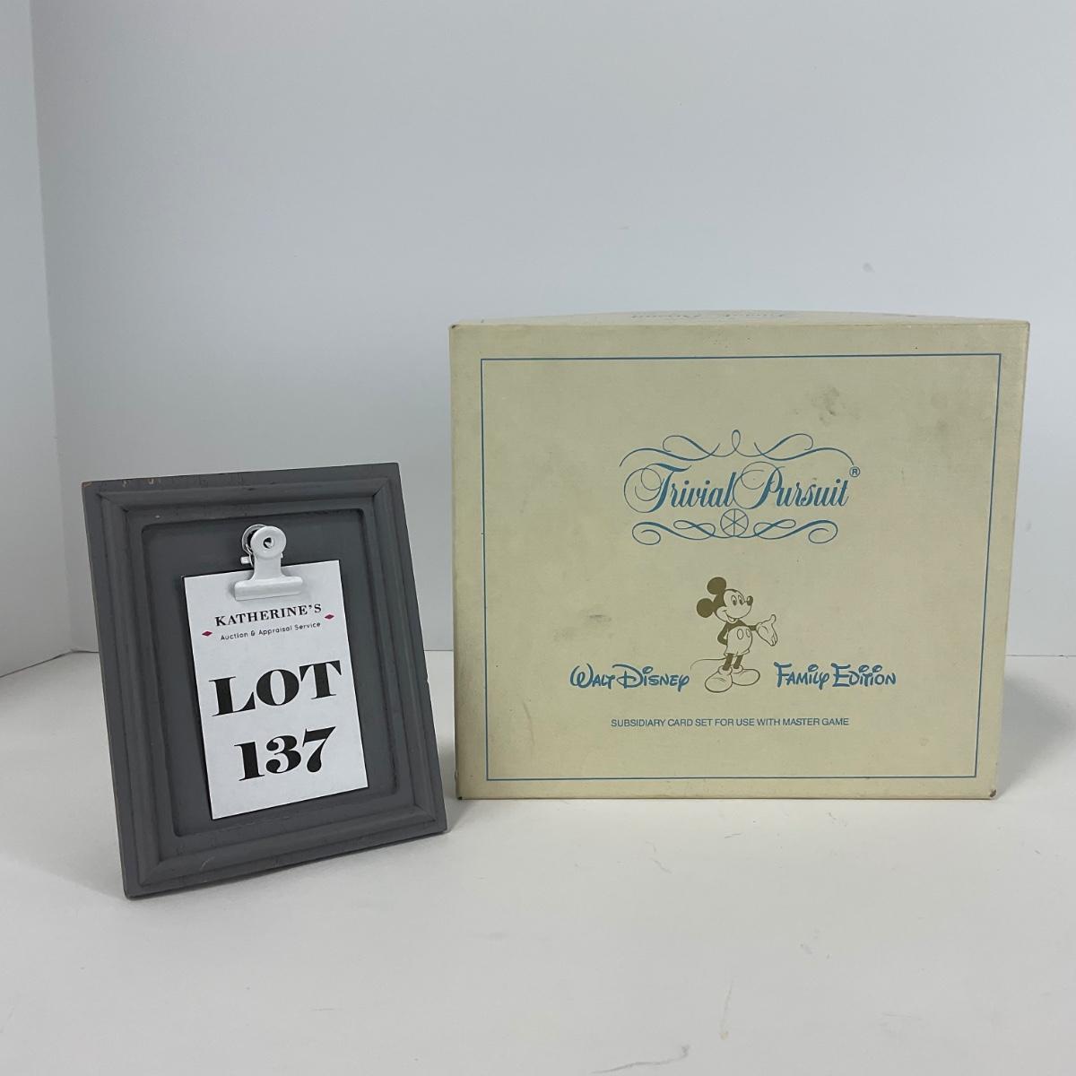 One opened Disney Trivial Pursuit Family edition. This box does have some slight damage. Box is opened and appears to be in complete condition, however not guaranteed. Please see photos for details and condition. Any condition statement is given as a courtesy to a client, is an opinion, and should not be treated as a statement of fact. Reference to condition written, oral or within a condition report shall not be regarded as a full account of condition and may not include all defects, alterations, or restorations. Absence of a condition report does not imply a lot is flawless or lacking imperfections or damage. Katherine’s Auction & Appraisal Service shall have no responsibility for any error or omission. Returns shall not be accepted on the basis of condition. ::: Shipping is available on this lot. If you require shipping you must let us know at the close of the auction. We will coordinate with you after the item has been won. Shipping fees will include insurance up to or exceeding the value of all items being mailed. If you have any questions regarding this lot please contact the auctioneer either via this website, by direct email or by phone. PICK UP TIMES and other important information can be found in the TERMS and DESCRIPTION of the auction. Please take a look for pertinent information. Thanks!