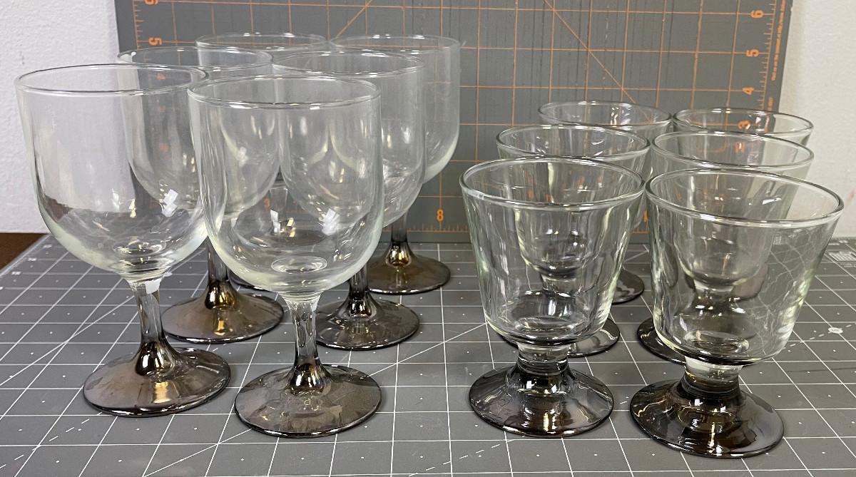 #137 Set of 12 Bar Glasses. Smoked Mirrored Base Circa 1970's