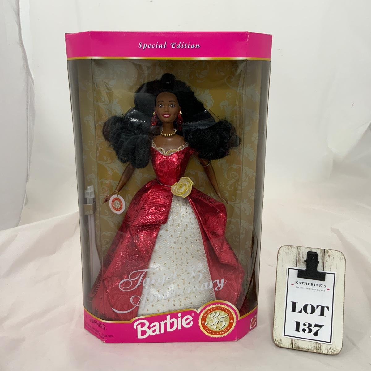 Stunning Target 35th Anniversary Barbie. Produced by Mattel for exclusive release inside Target stores. Isn’t it funny that the exterior of that updated Target has already changed? They reinvent themselves almost as often as Barbie herself! Doll is new in package. Please see photos for details and condition. !!! Proceeds from this auction will be donated to the NEW COMMUNITY SHELTER in Green Bay, Wisconsin. Please see Sale Description to the Left for more information. !!! ::: Shipping is available on this lot. If you require shipping you must let us know at the close of the auction. We will coordinate with you after the item has been won. Shipping fees will include insurance up to or exceeding the value of all items being mailed. If you have any questions regarding this lot please contact the auctioneer either via this website, by direct email or by phone. PICK UP TIMES and other important information can be found in the TERMS and DESCRIPTION of the auction. Please take a look for pertinent information. Thanks!