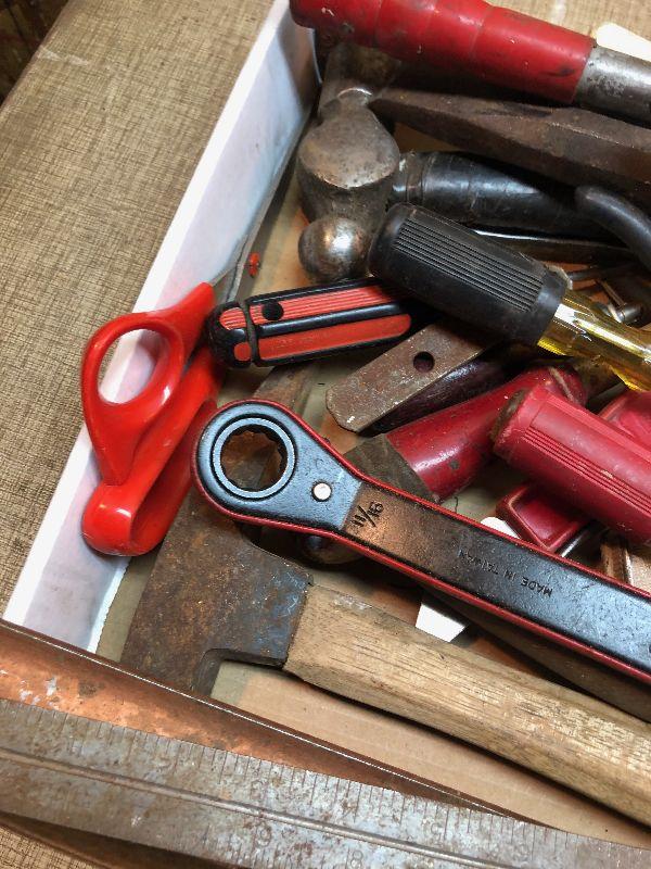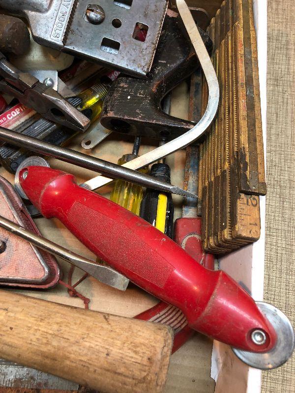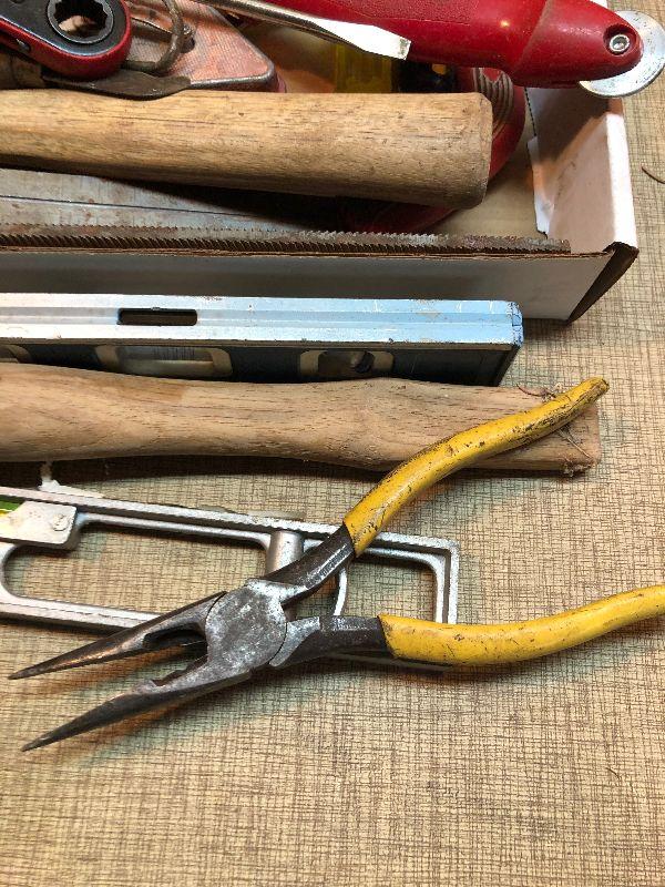 #1371G Tray of Tools: Pliers, Chalk Line, Saw