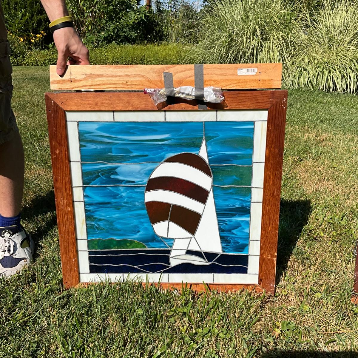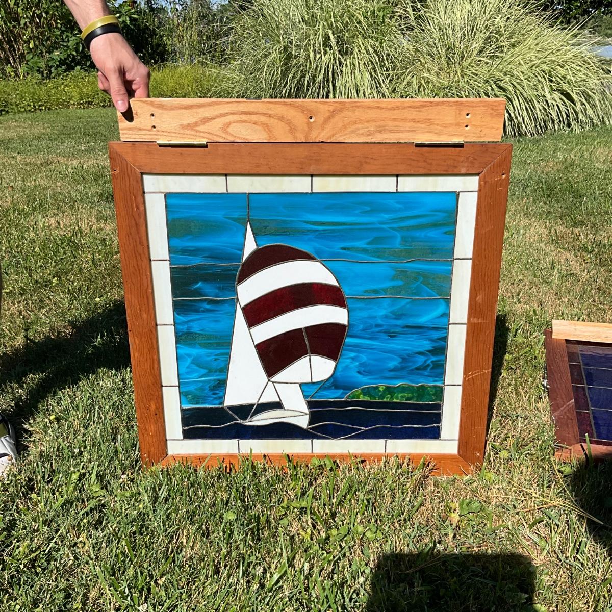 1372 Vintage Stained Glass Sailboat Window from "The Masthead" in Oxford, MD.