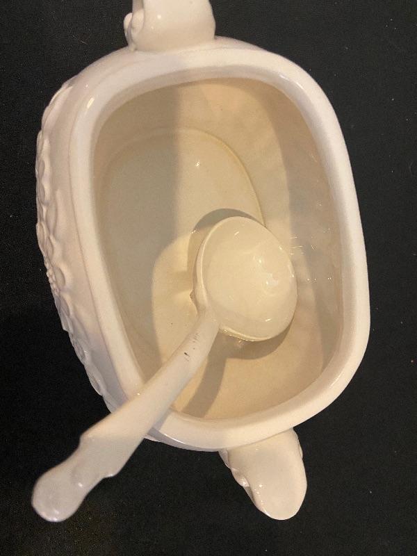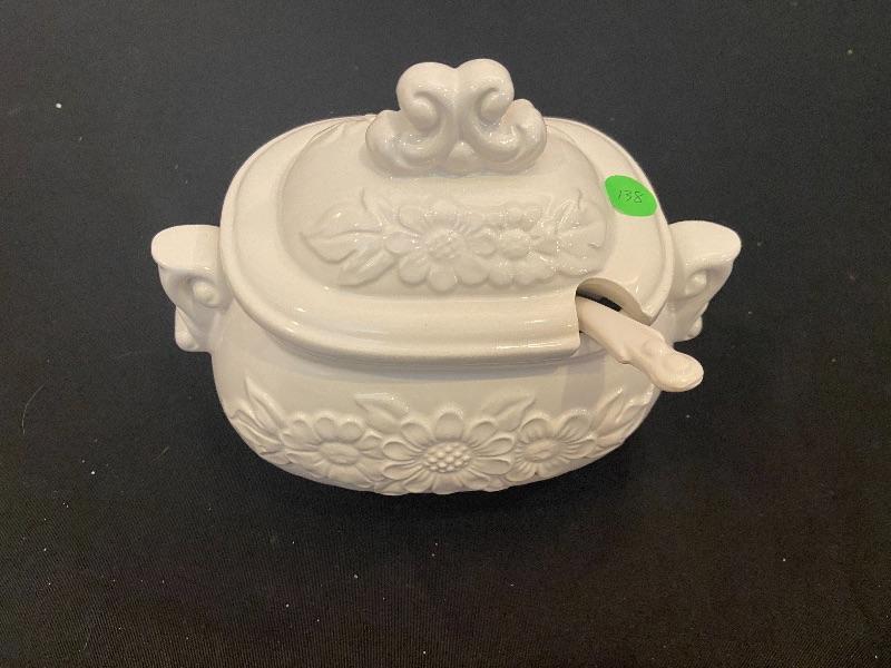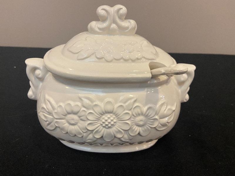 Cute, no cracks or chips, this item has lid, and spoon. This is an ONSITE Auction all items will need to be picked up on location. Please see auction description for pick up procedures. Shipping is avaiable on smaller items.