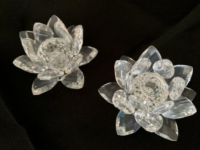 Pair of crystal waterlily/lotus flower candle holders 3" across Boxes and papers.