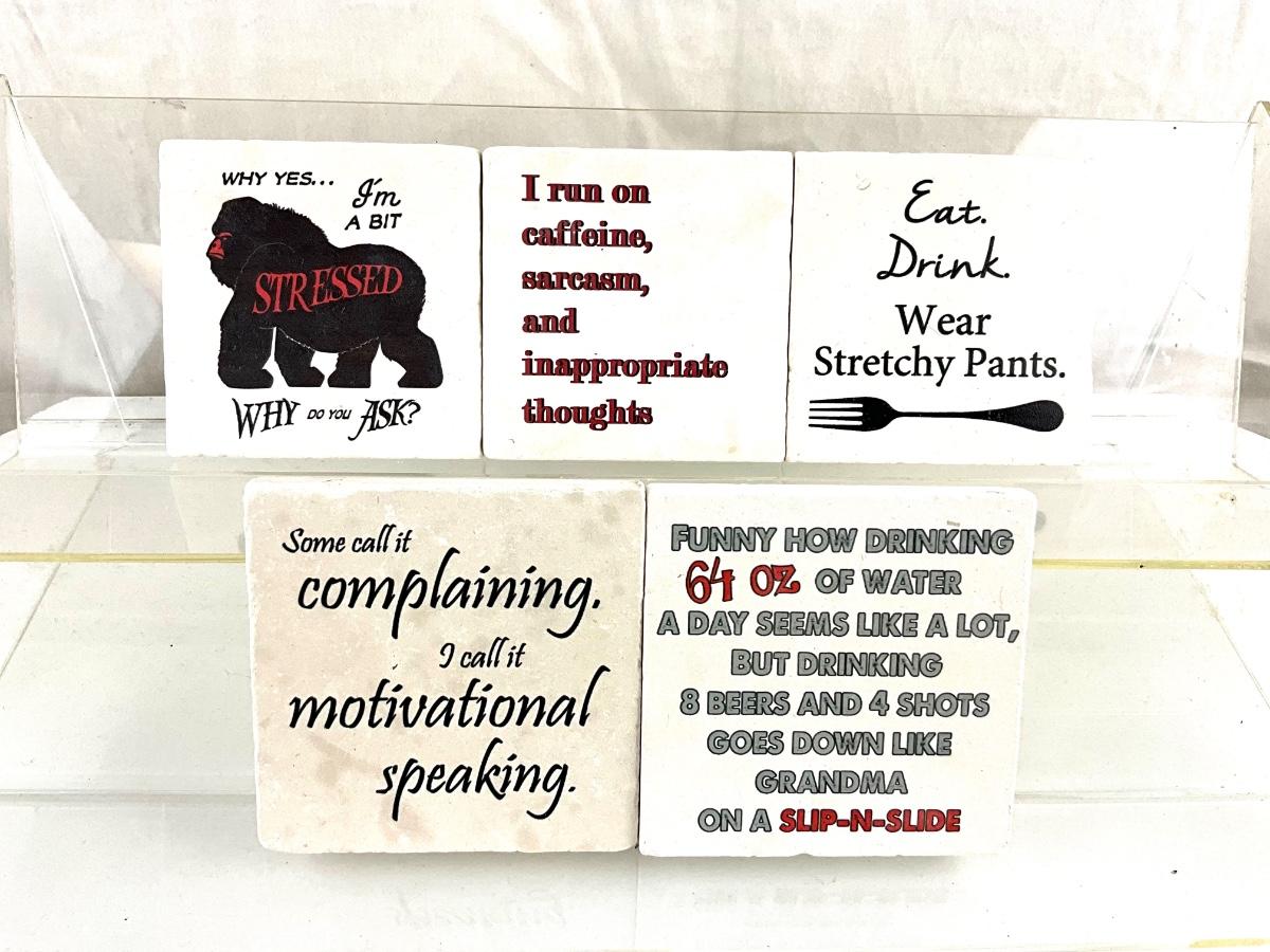 138 Tipsy Stone Coasters with Quirky Sayings  set of 5