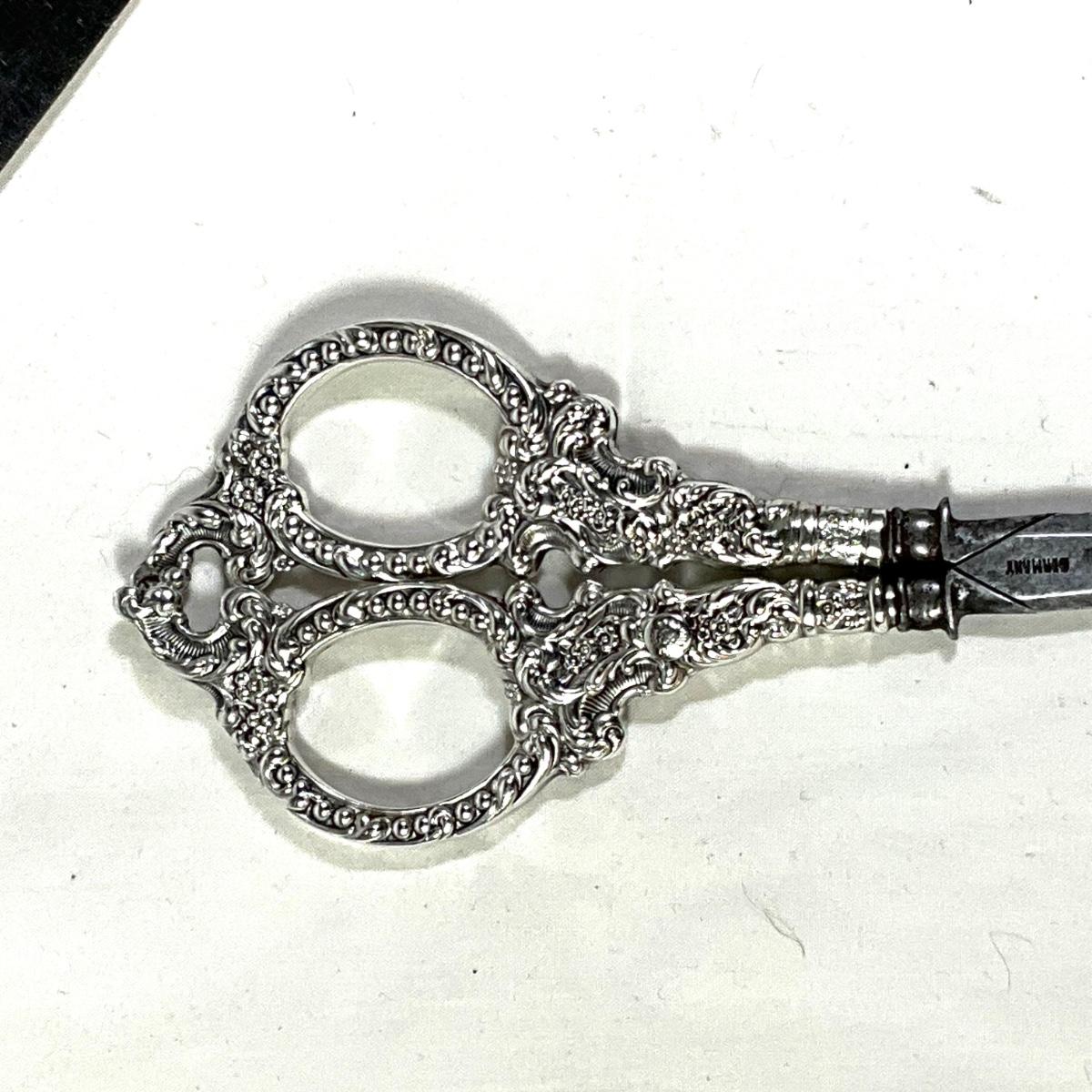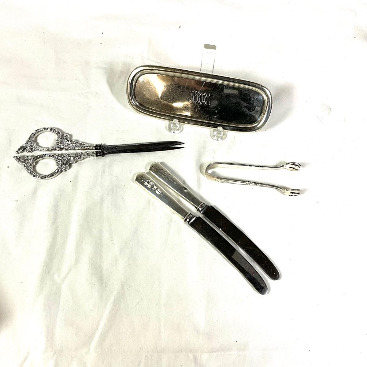 1381 Antique Sterling Handled Scissors, Small Tray and Tongs