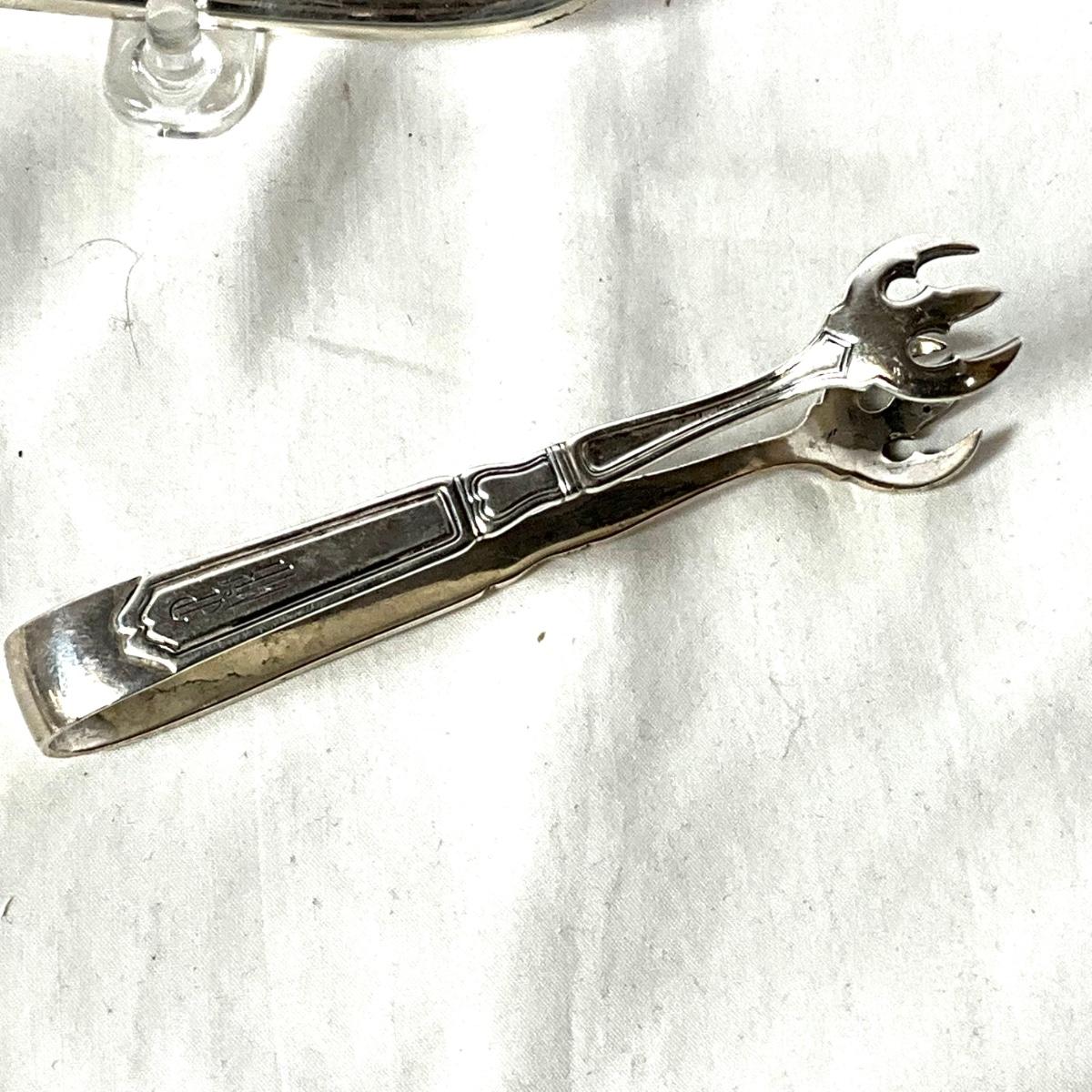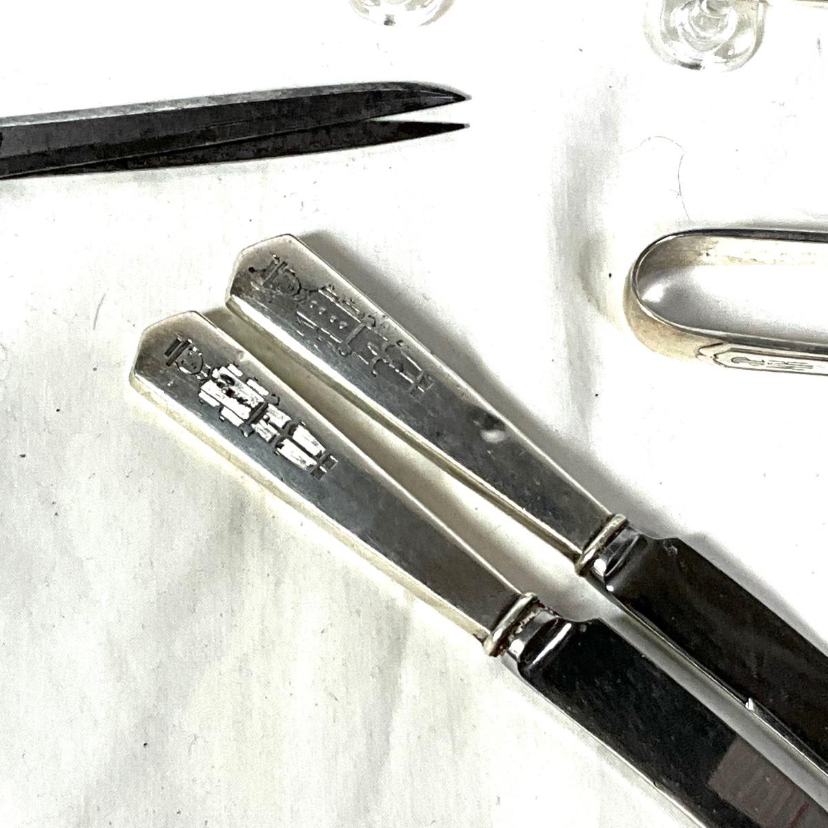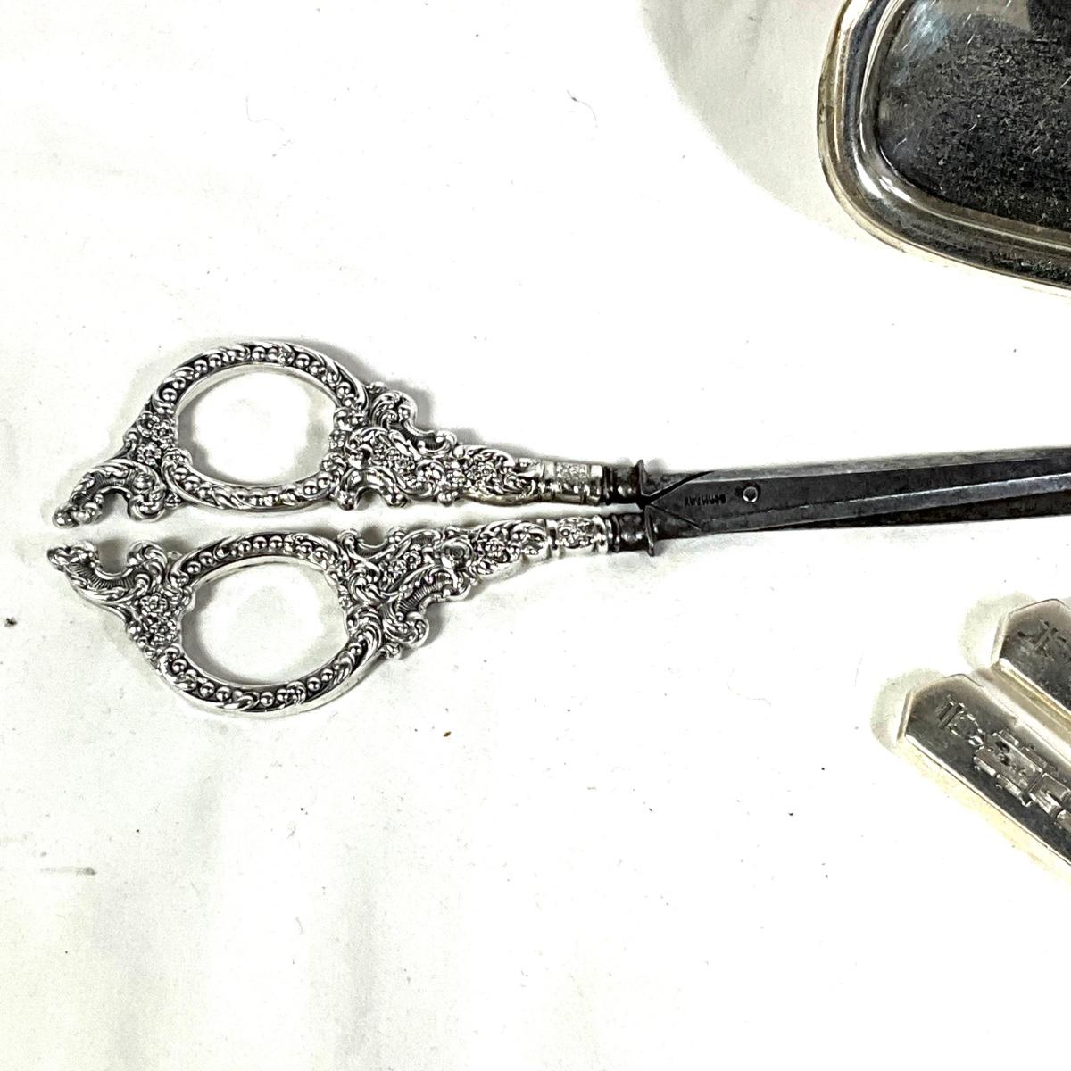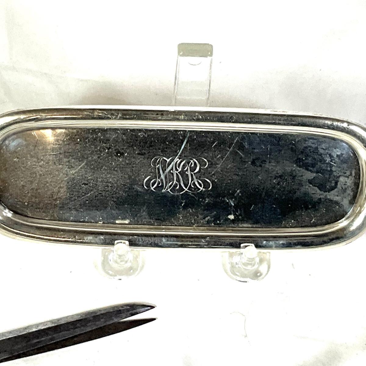 Scissors are marked Germany and measure 7" long , the tongs are marked sterling and are monogrammed on one side measuring 4" , the tray is monogrammed , marked sterling and measures 6.25 x 2.25"