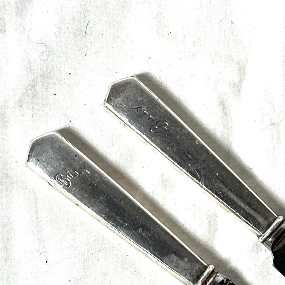 The sterling tray and tongs weigh 76 grams The two children's knives measure 7" and the handle has a boy engraved with a hat on one side and the other side has "Billy" engraved. These knives are not marked sterling , they could be silverplate.
