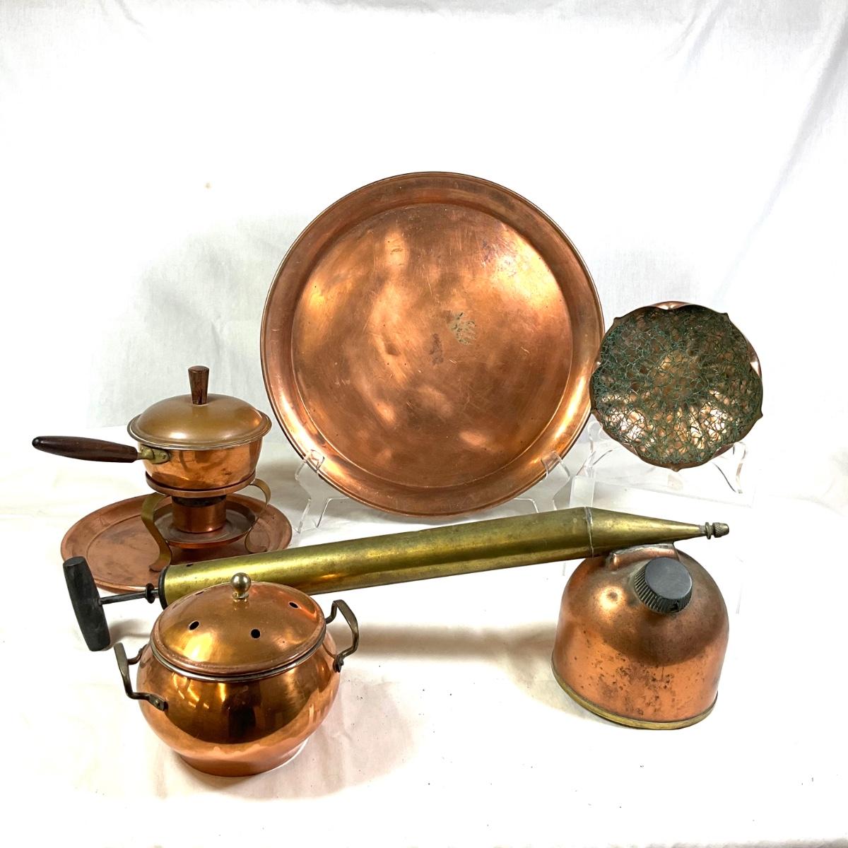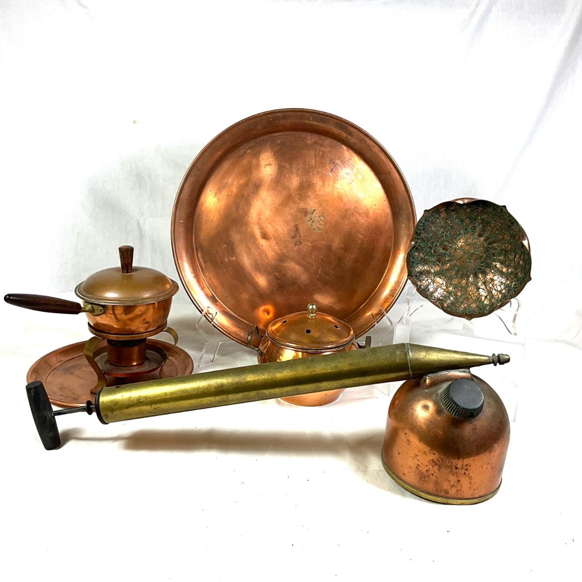 1383 Vintage Copper and Brass Garden Sprayer and Copper Serving Pieces
