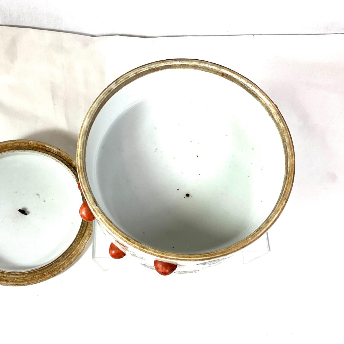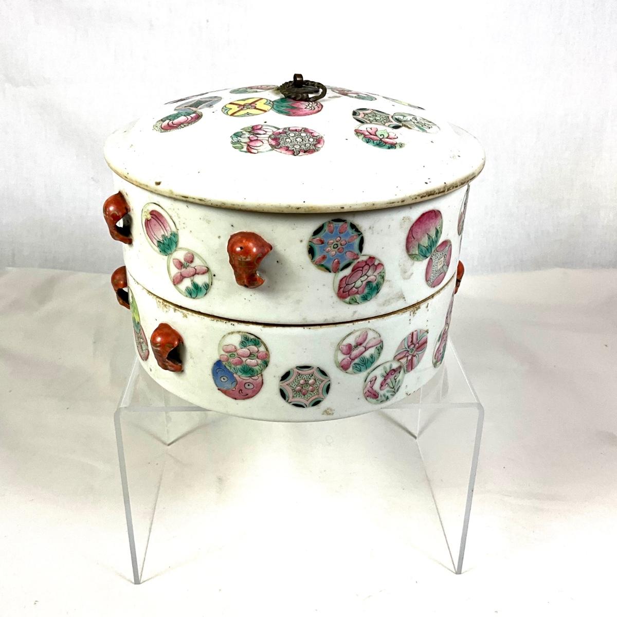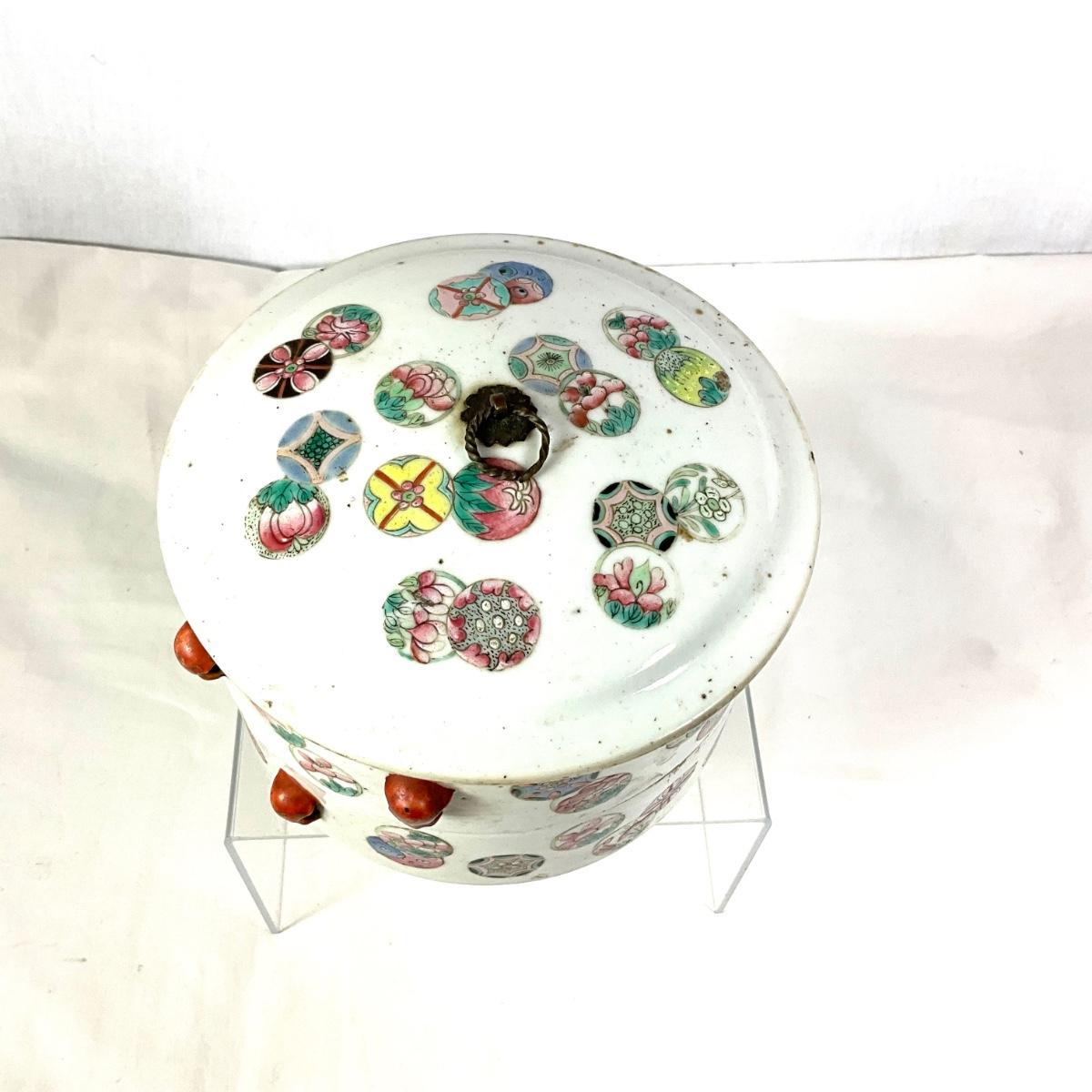 The lid has a metal pull on the top and all of the pieces are in good condition
