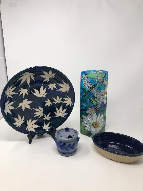 138: Stoneware Charger, Glass Dragonfly Vase and Other Stoneware