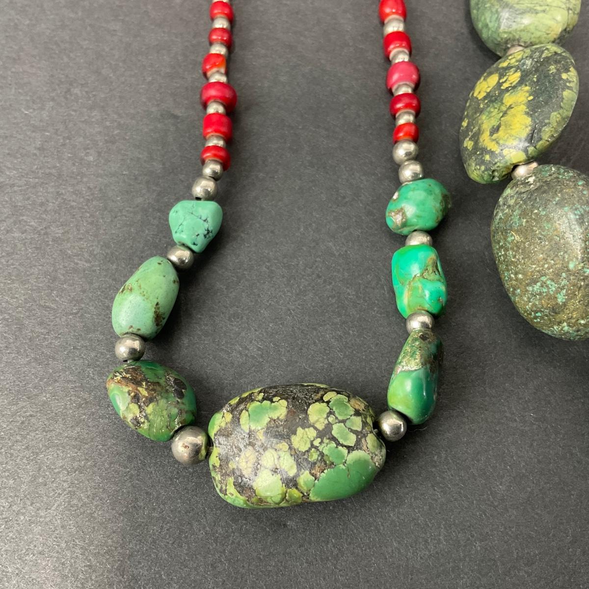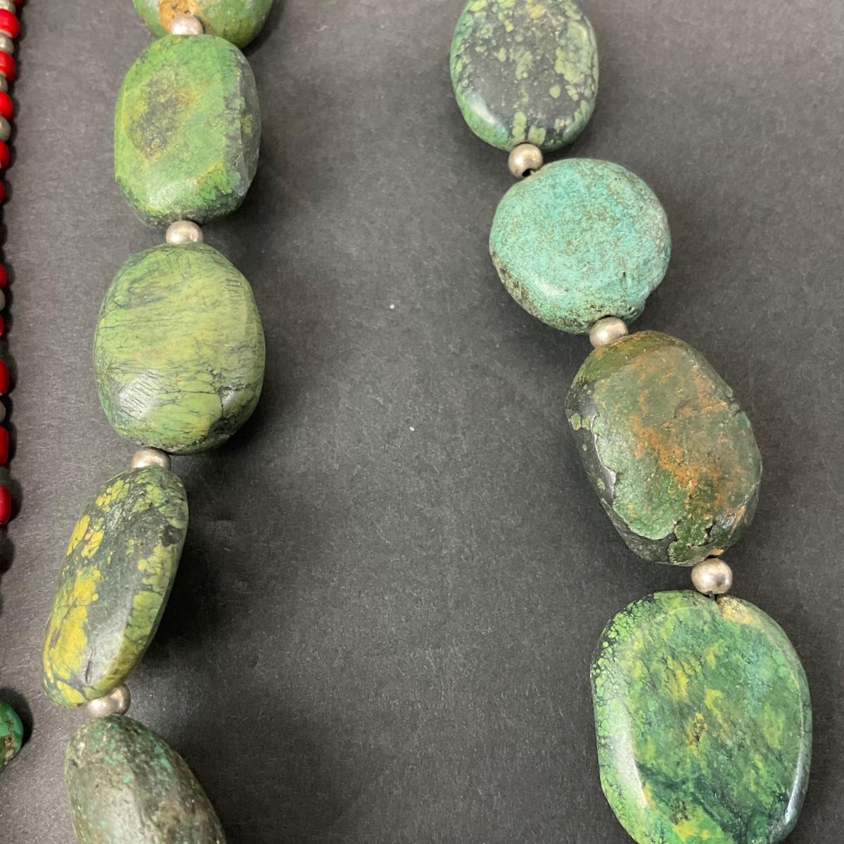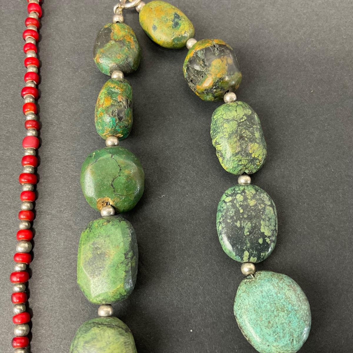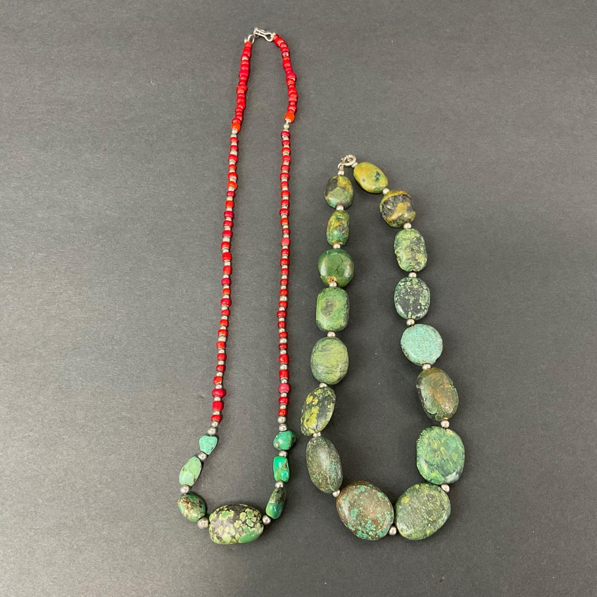 Two unique polished stone necklaces. Please see photos for details and condition. Any condition statement is given as a courtesy to a client, is an opinion, and should not be treated as a statement of fact. Reference to condition written, oral or within a condition report shall not be regarded as a full account of condition and may not include all defects, alterations, or restorations. Absence of a condition report does not imply a lot is flawless or lacking imperfections or damage. Katherine’s Auction & Appraisal Service shall have no responsibility for any error or omission. Returns shall not be accepted on the basis of condition. ::: Shipping is available on this lot. If you require shipping you must let us know at the close of the auction. We will coordinate with you after the item has been won. Shipping fees will include insurance up to or exceeding the value of all items being mailed. If you have any questions regarding this lot please contact the auctioneer either via this website, by direct email or by phone. PICK UP TIMES and other important information can be found in the TERMS and DESCRIPTION of the auction. Please take a look for pertinent information. Thanks!