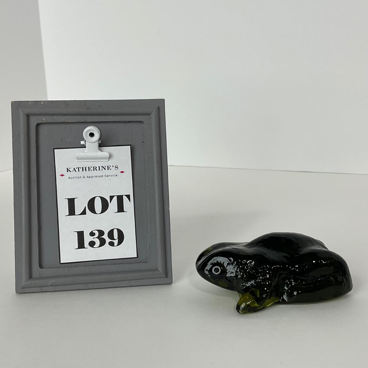 One Pilgrim green frog paperweight. 1 1/4 inches tall by 4 inches long. This piece has no damage, and appears to be in great shape with no visable chips, cracks, or broken pieces. Please see photos for details and condition. Any condition statement is given as a courtesy to a client, is an opinion, and should not be treated as a statement of fact. Reference to condition written, oral or within a condition report shall not be regarded as a full account of condition and may not include all defects, alterations, or restorations. Absence of a condition report does not imply a lot is flawless or lacking imperfections or damage. Katherine’s Auction & Appraisal Service shall have no responsibility for any error or omission. Returns shall not be accepted on the basis of condition. ::: Shipping is available on this lot. If you require shipping you must let us know at the close of the auction. We will coordinate with you after the item has been won. Shipping fees will include insurance up to or exceeding the value of all items being mailed. If you have any questions regarding this lot please contact the auctioneer either via this website, by direct email or by phone. PICK UP TIMES and other important information can be found in the TERMS and DESCRIPTION of the auction. Please take a look for pertinent information. Thanks!