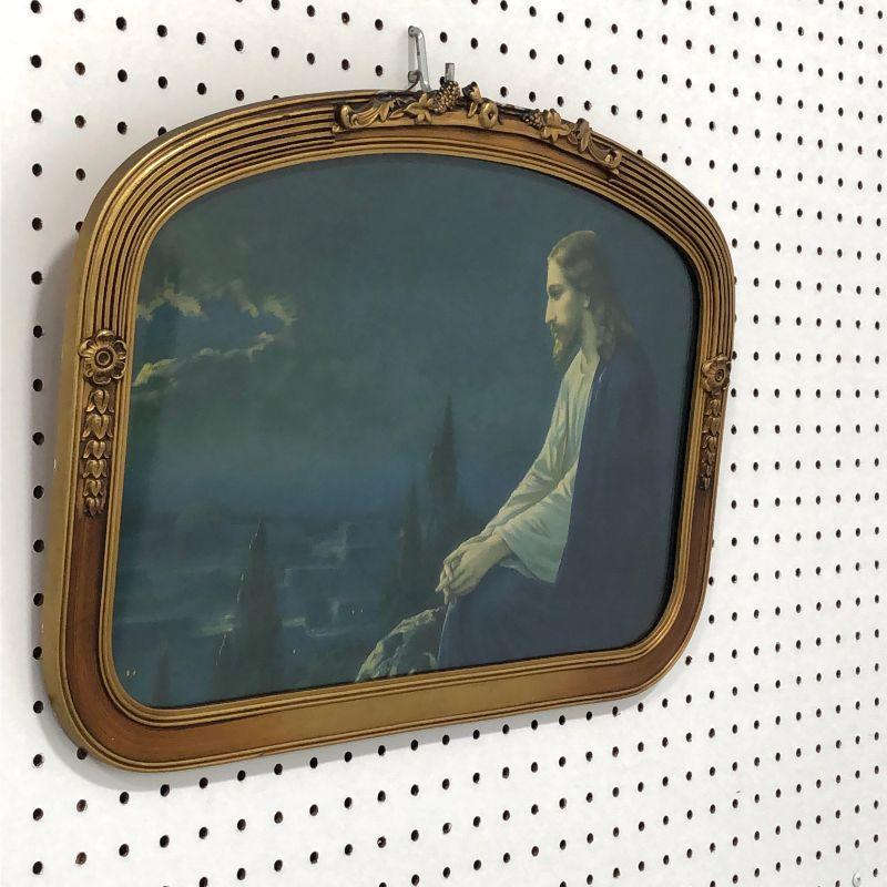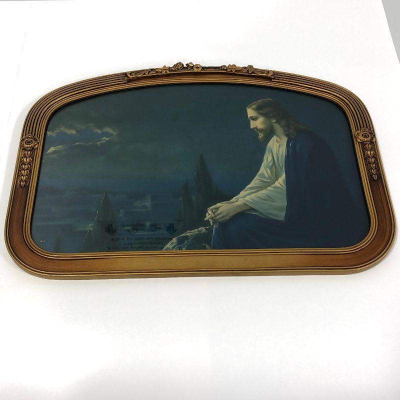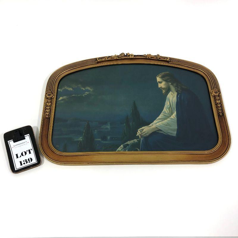 Gorgeous framed religious print. Circa 1920. Some Water Damage noted, and frame needs some love. Measures 20" wide x 14.5" tall at tallest point