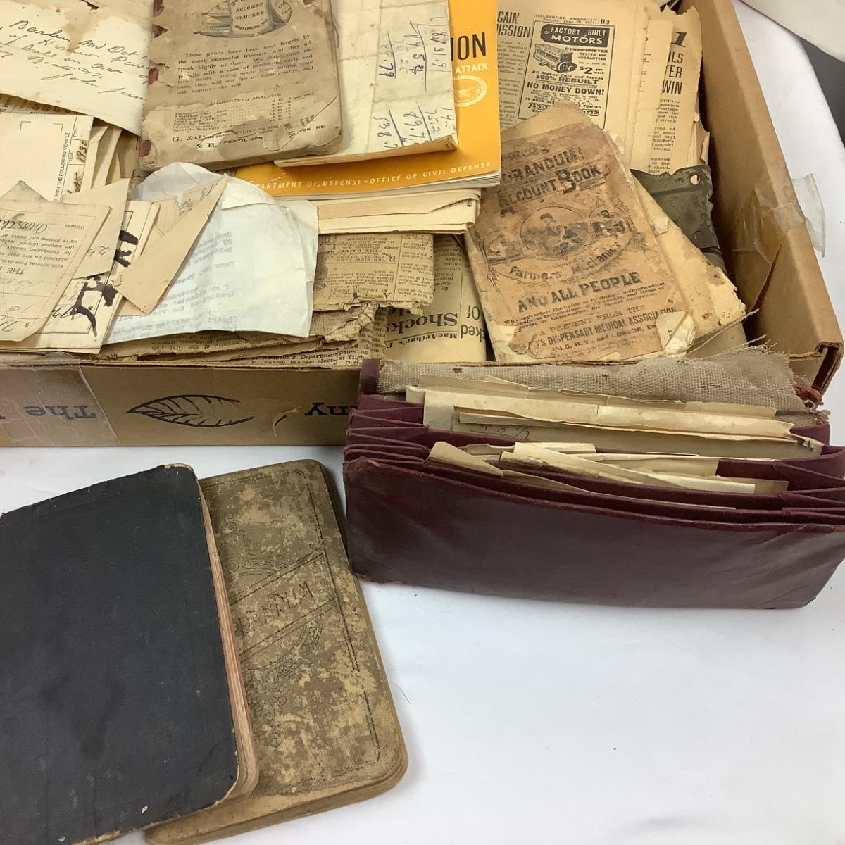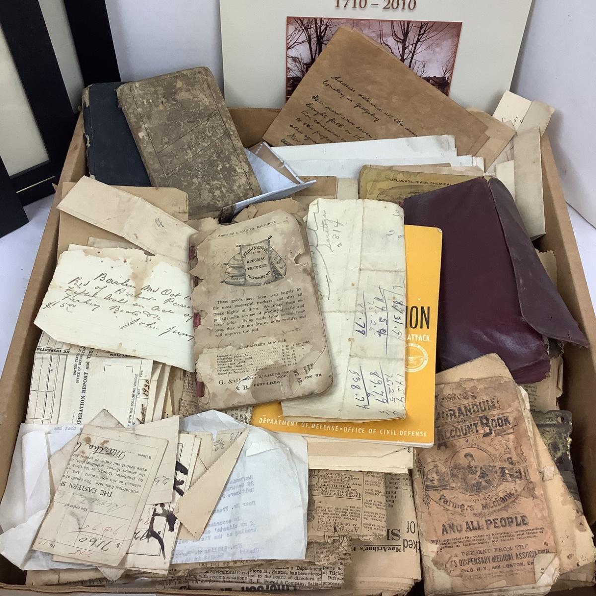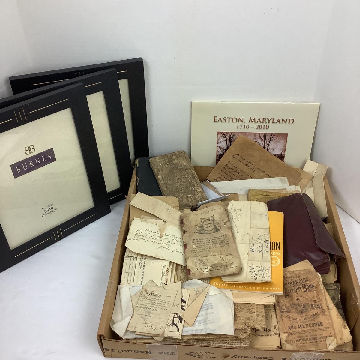 Lot contains various paper items from newspapers to receipts and there are 3 frames.
