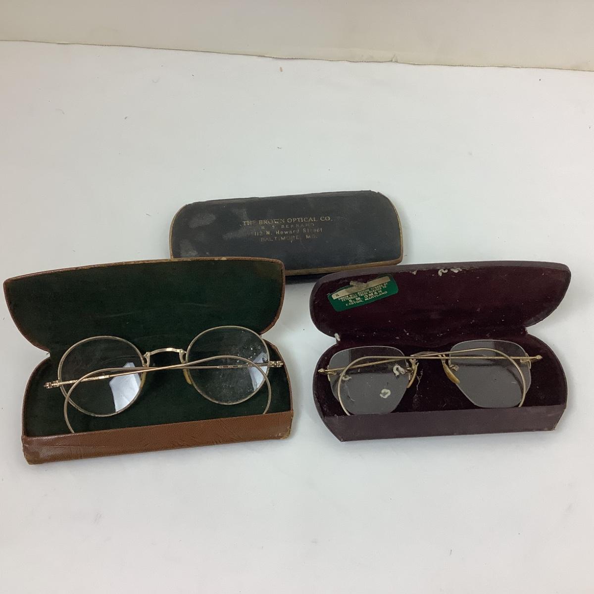 Lot contains 2 pairs of 12k gold filled glasses and 3 cases, all are from local companies.