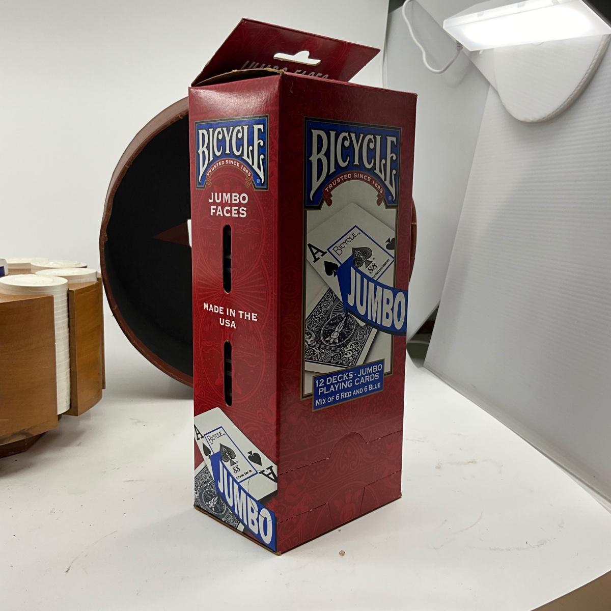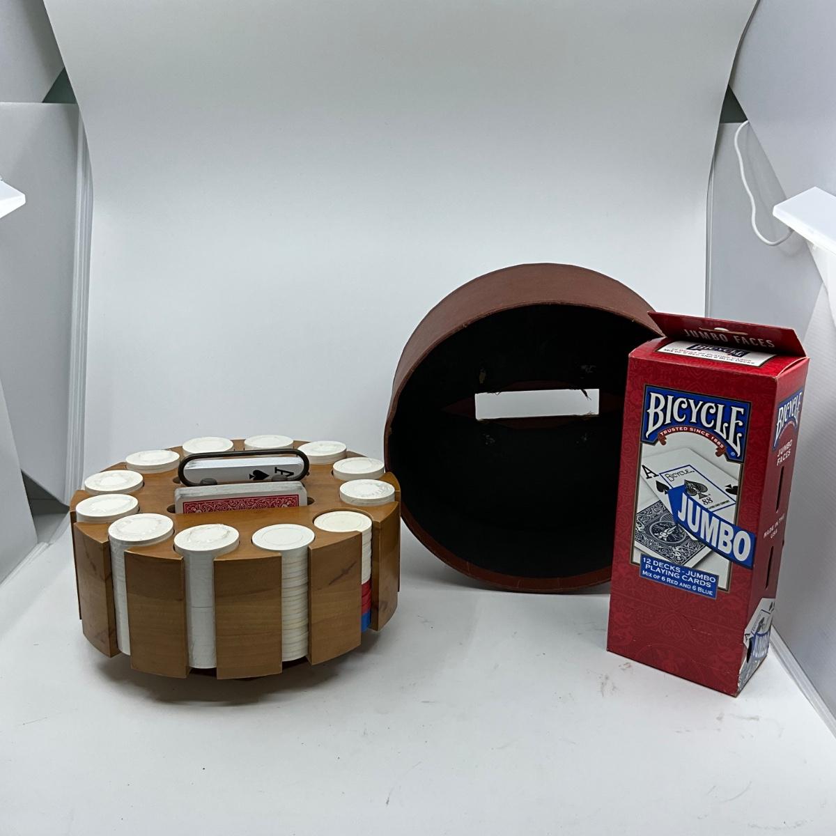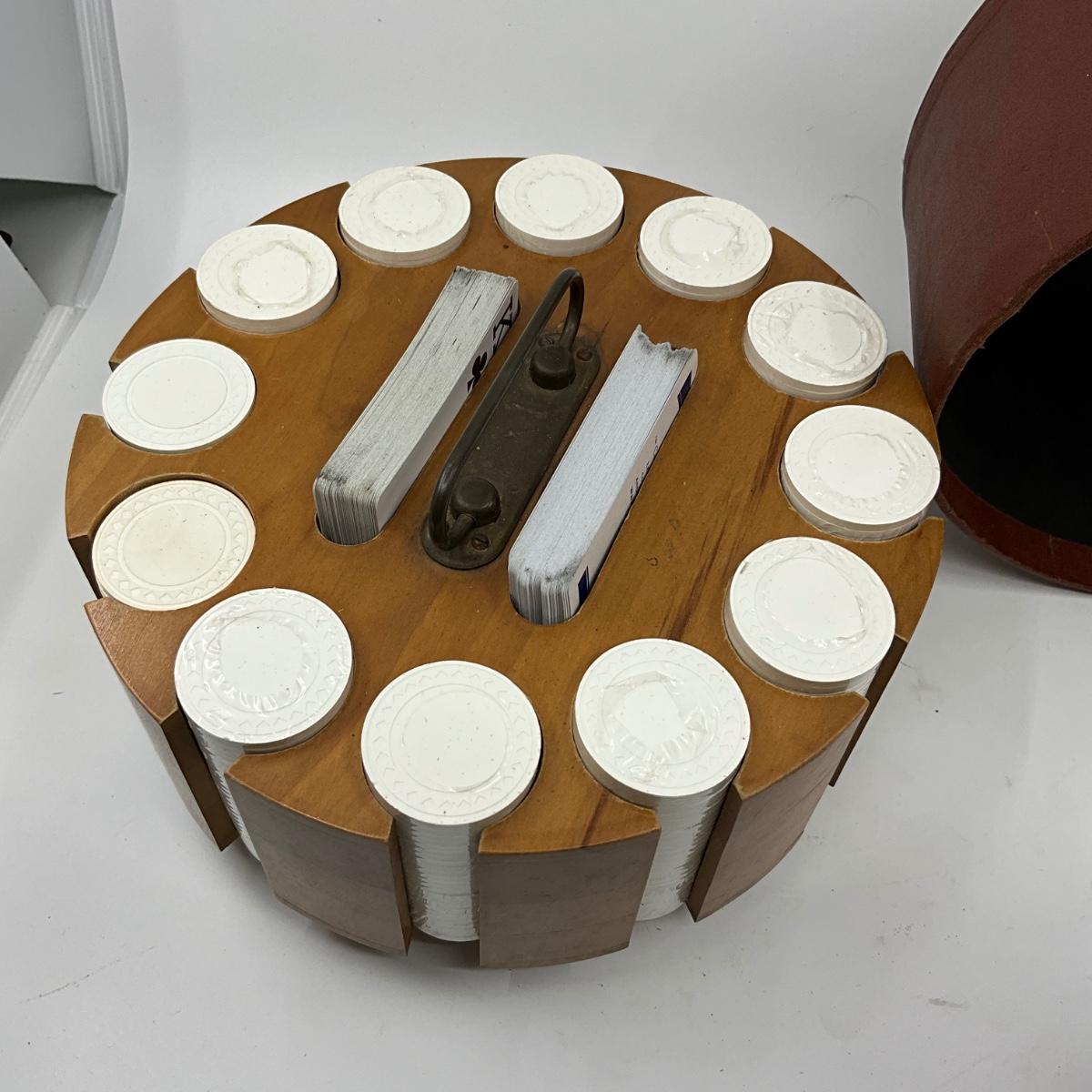 1392 Vintage Wooden Poker Chip Stand with 12 Decks of Playing Cards