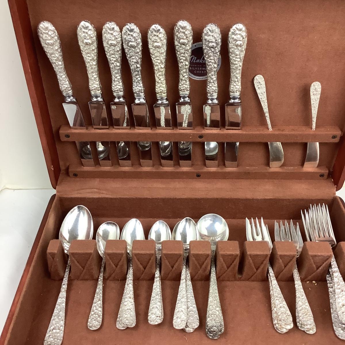 8 knives, 8 dinner forks, 8 salad forks, 7 teaspoons, 4 soup spoons, 2 butter knives, 1 serving spoon, 6 tarnish proof dust bags and the wooden chest. The total weight is 46.82 Troy ounces.
