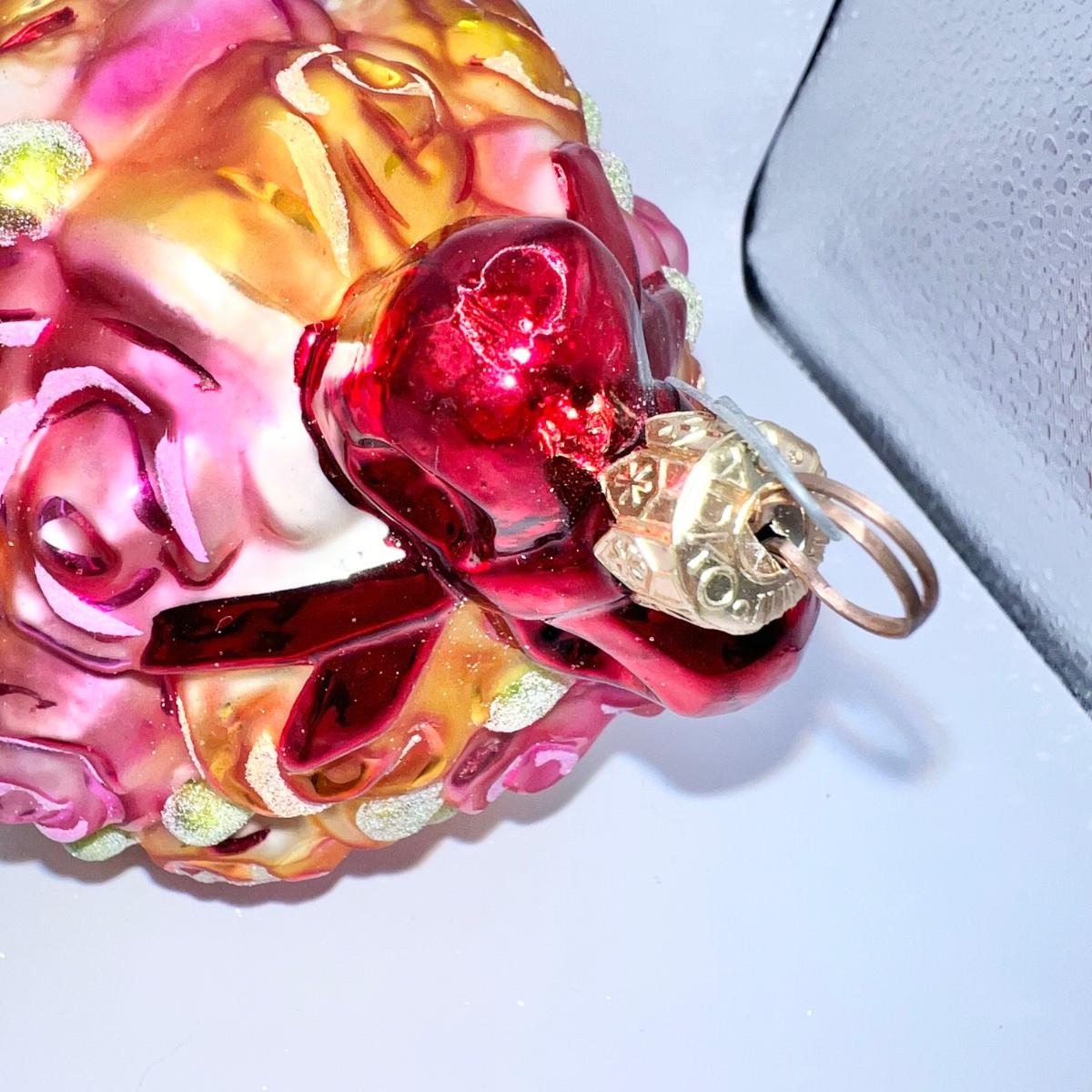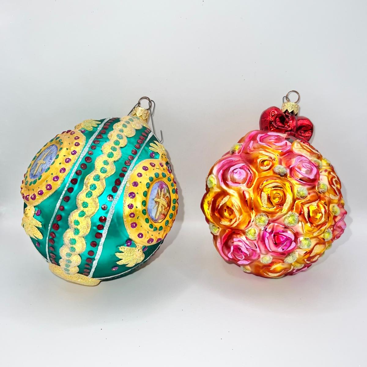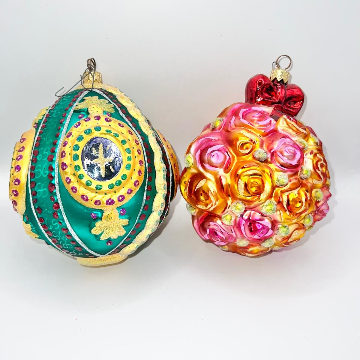 The egg shape measures 5.5” high x 4.5” round the rose ornament measures 5” round comes with box and tags number 568/5000