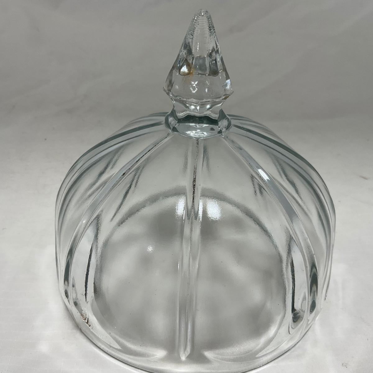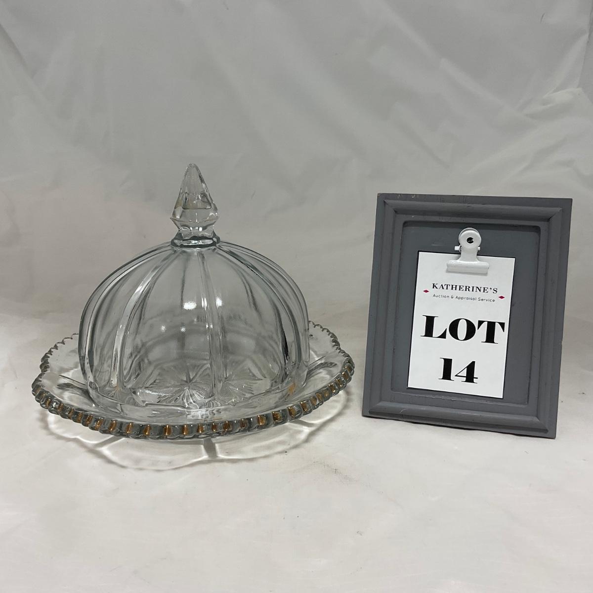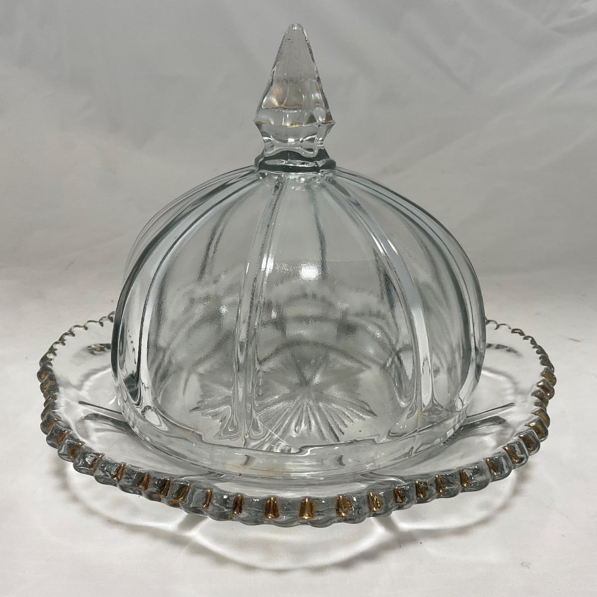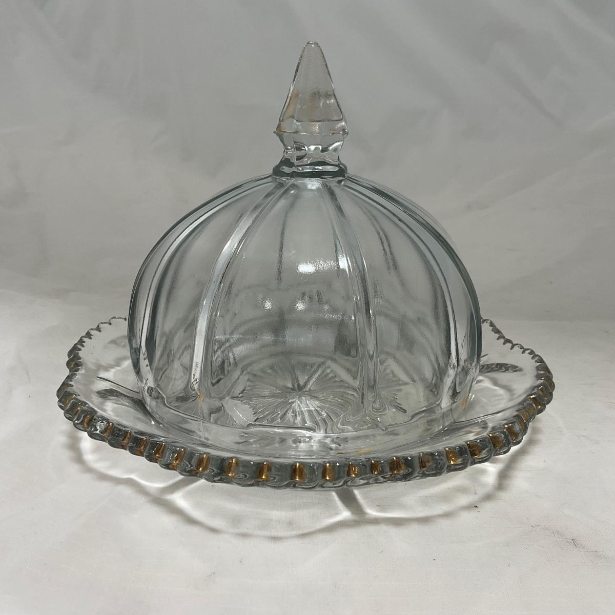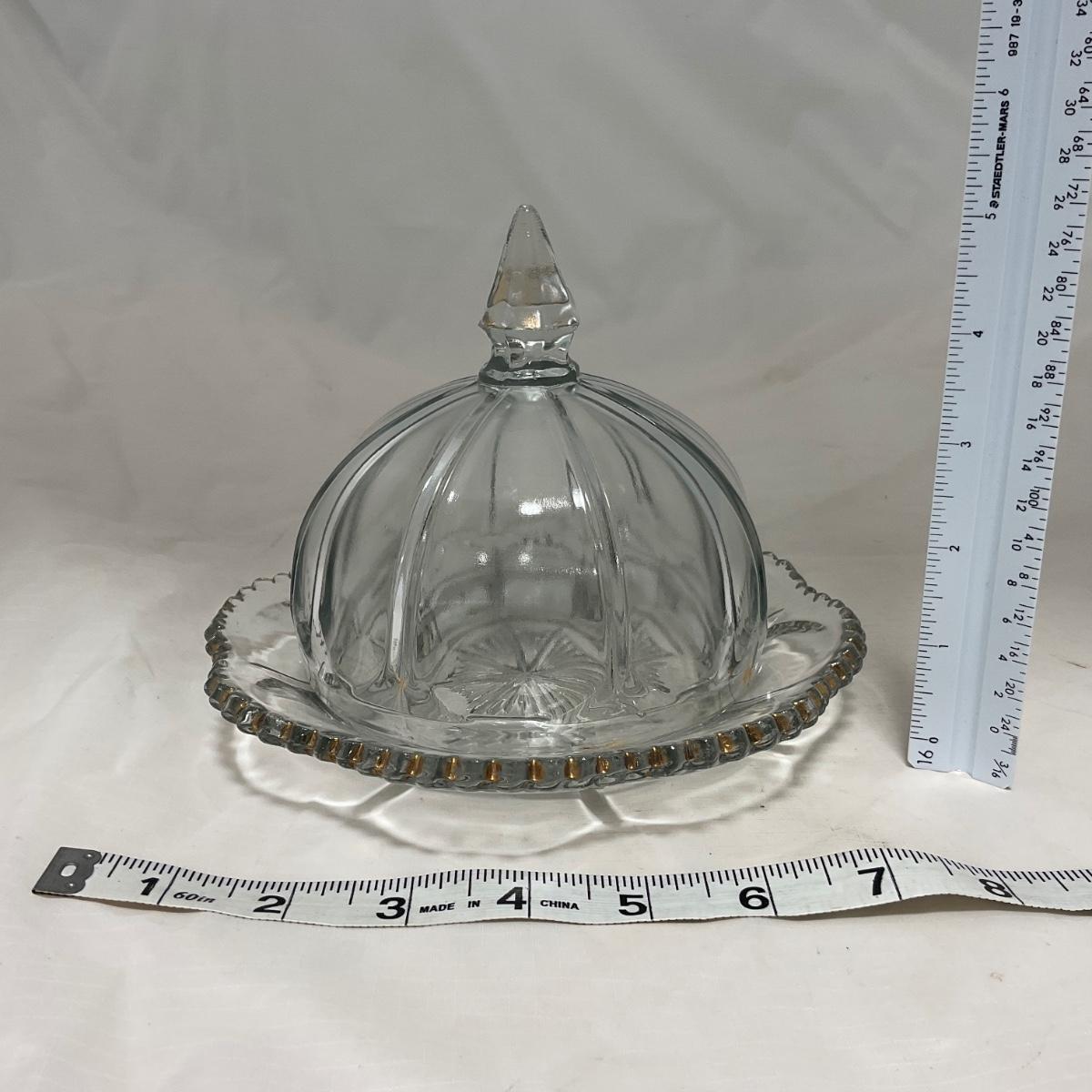 -14- Clear Pressed Covered Butter Dish | Gold Accents