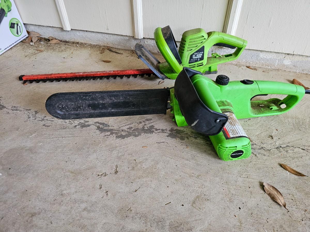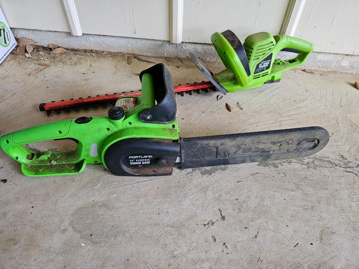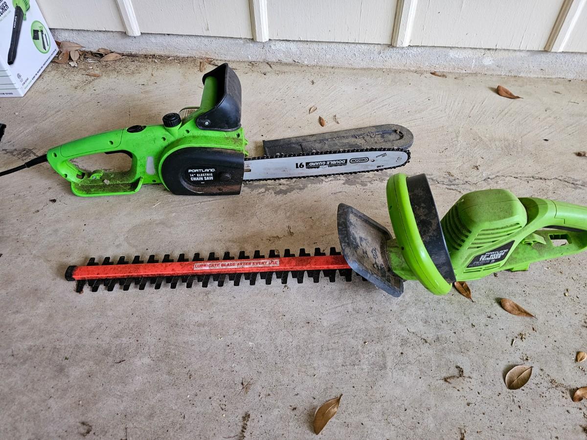Last minute addition to the sale! Portland 14" Electric Chainsaw and Portland 22" Electric Hedge Trimmer, both tested and working.