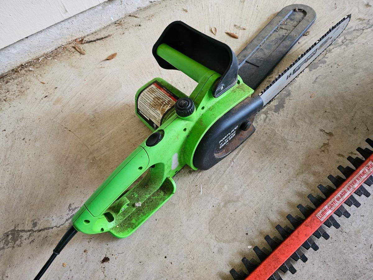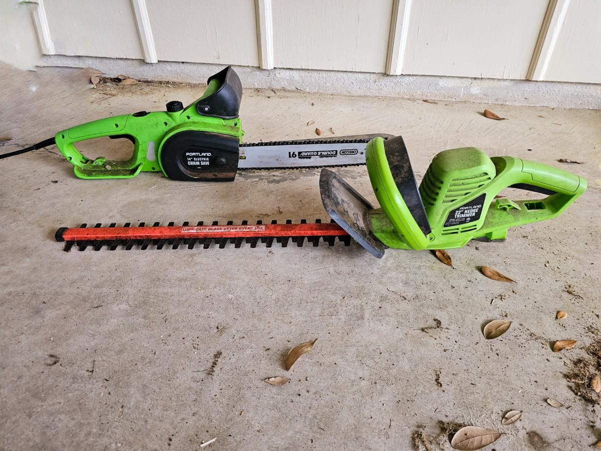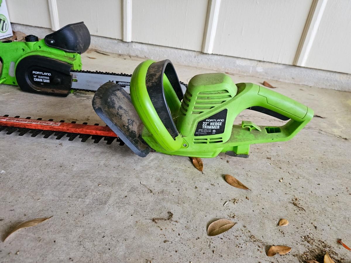 Last minute addition to the sale! Portland 14" Electric Chainsaw and Portland 22" Electric Hedge Trimmer, both tested and working.
