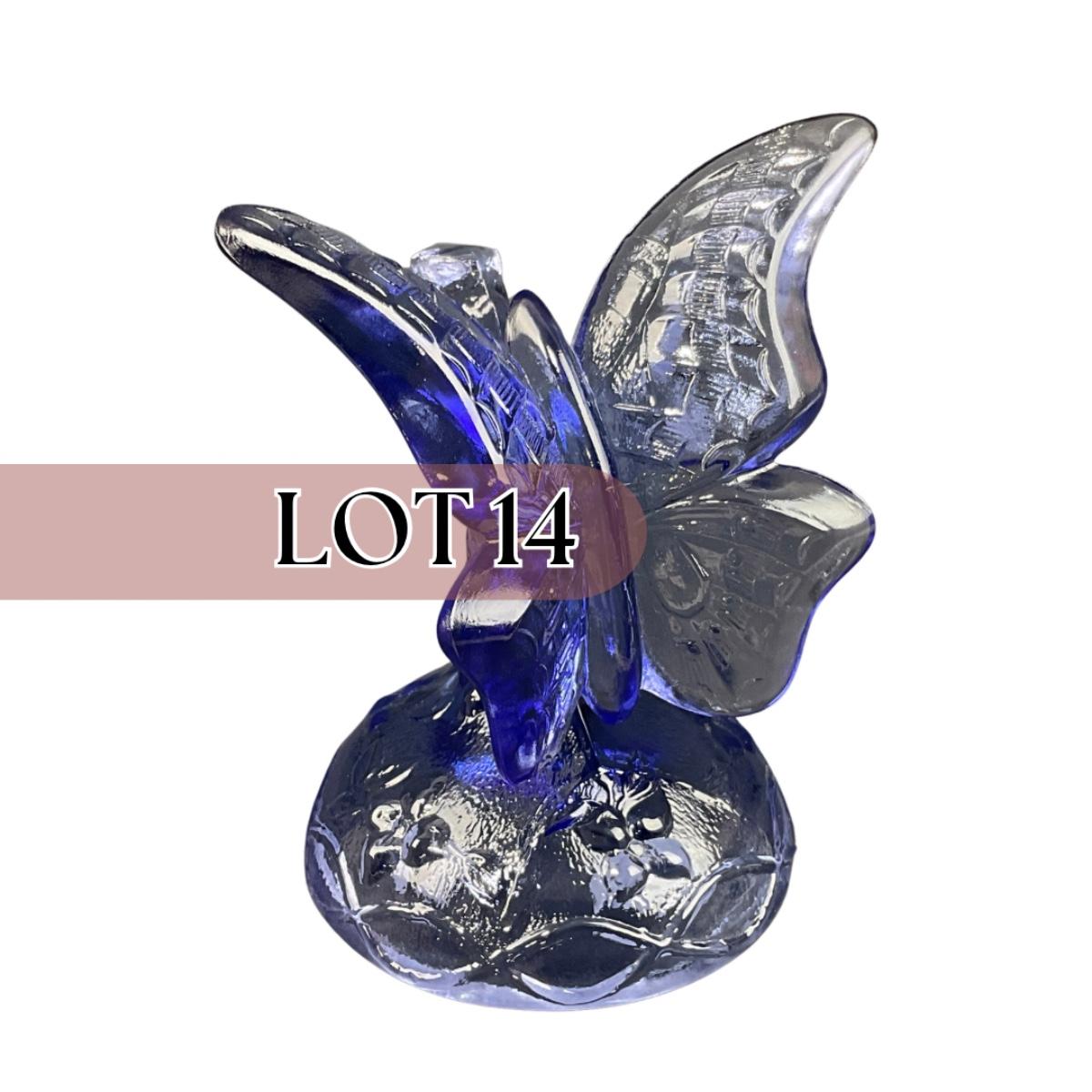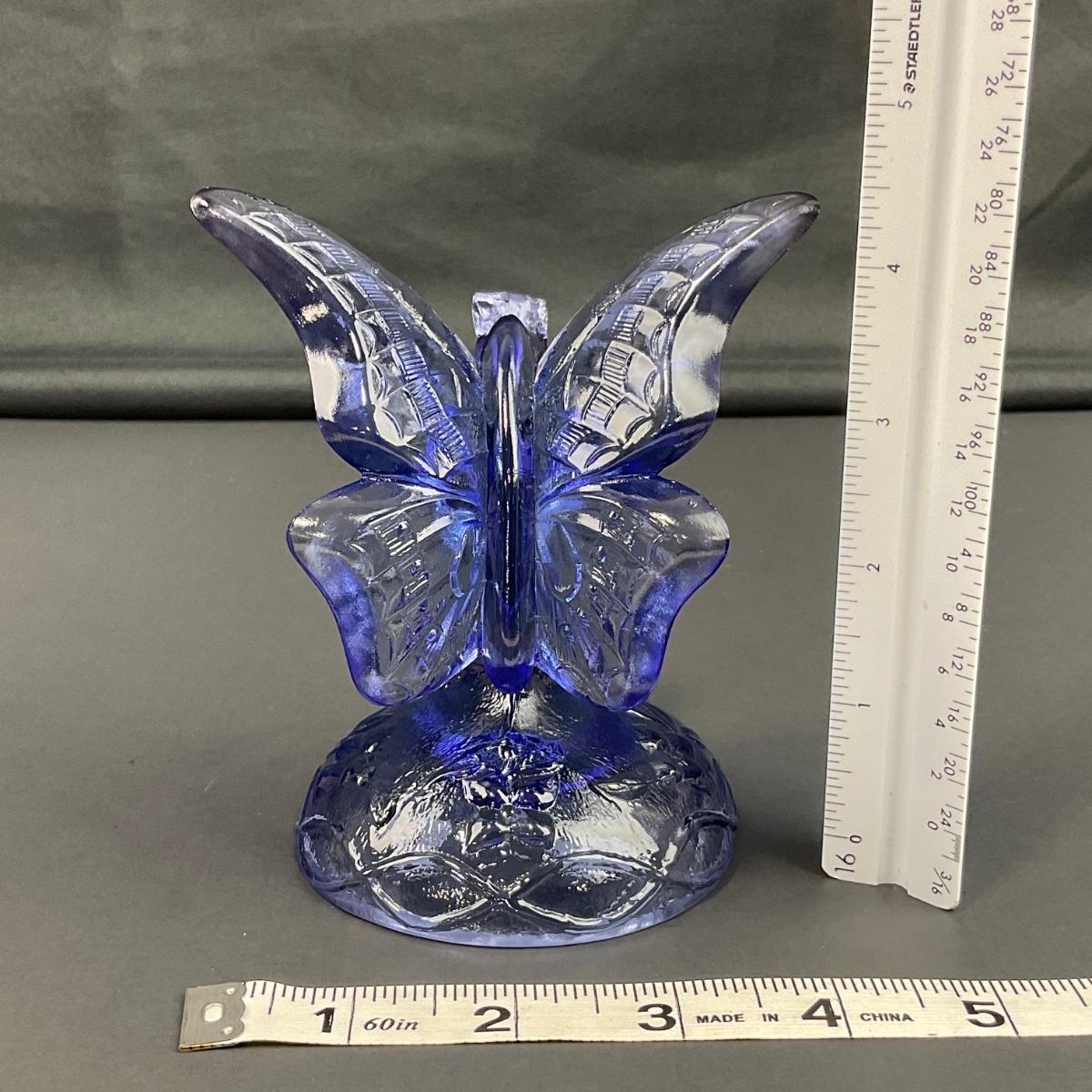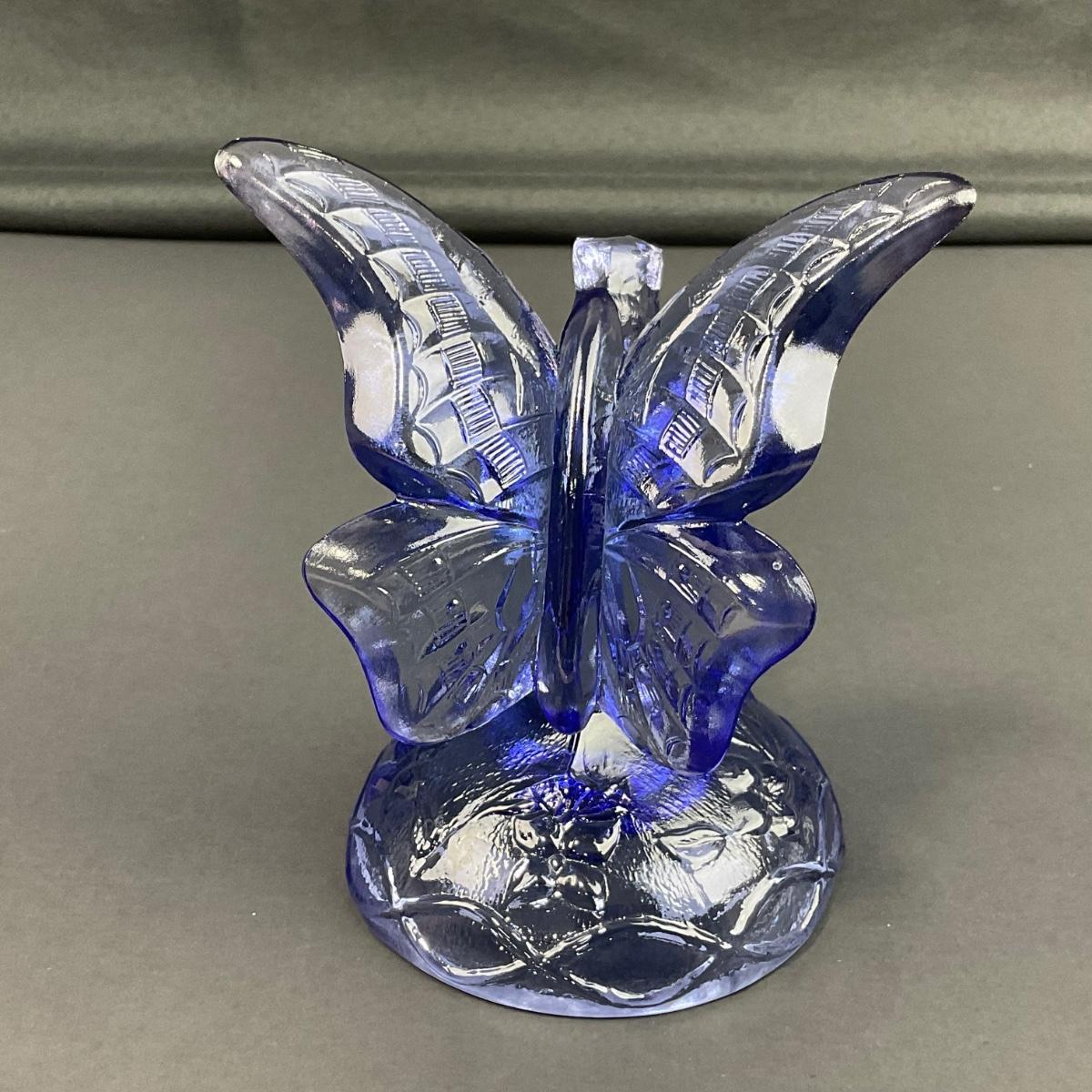 One vintage marked Fenton blue art glass butterfly on a branch figure. This piece has no damage, and appears to be in great shape with no visable chips, cracks, or broken pieces. Please see photos for details and condition. Any condition statement is given as a courtesy to a client, is an opinion, and should not be treated as a statement of fact. Reference to condition written, oral or within a condition report shall not be regarded as a full account of condition and may not include all defects, alterations, or restorations. Absence of a condition report does not imply a lot is flawless or lacking imperfections or damage. Katherine’s Auction & Appraisal Service shall have no responsibility for any error or omission. Returns shall not be accepted on the basis of condition. ::: Shipping is available on this lot. If you require shipping you must let us know at the close of the auction. We will coordinate with you after the item has been won. Shipping fees will include insurance up to or exceeding the value of all items being mailed. If you have any questions regarding this lot please contact the auctioneer either via this website, by direct email or by phone. PICK UP TIMES and other important information can be found in the TERMS and DESCRIPTION of the auction. Please take a look for pertinent information. Thanks!
