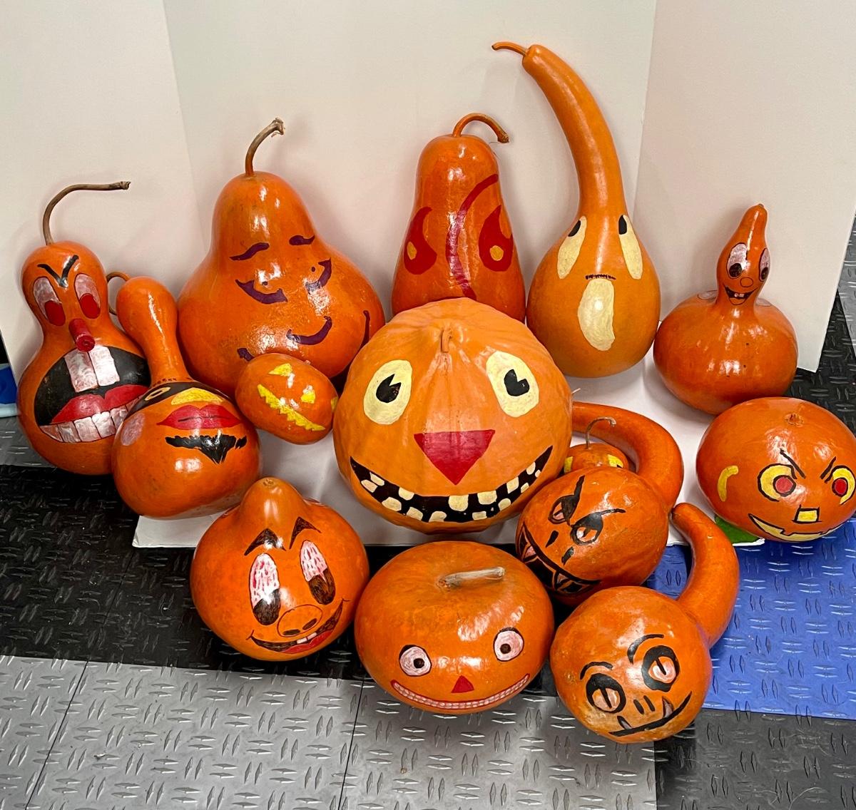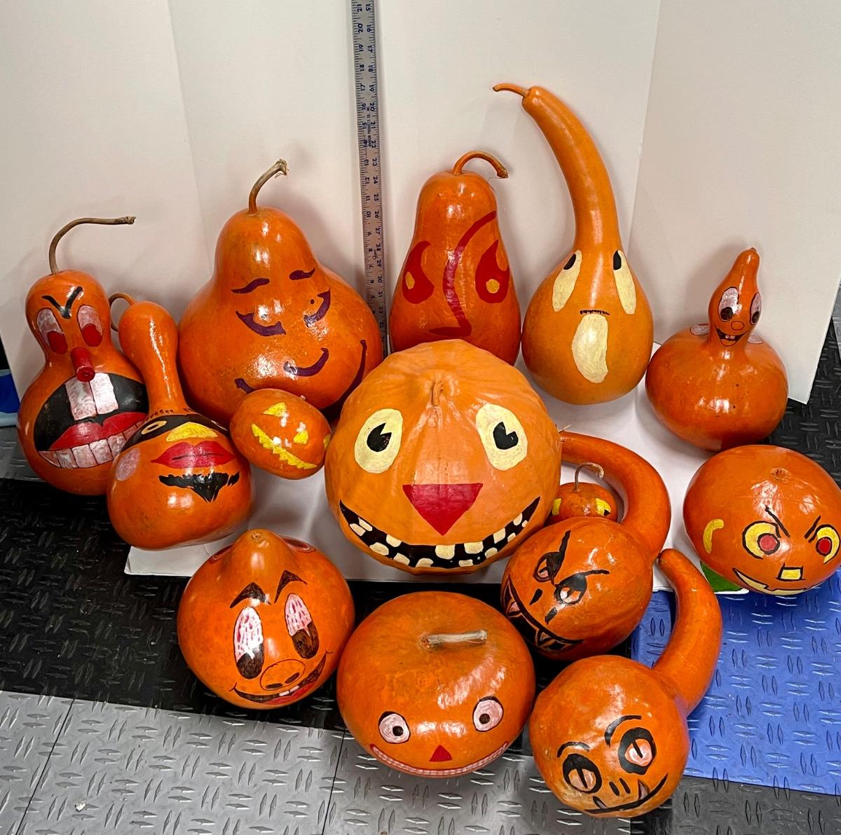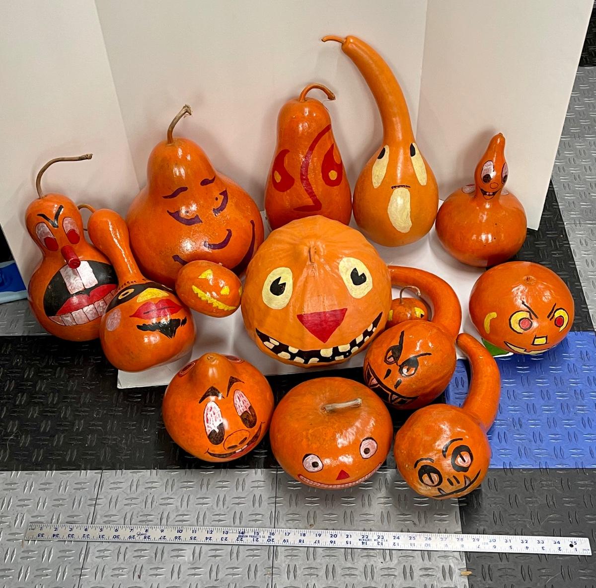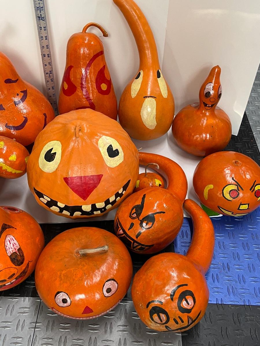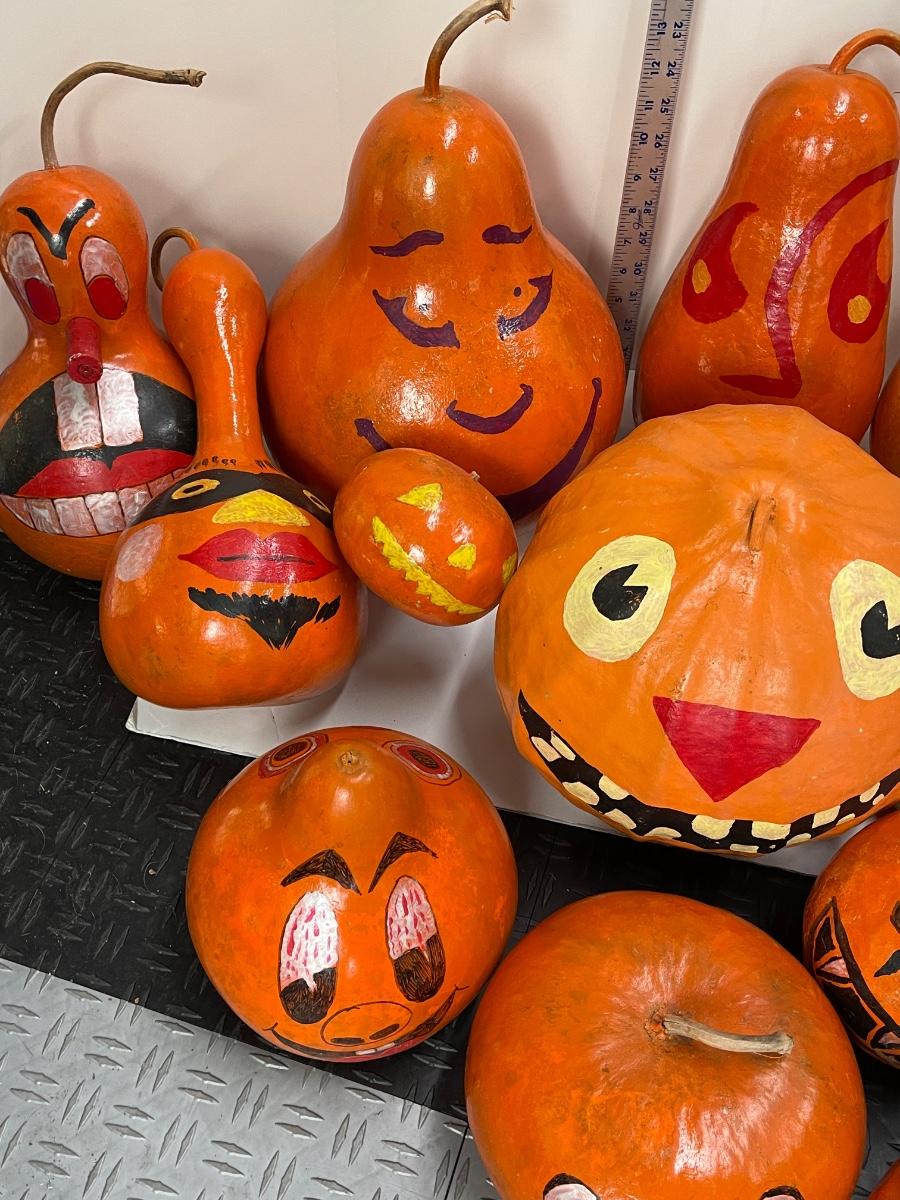 14 hand-painted gourds - Jack o’ Lanterns - faces orange