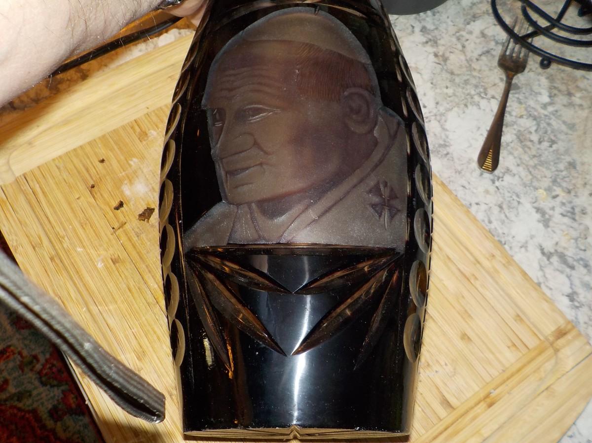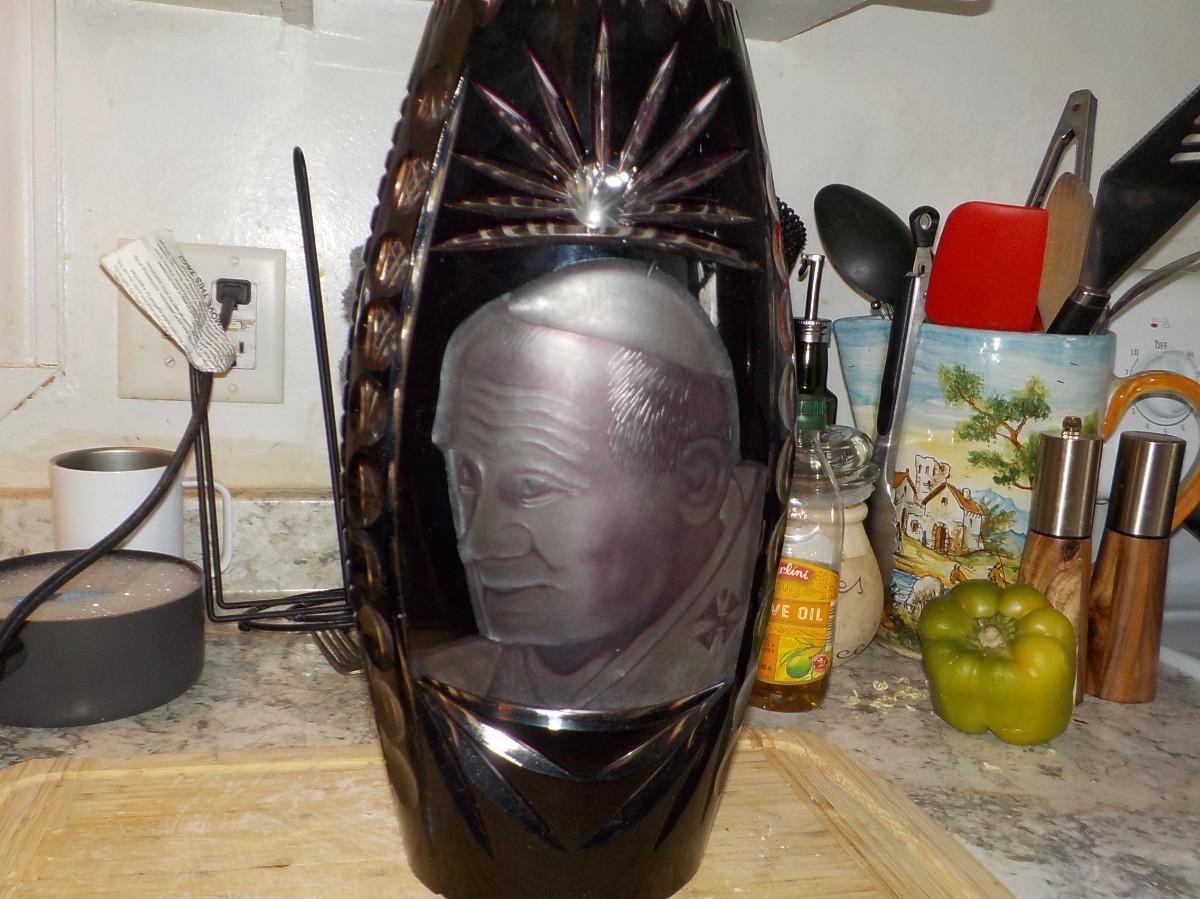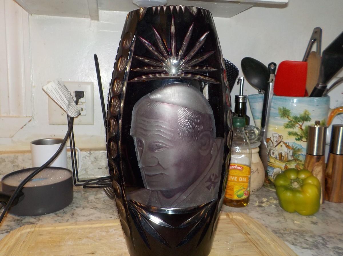 14 inch Cut Glass Vase with etch art of Pope Paul.
