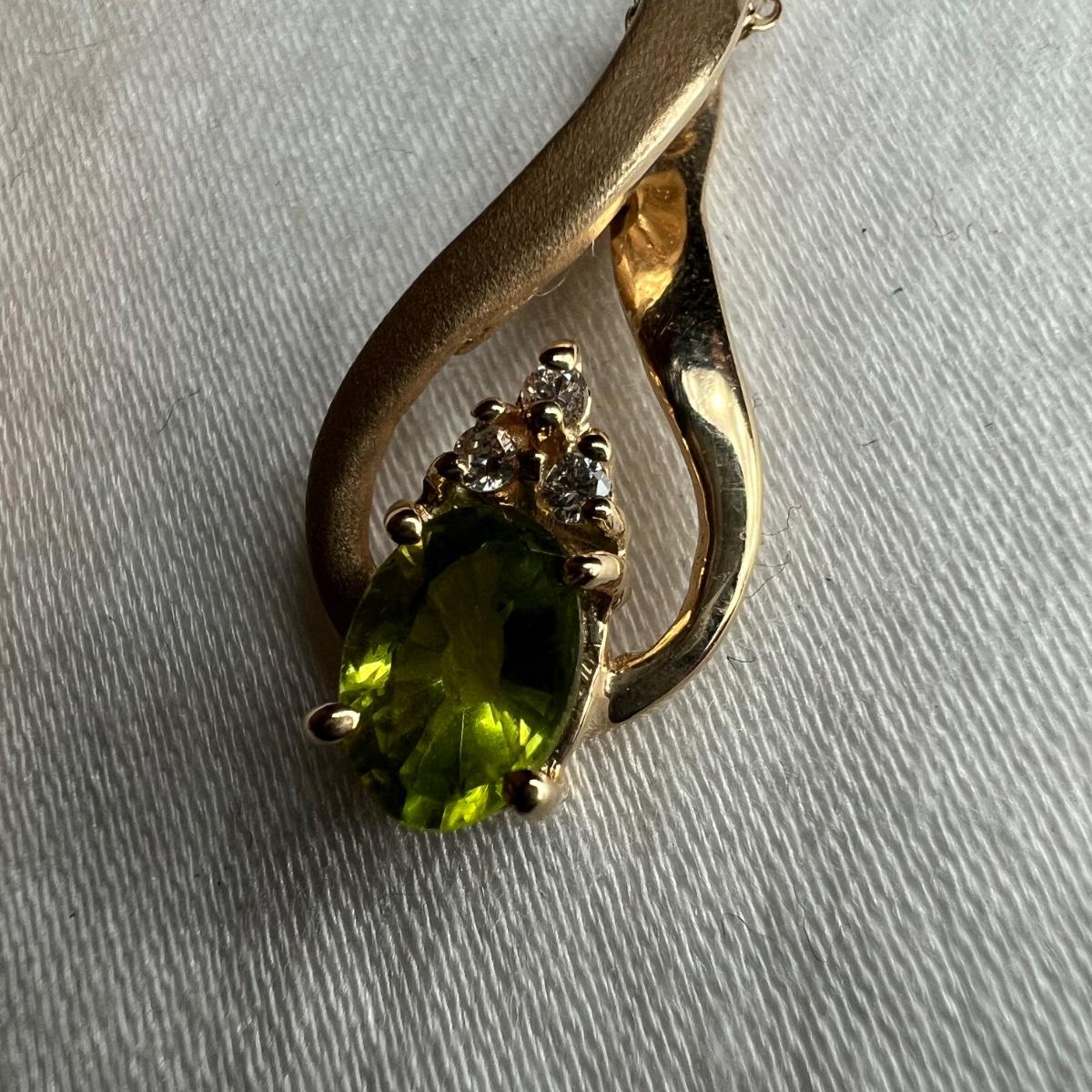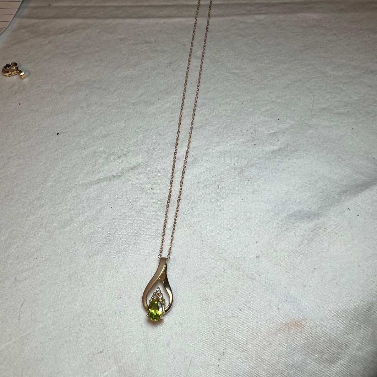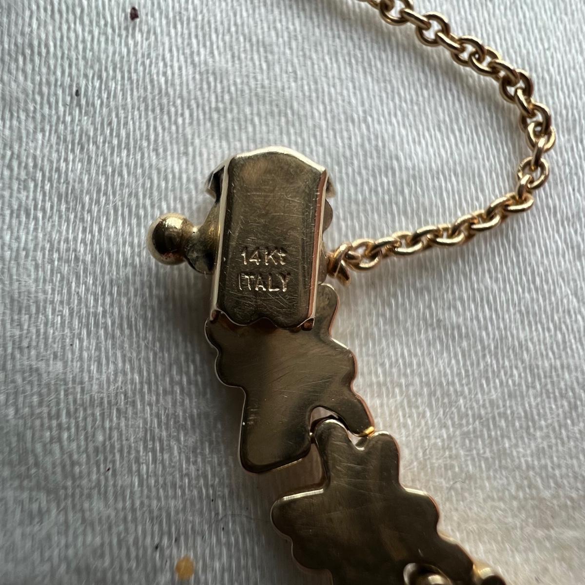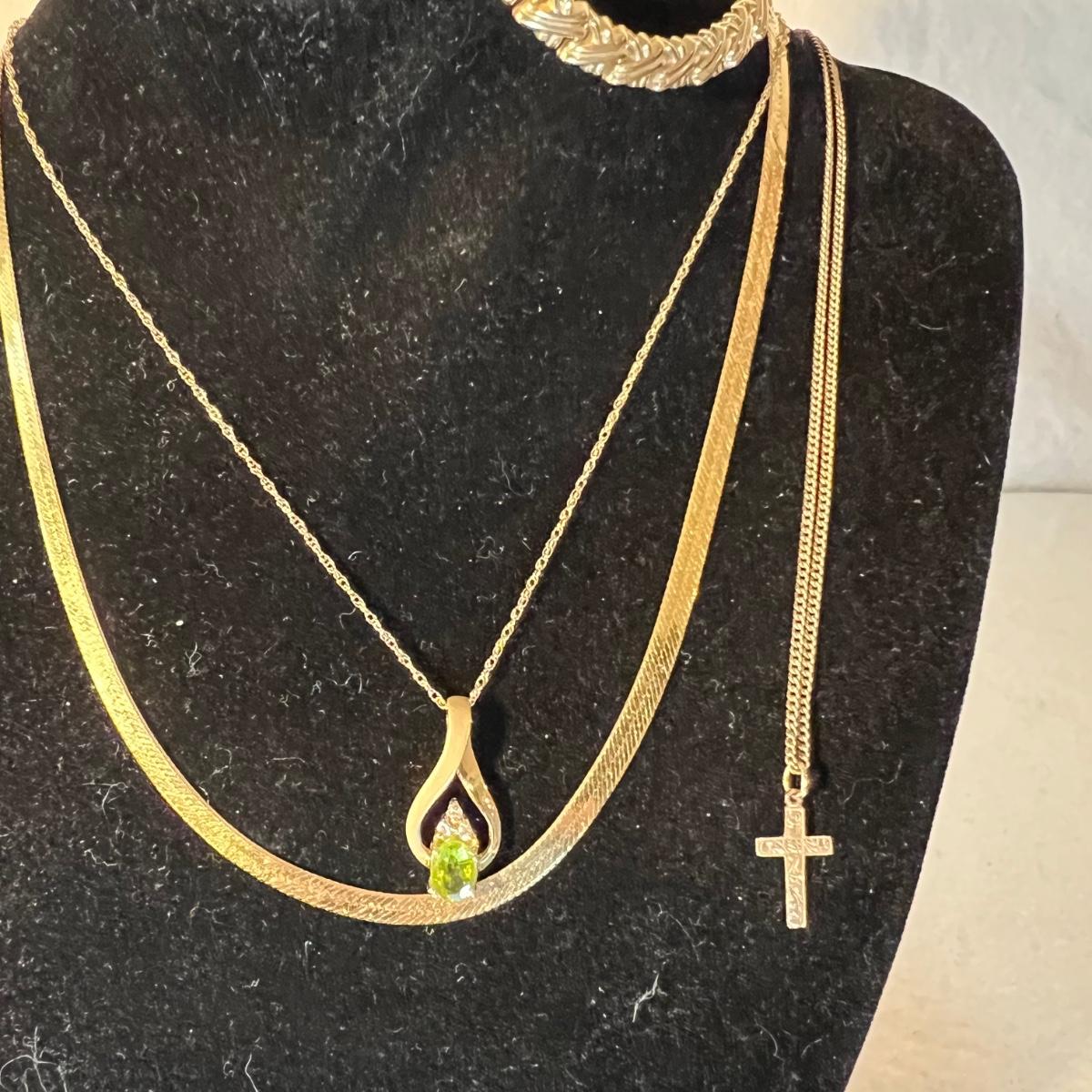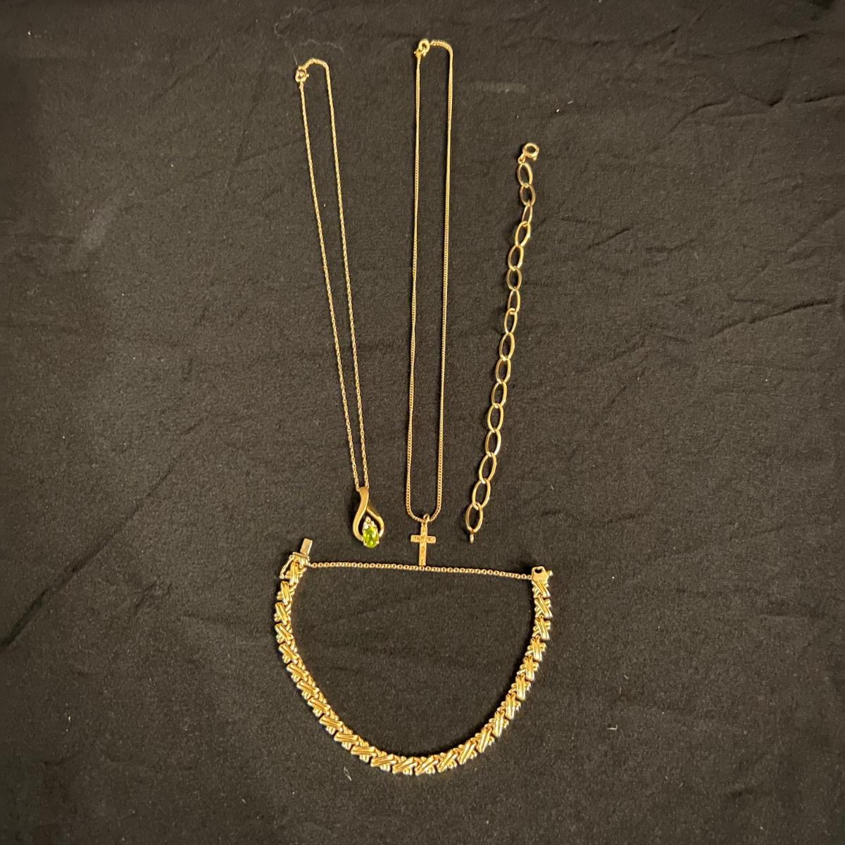 Three necklaces, two bracelets and a pendant with no chain make up this gold lot. All are stamped 14K with the only exception being the chain of the cross pendant, which is marked 10KT. The chain that holds the green stone pendant is the longest measuring 15” long. Please see photos for all markings. All sales are final. No returns or refunds. Please bid accordingly.