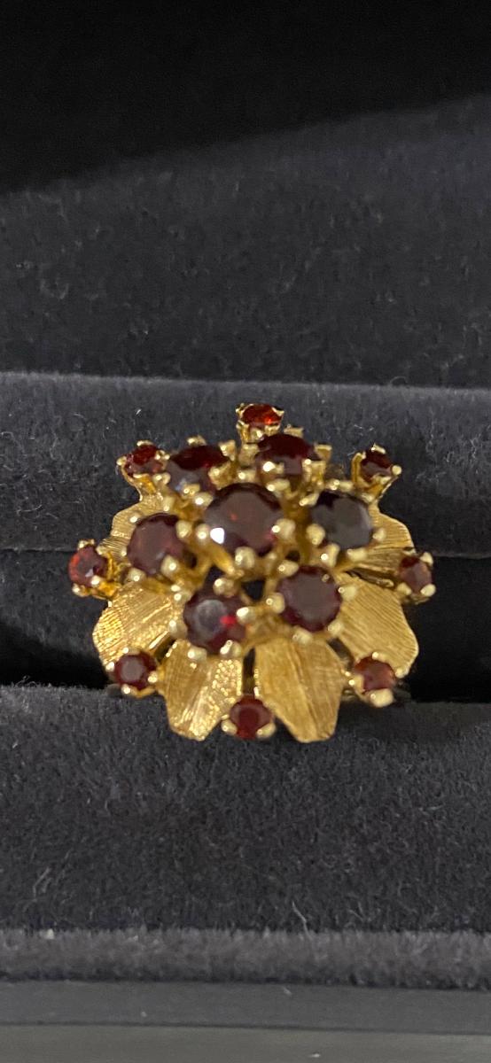 14 karat gold, vintage cocktail ring with flower set with garnets and stamped 14K on the inside of the band, Size 4. Weight 5.2 dwt or 8 grams. The presentation box is not included.