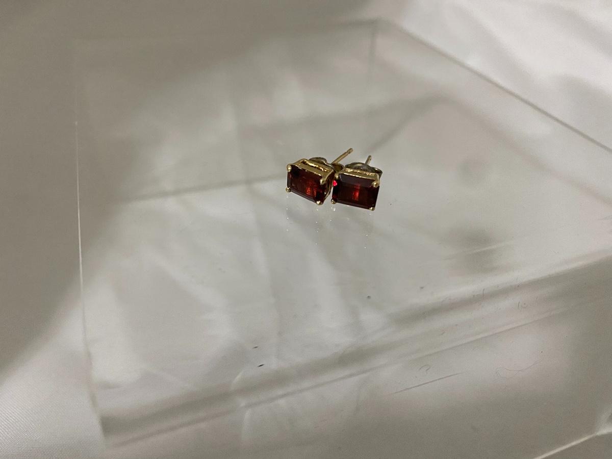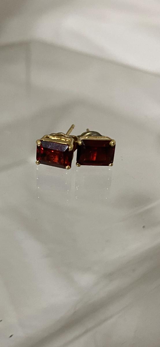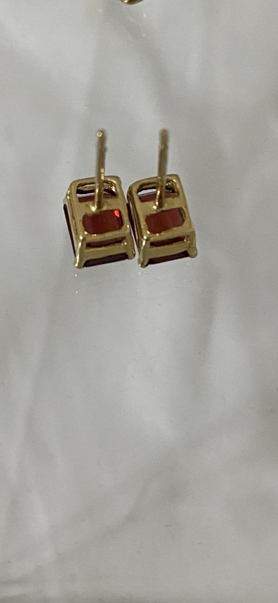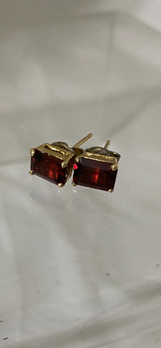 A pair of 14K gold and emerald cut garnet earrings. The posts are stamped 14K. The backings are not gold. The stones measure 1/4 of an inch long. They weigh 1,5 grams