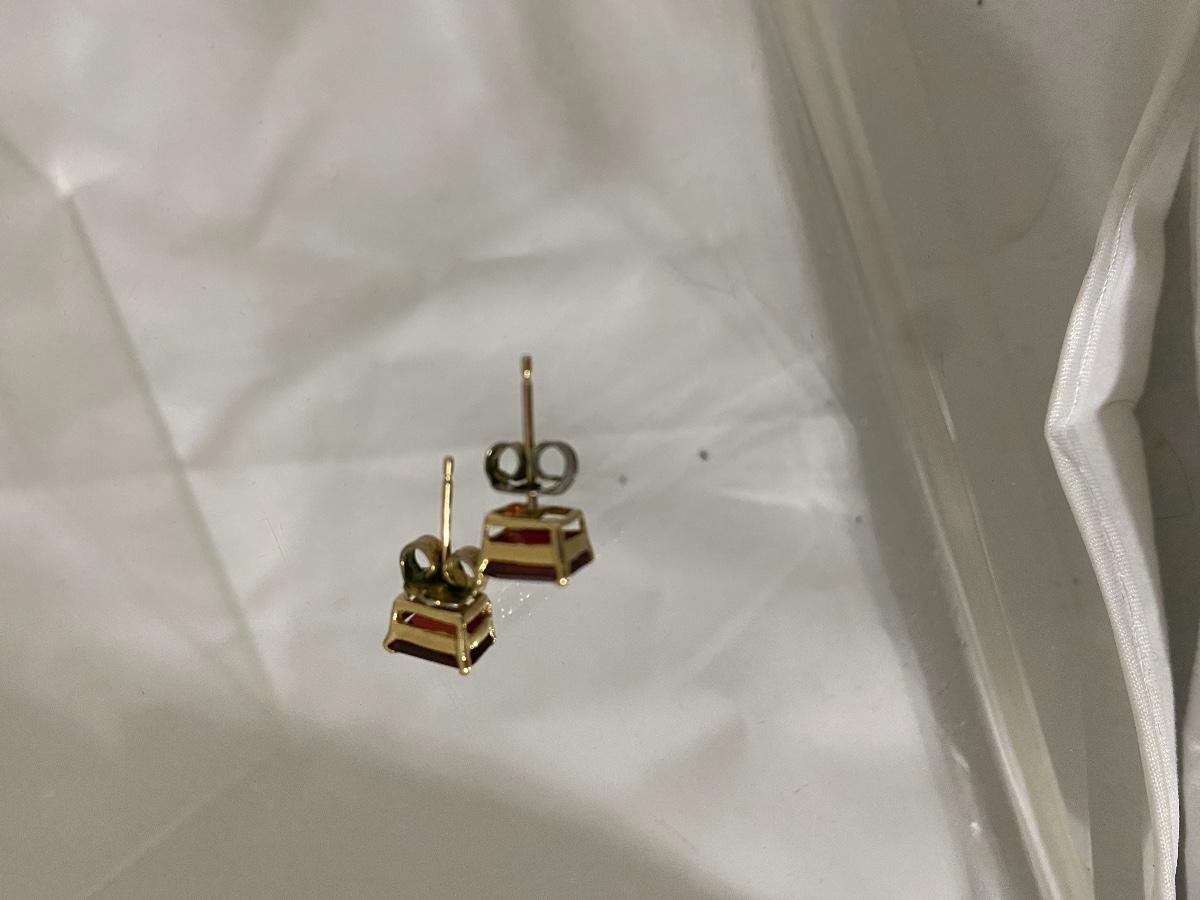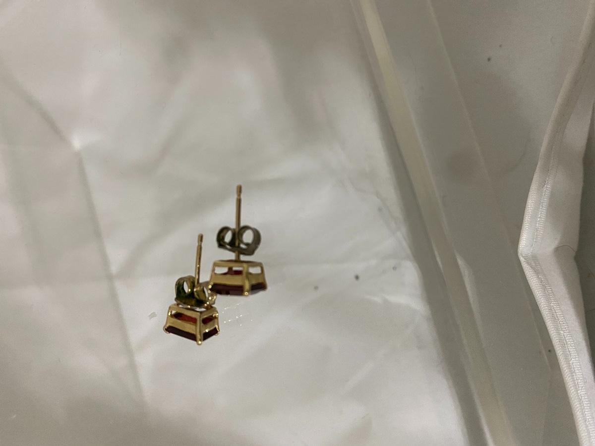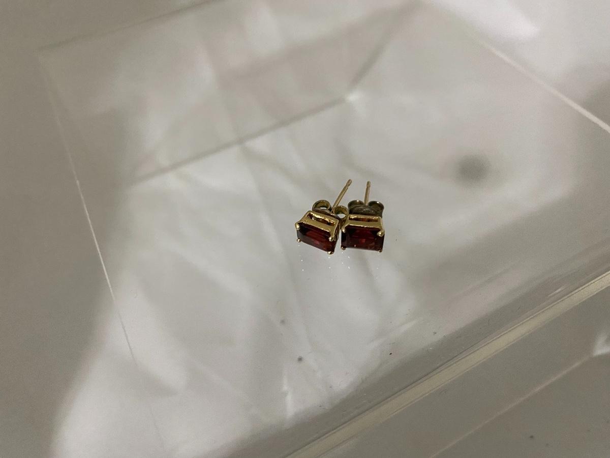 A pair of 14K gold and emerald cut garnet earrings. The posts are stamped 14K. The backings are not gold. The stones measure 1/4 of an inch long. They weigh 1,5 grams