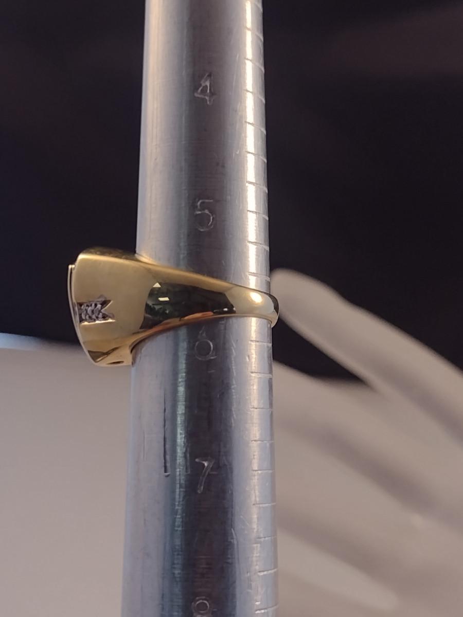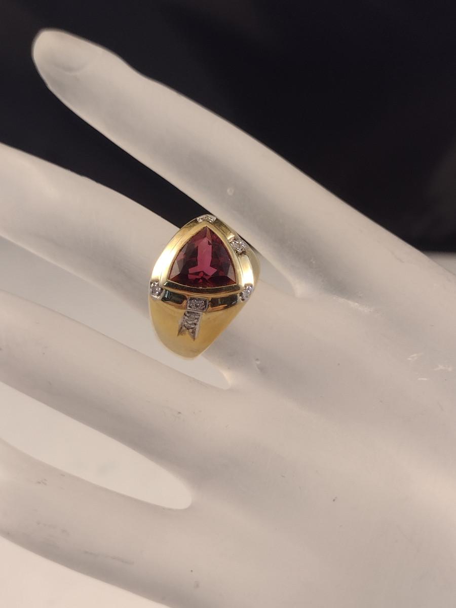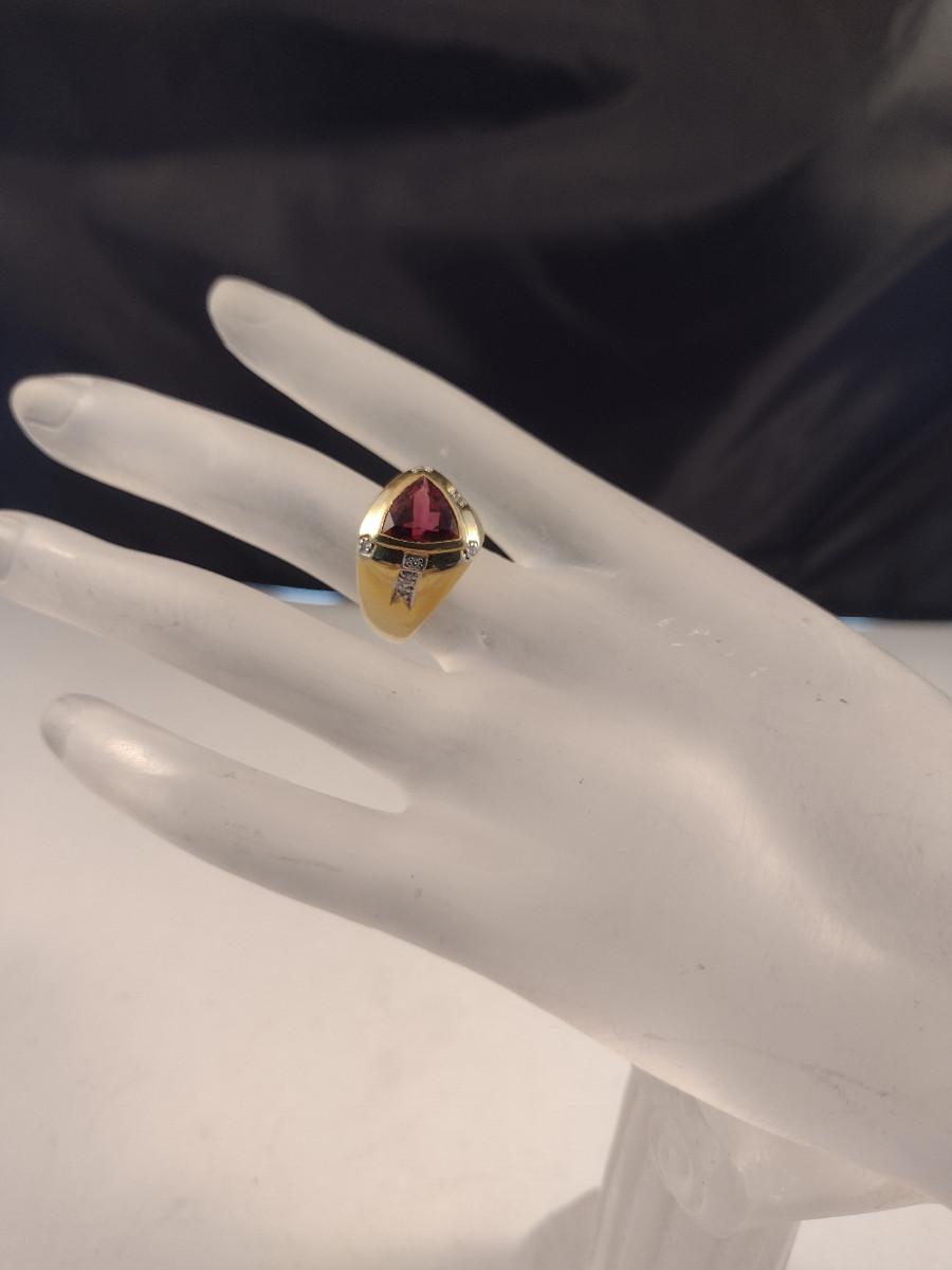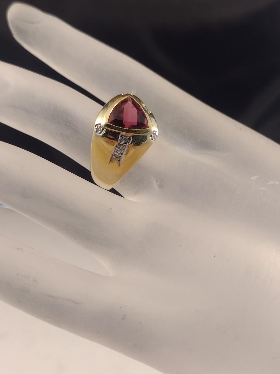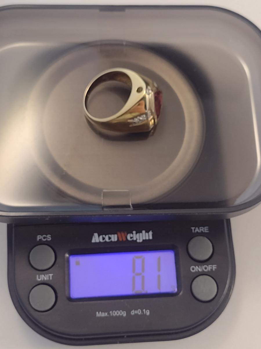 14 Karat Yellow Gold and Gemstone Ring- Size 5 1/2- Approx Weight 8.1 Grams (#1). Possibly garnet gemstone. Small accent stones test as diamonds.