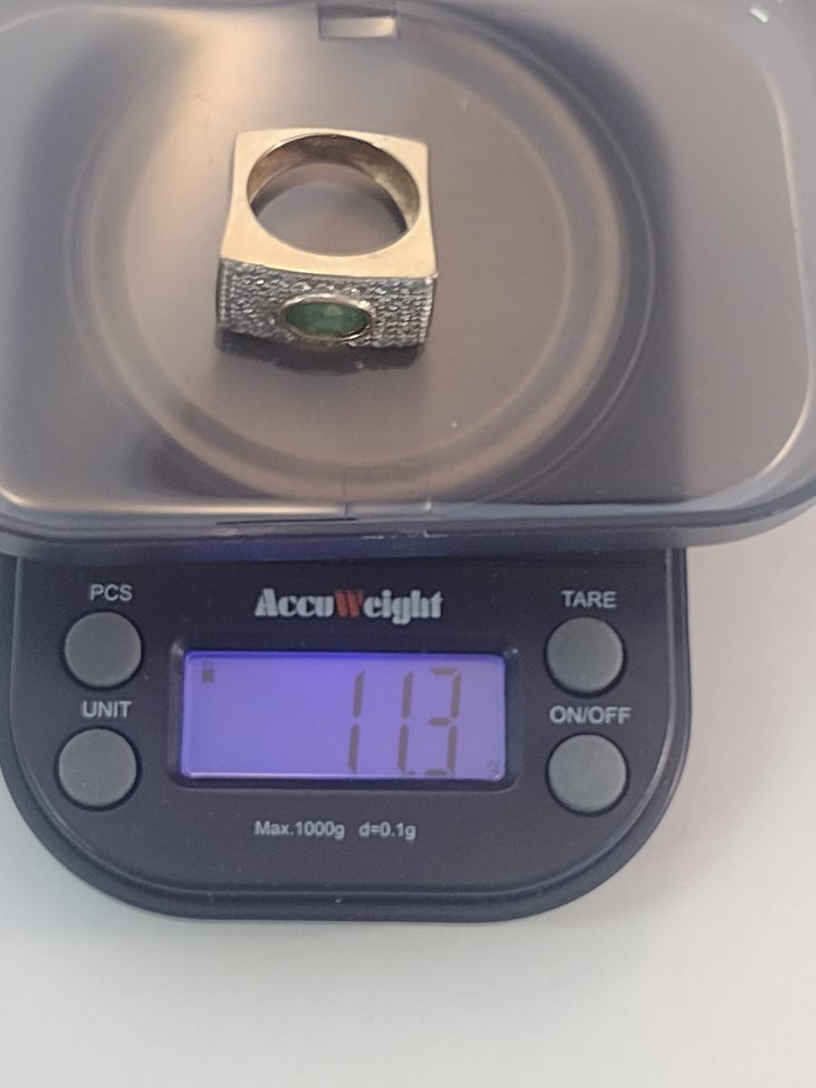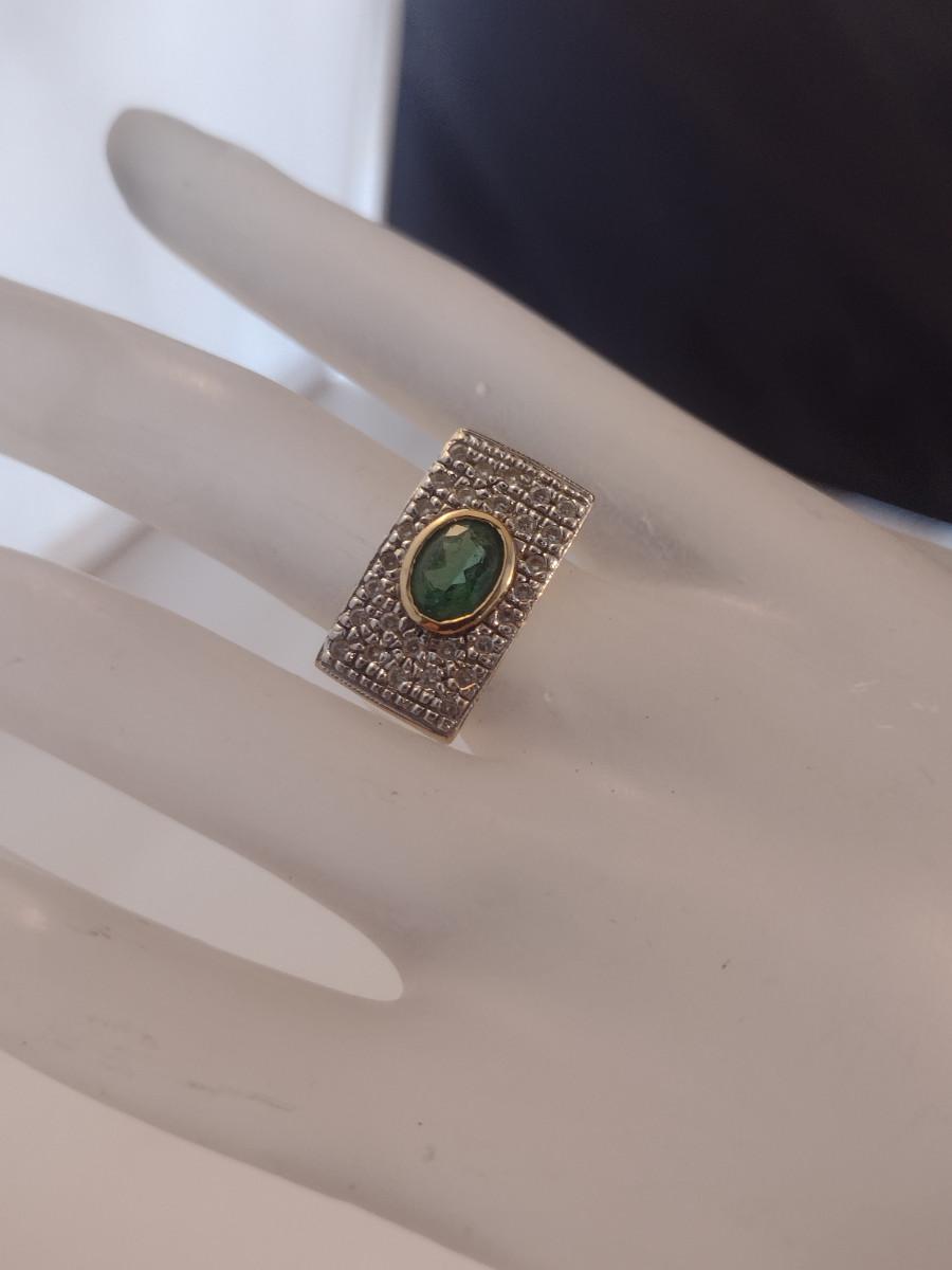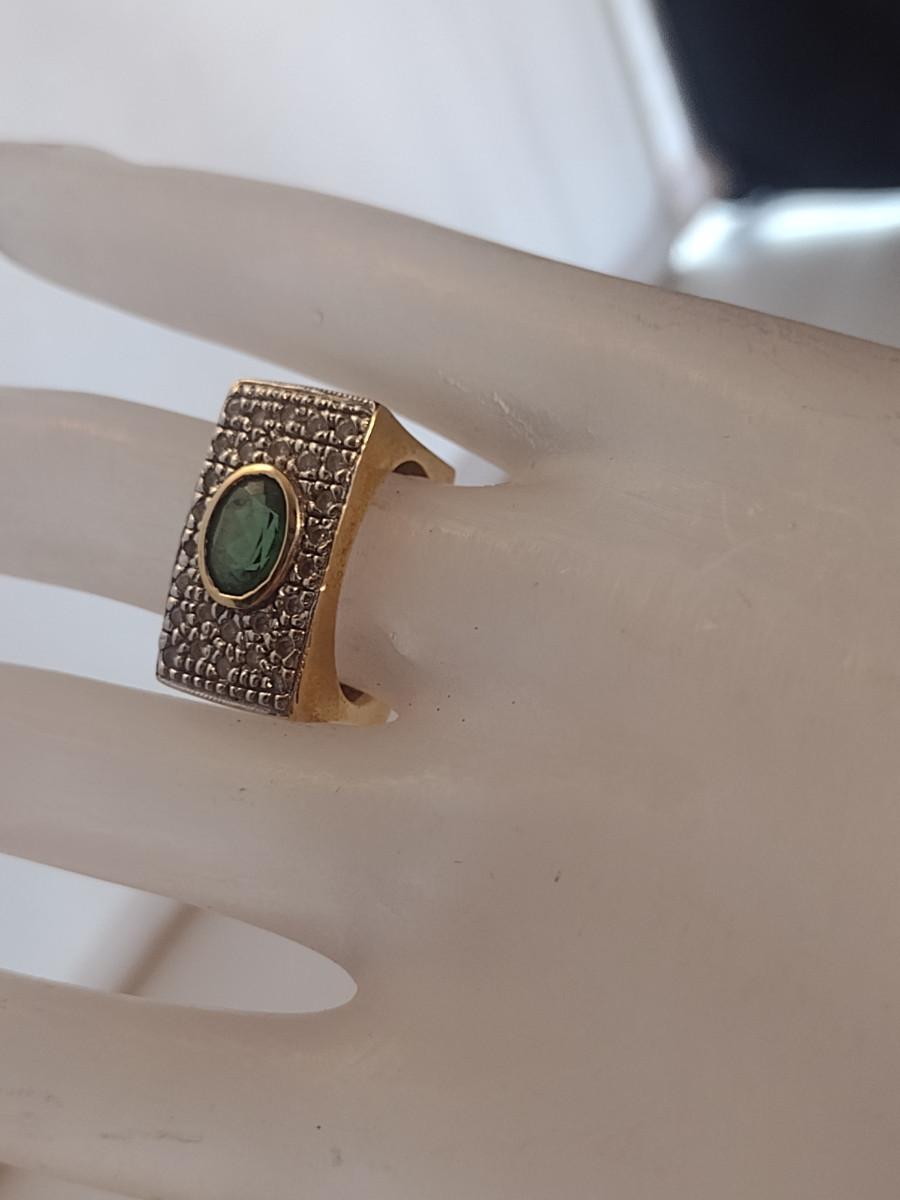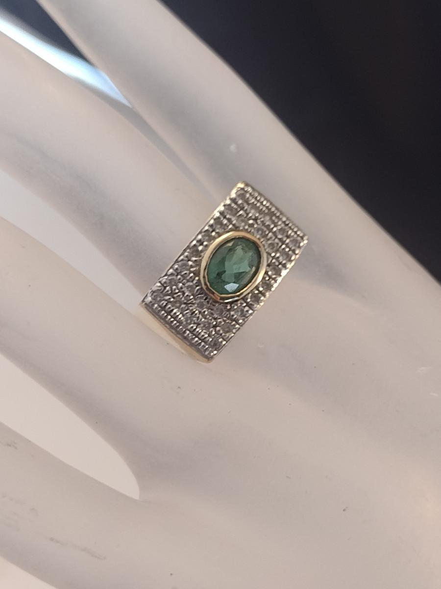 14 Karat Yellow Gold and Gemstone Ring- Size 6 1/2- Approx Weight 11.3 Grams (#8). Possible green tourmaline. Small accent stones test as diamonds.