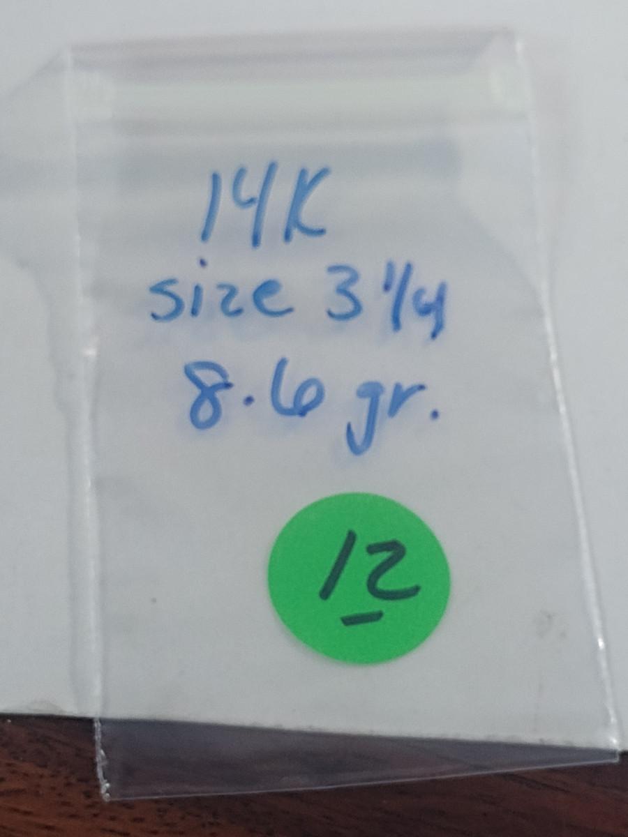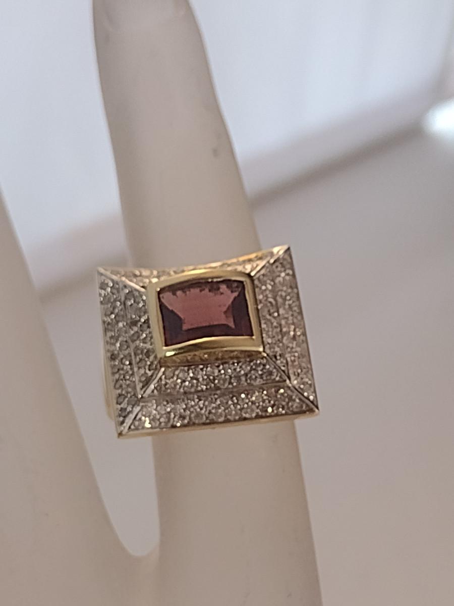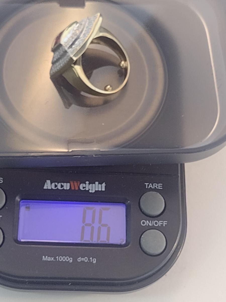 14 Karat Yellow Gold and Gemstone Ring- Size 3 1/4- Approx Weight 8.6 Grams (#12). Possible garnet gemstone. Item has sizing beads installed on band.